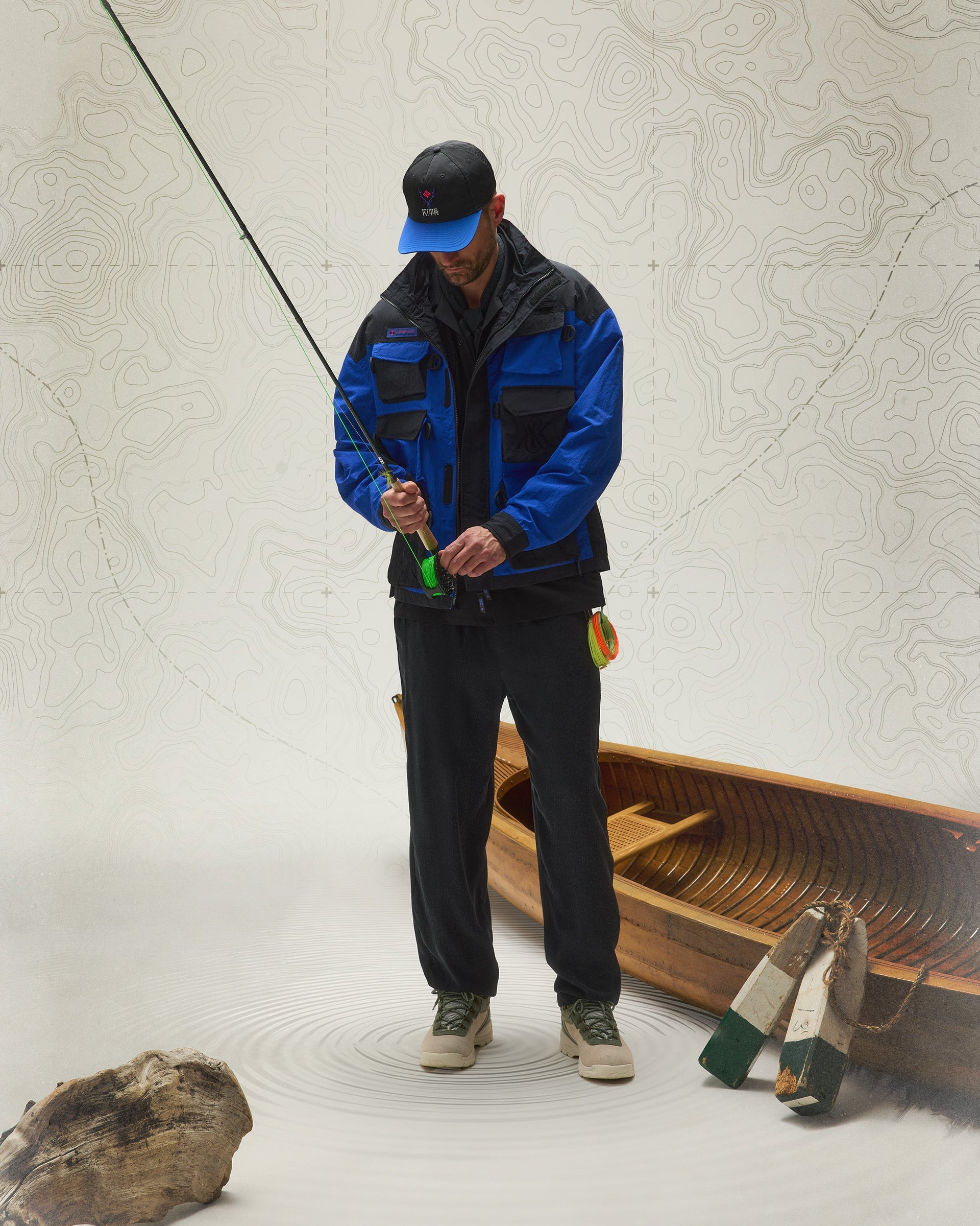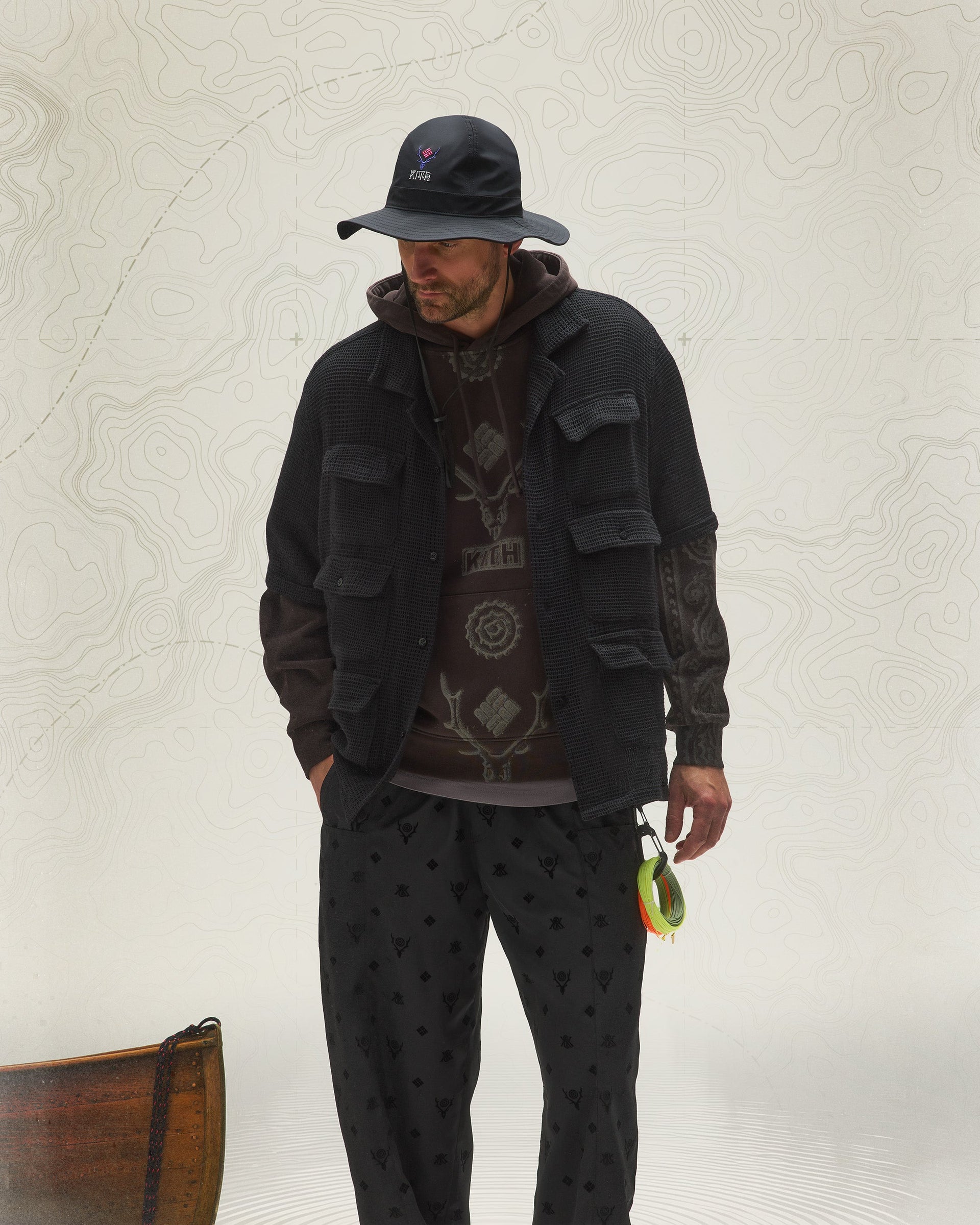 Kith & South2 West8 for Columbia headwear highlights a variety of tri-branded styles—featuring the Nylon Pinch Crown, Aaron Cap, Crusher Hat and Dawson Bucket Hat, all made from lightweight materials.