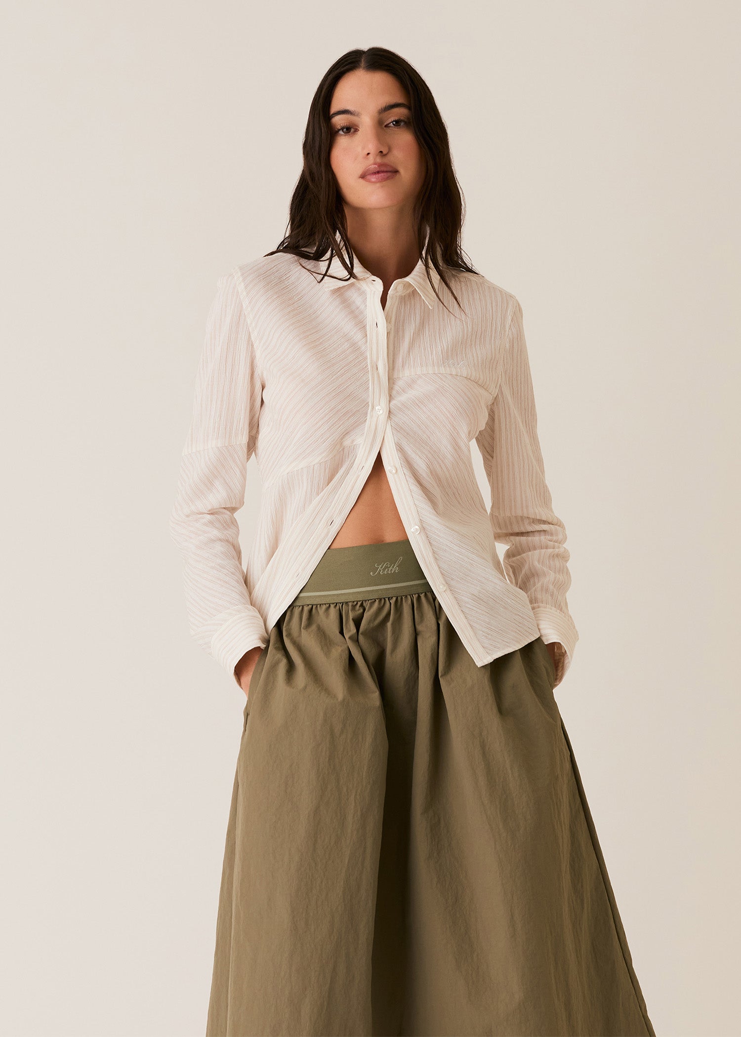 Making its entrance this season is the Nadine Maxi Skirt—a long silhouette made from heavy-washed nylon with tonal Kith Script at the waistband. The offering is complete with the Estella Maxi Skirt in seersucker and the Miren Five Pocket Pant in bonded microsuede.