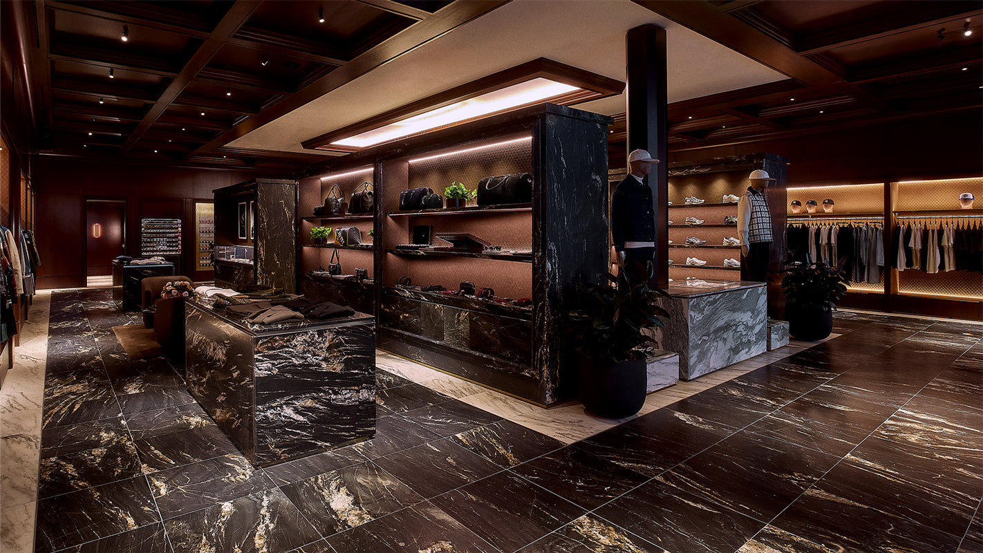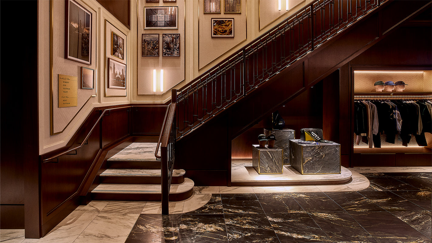 Visitors are surrounded by dark walnut millwork and a coffered ceiling when they enter the first floor of the space, housing Kith, additional brands, and footwear for men. There is Belvedere flooring complete with Montclair Danby marble bordering and apparel niches lined with custom K&K Crest embossed velvet and leather wallcovering. Displayed prominently along the center of the store are monolithic Belvedere caseworks displaying Kith’s lifestyle accessories, and jewelry on one side. On the opposite side features Men’s footwear accompanied by custom Mark Jupiter walnut benches.