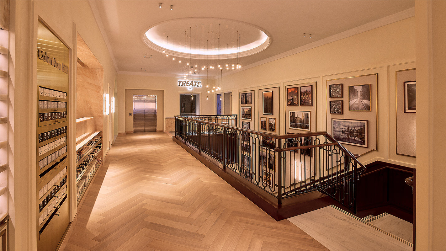 Ascend the statement staircase made of the same dark walnut and Montclair Danby marble found on the steps as the main space to enter the second floor—warmth and hospitality speaks loudest at the stairs, especially with the large gallery wall made of custom K&K wallcovering panels and dark walnut wainscotting, softened with plaster. The gallery wall features over thirty curated photographs from Chicago-based artists showcasing the city’s beautiful cityscape and textures.