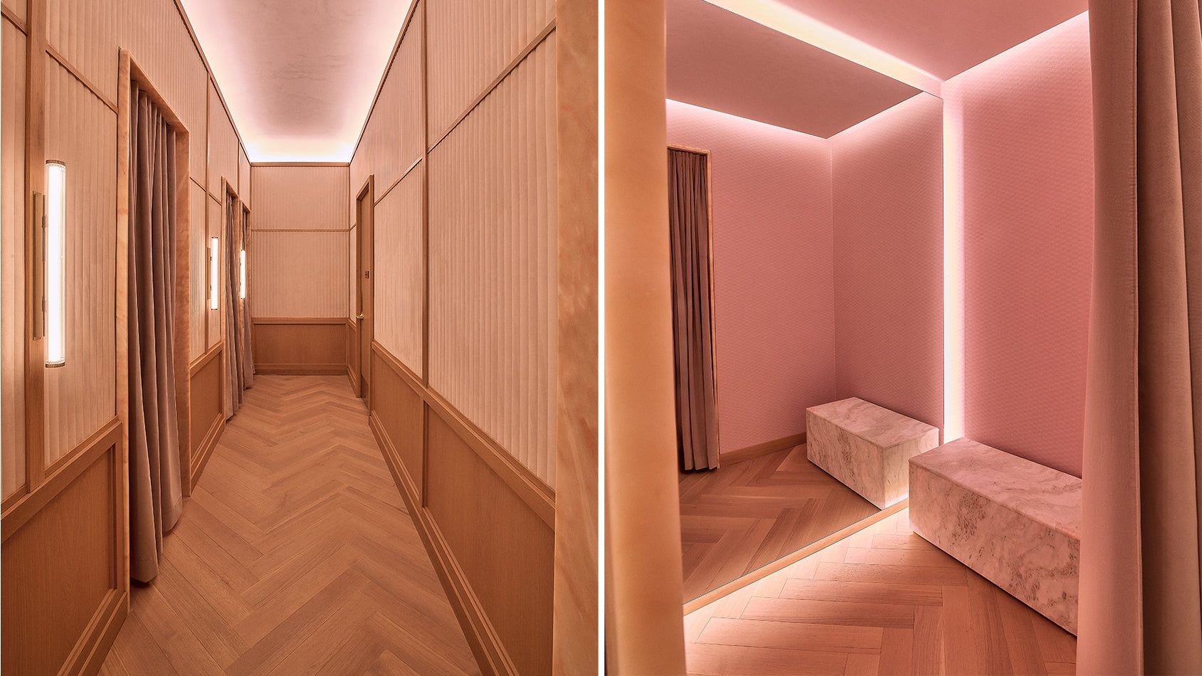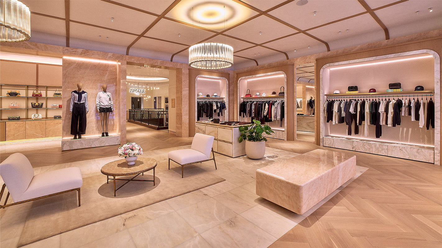 The second floor is dedicated to Kith Women, additional women’s brands, footwear, and Kith Kids, featuring a lighter space that contrasts the men’s floor. Adorning the top of the staircase is a custom chandelier centerpiece consisting of over thirty-times individual pendants hanging in a helix formation, captivating guests and evoking a new feeling upon entering into the women’s space. Visitors are charmed with the oak trimmed lime wash ceilings, Rosa Aurora Macchia Vecchia marble lined walls, and Rosa Aurora floor inset with an oak herringbone band. The apparel niches along the perimeter of the room are made of custom oak millwork embellished with Verde Jasmine marble frames. Displayed against the large store front windows is Women’s footwear and just opposite of it is a room dedicated to Women’s handbags and accessories.
