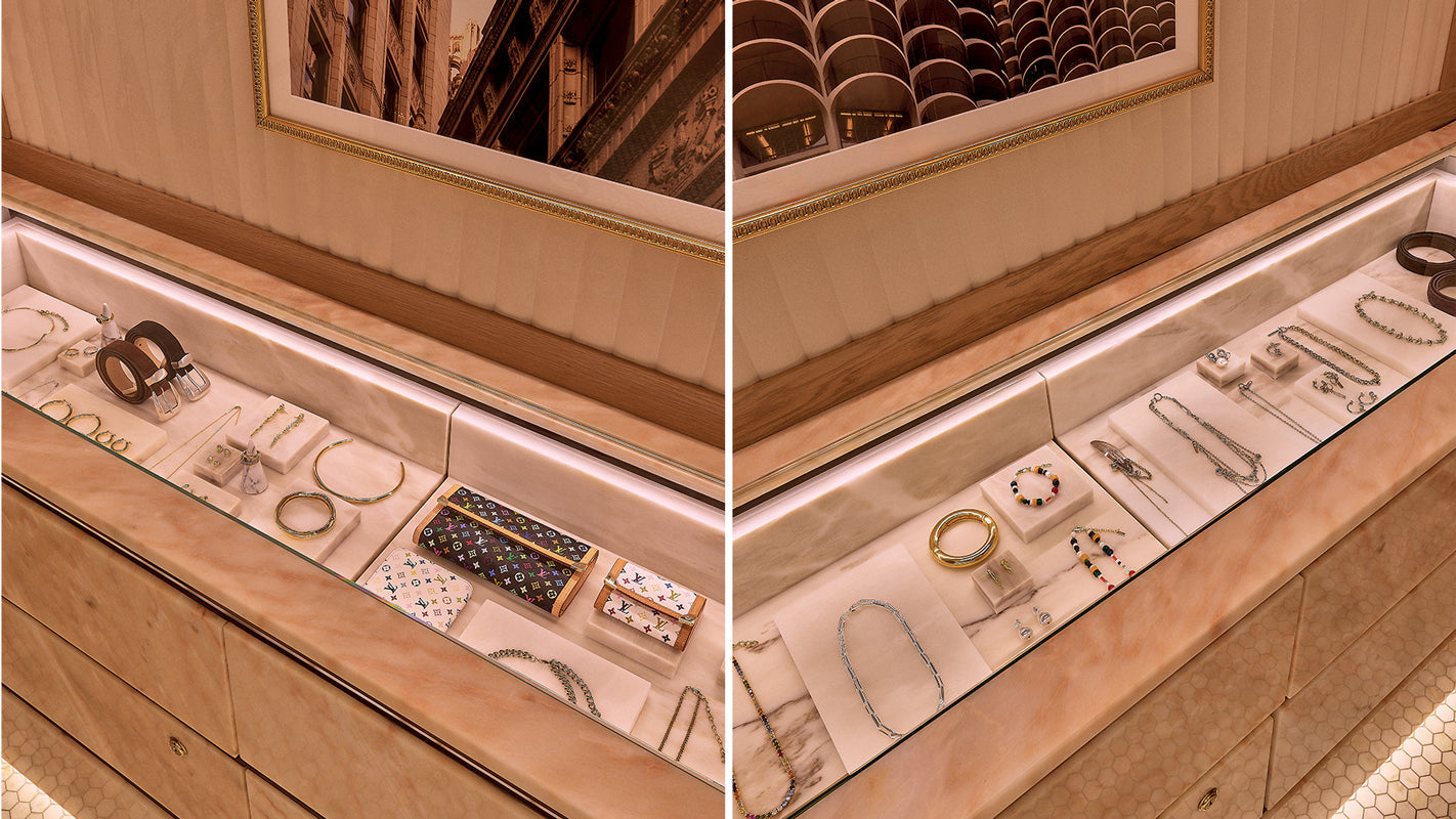 The Women’s Accessories Room is an intimate, soft space lined with tufted wallpaper, custom Rosa Aurora Macchia Vecchia jewelry vitrines and handbag display, and a mosaic tile floor. Throughout the store, guests will find a few more intimate spaces like this, such as the Kid’s Room—distinguished by its signature cloud motif archway and multi-colored stone flooring. And lastly, Kith Treats is found across the way with dedicated seating, the perfect last stop for visitors to take a beat and enjoy the view of the store.