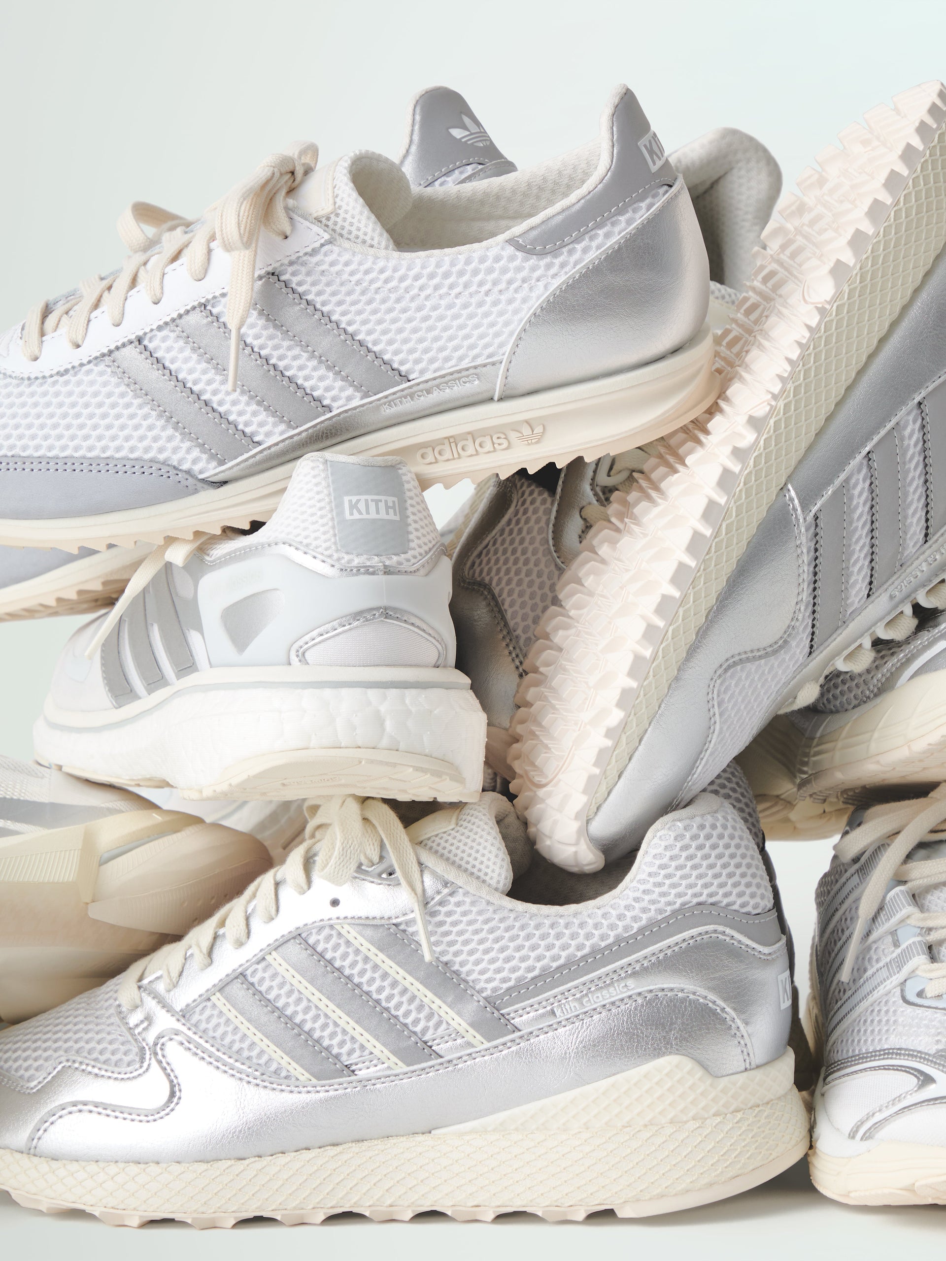 Each model reflects the technological progress of its era—from the lightweight build of the SL 72 to the race-day engineering of today’s Adizero Boston 13—showcasing adidas Running’s legacy. Each shoe has a mesh upper with smooth leather overlays and metallic applique detailing that nod to archival design language. Select silhouettes feature multi-color hits on the medial, and all are complete with Kith branding on the tongue, heel, and sockliner. This collaboration is complete with custom packaging, and a commemorative co-branded runner’s bib that denotes the release year of each style.