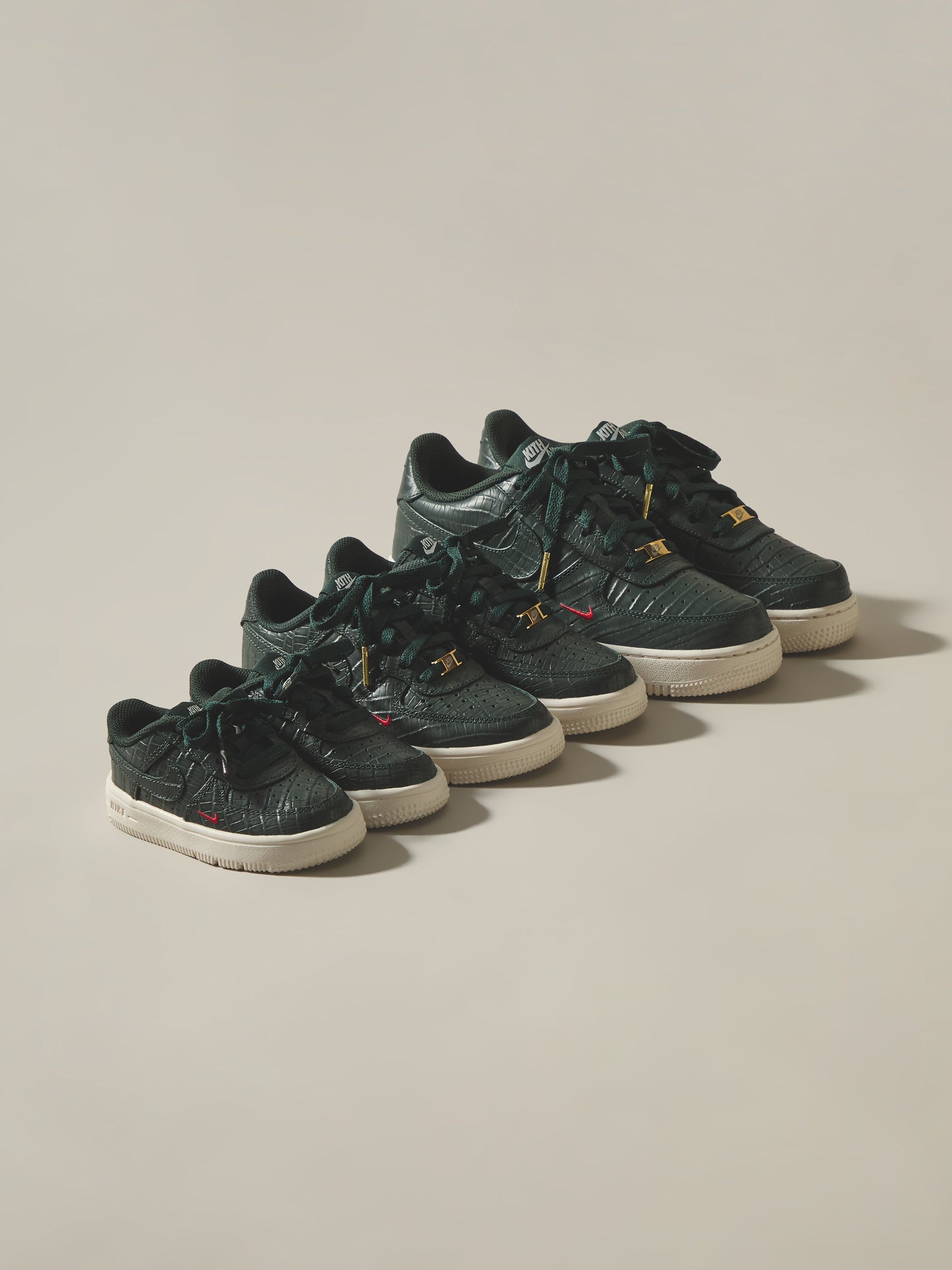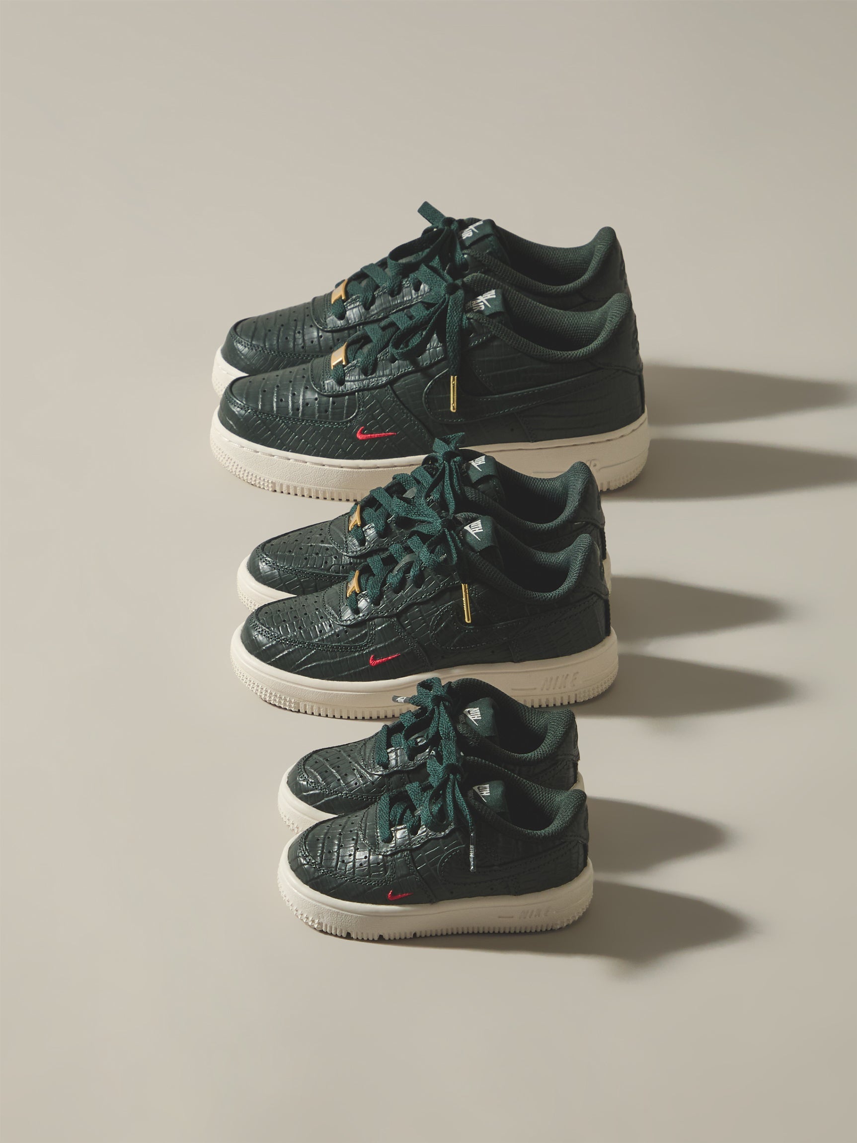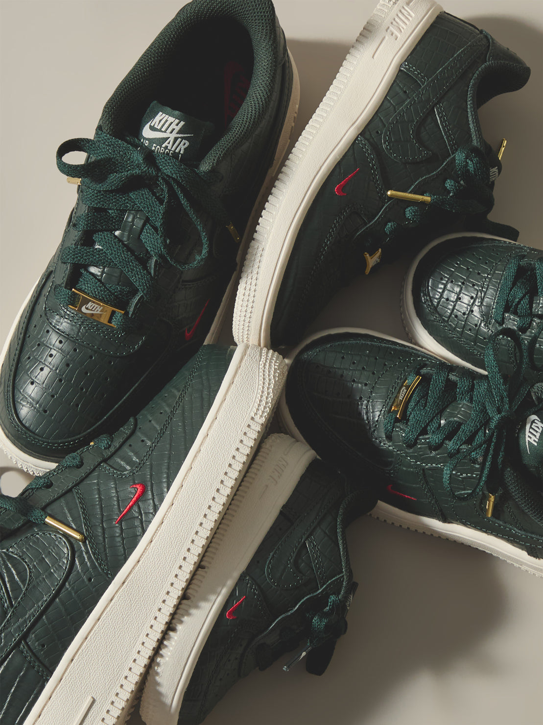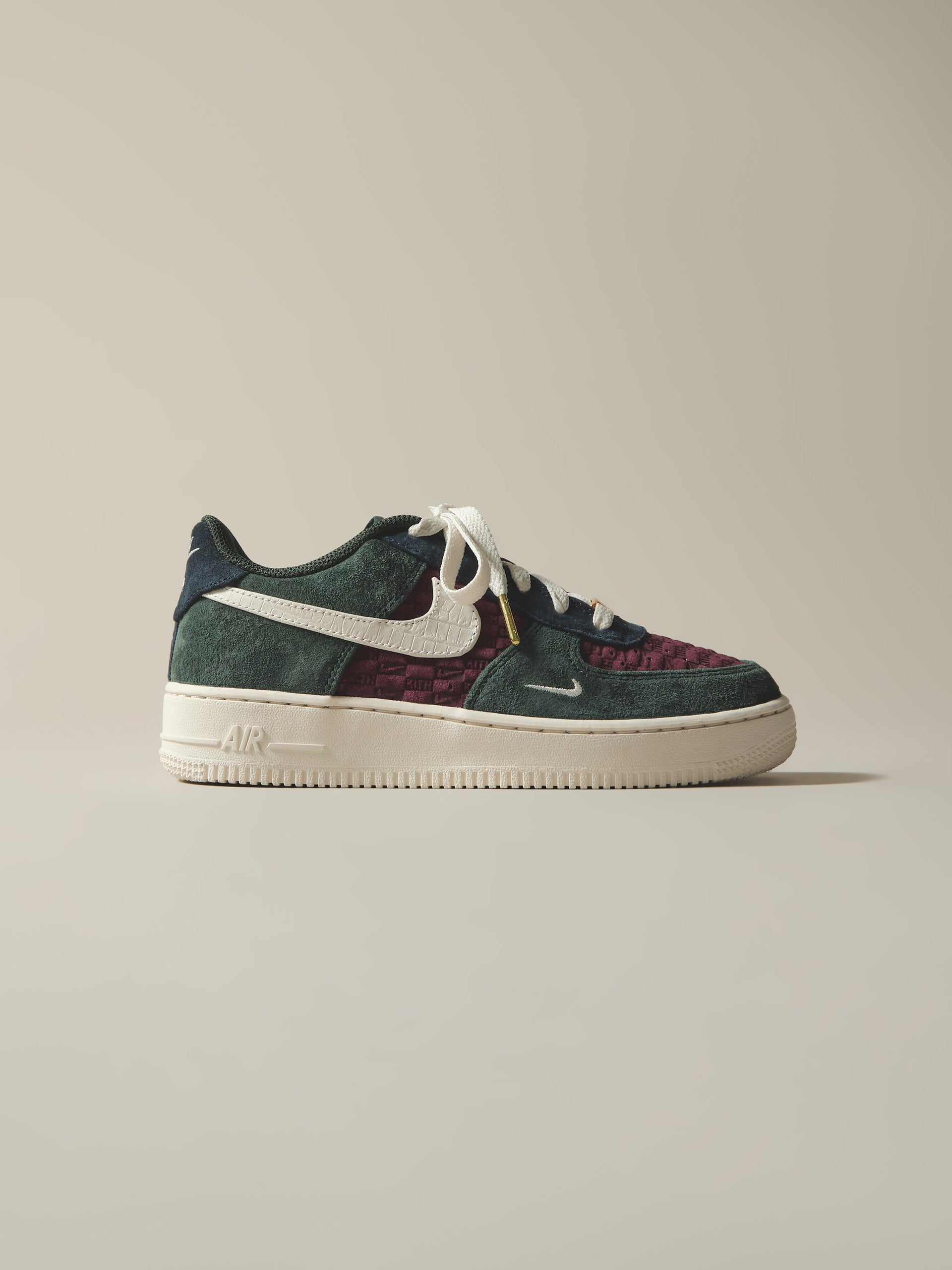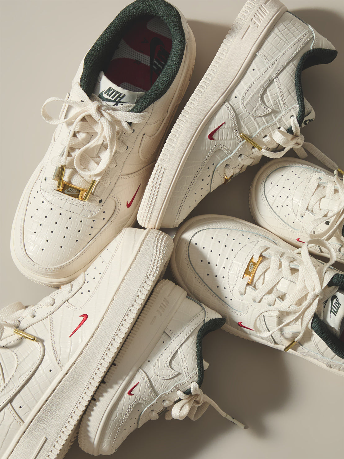 The Air Force 1 is featured in three hues and Toddler, Pre-School, and Grade School sizing—one pigskin suede iteration in colors drawn from the Kithmas Palette, and two crocodile embossed leather colorways, Phantom Green and White. The color-blocked suede silhouette features Kith and Nike debossed monogramming at the toebox and quarter panels, Kith and Nike Swoosh co-branding at the tongue, footbed, and heel, and all three have gold accents with the lace aglets and custom co-branded dubrae.