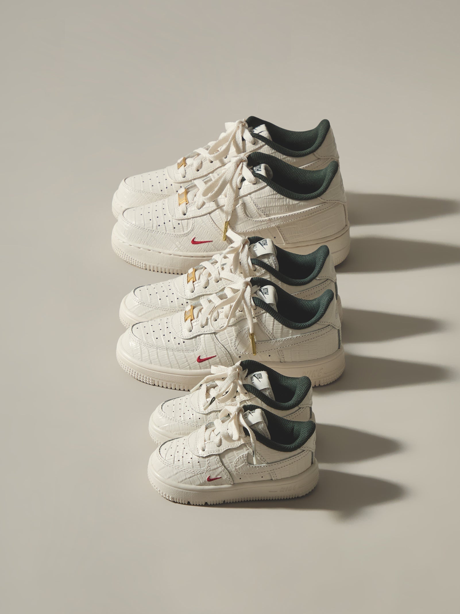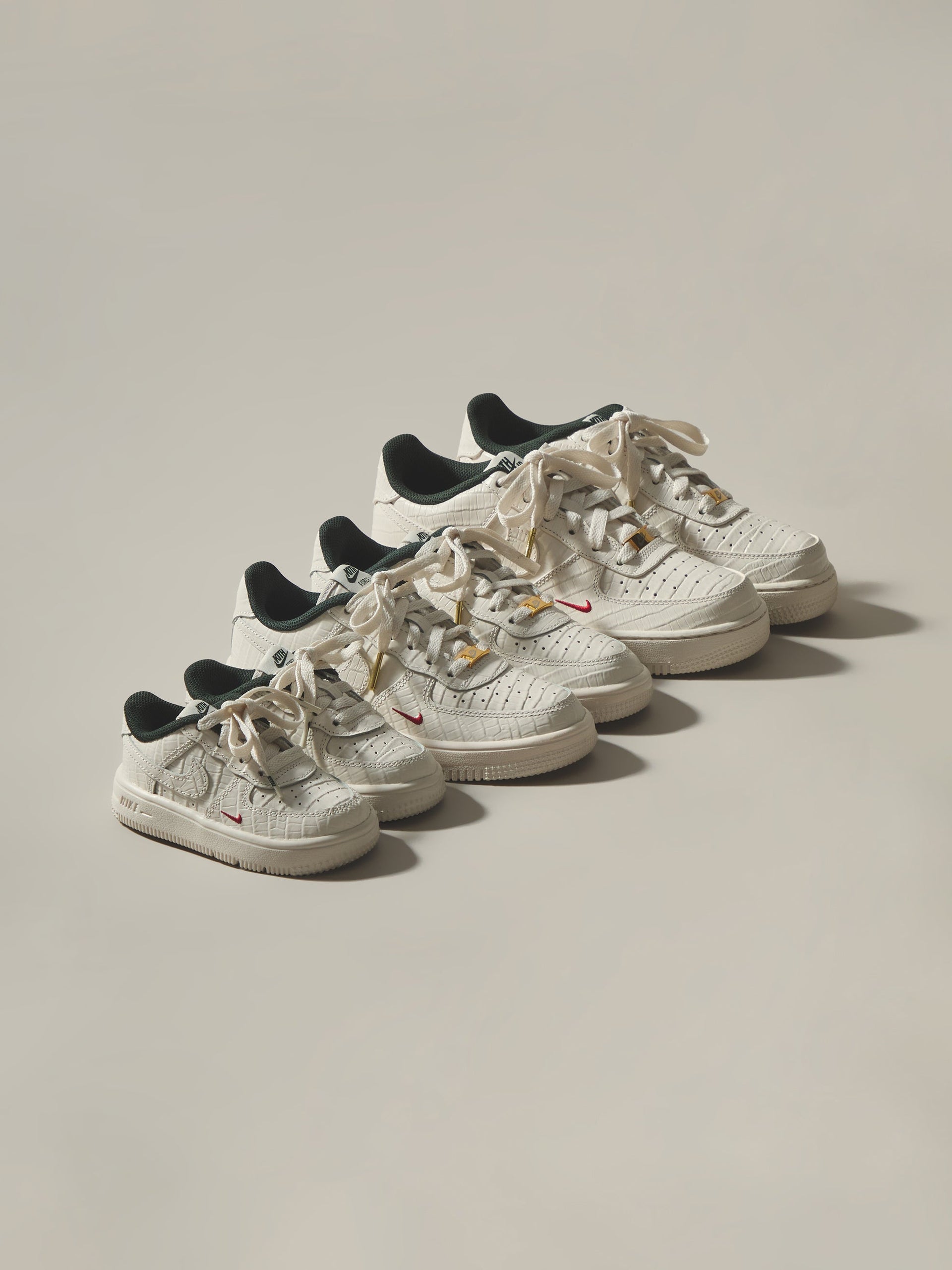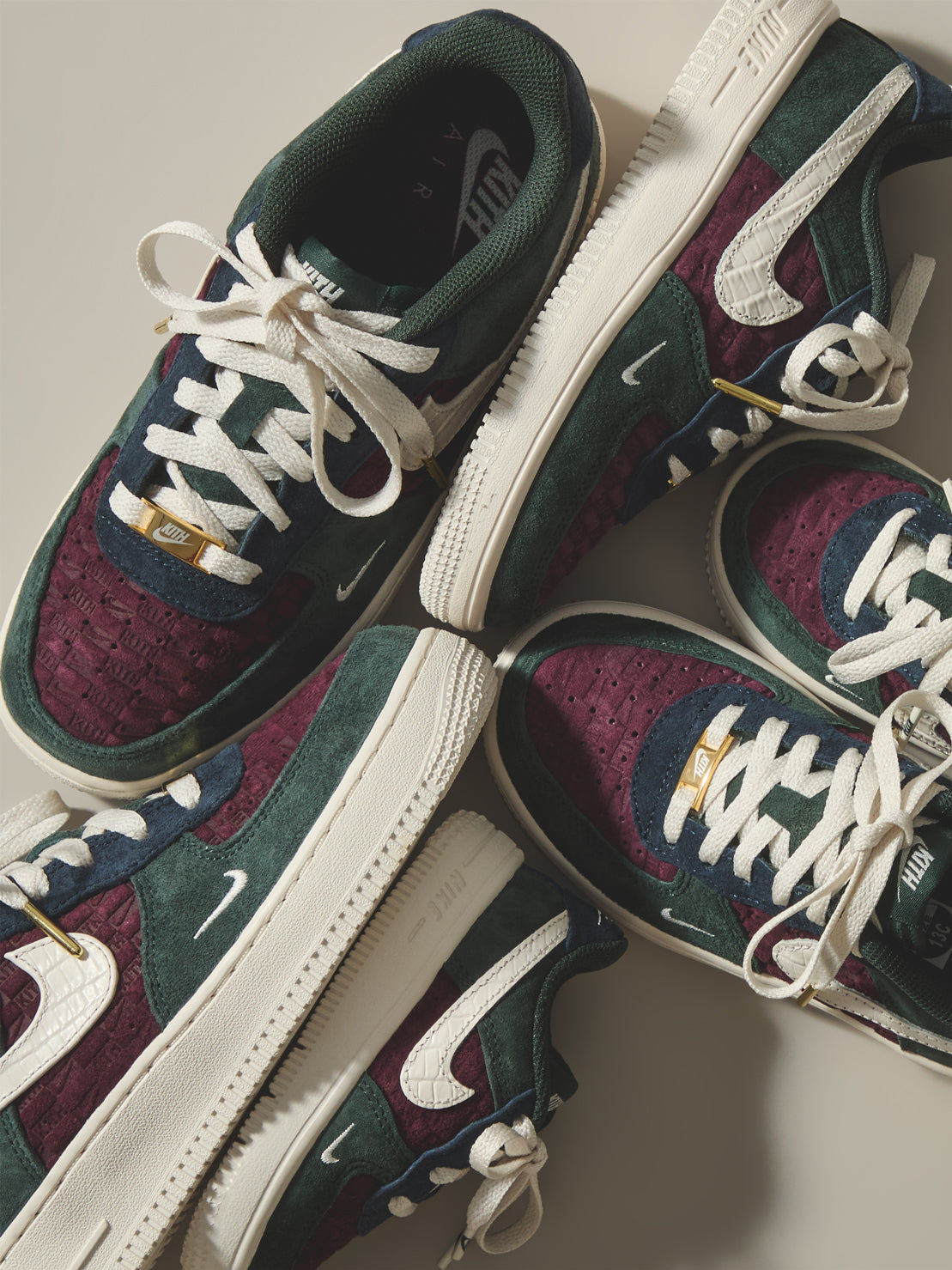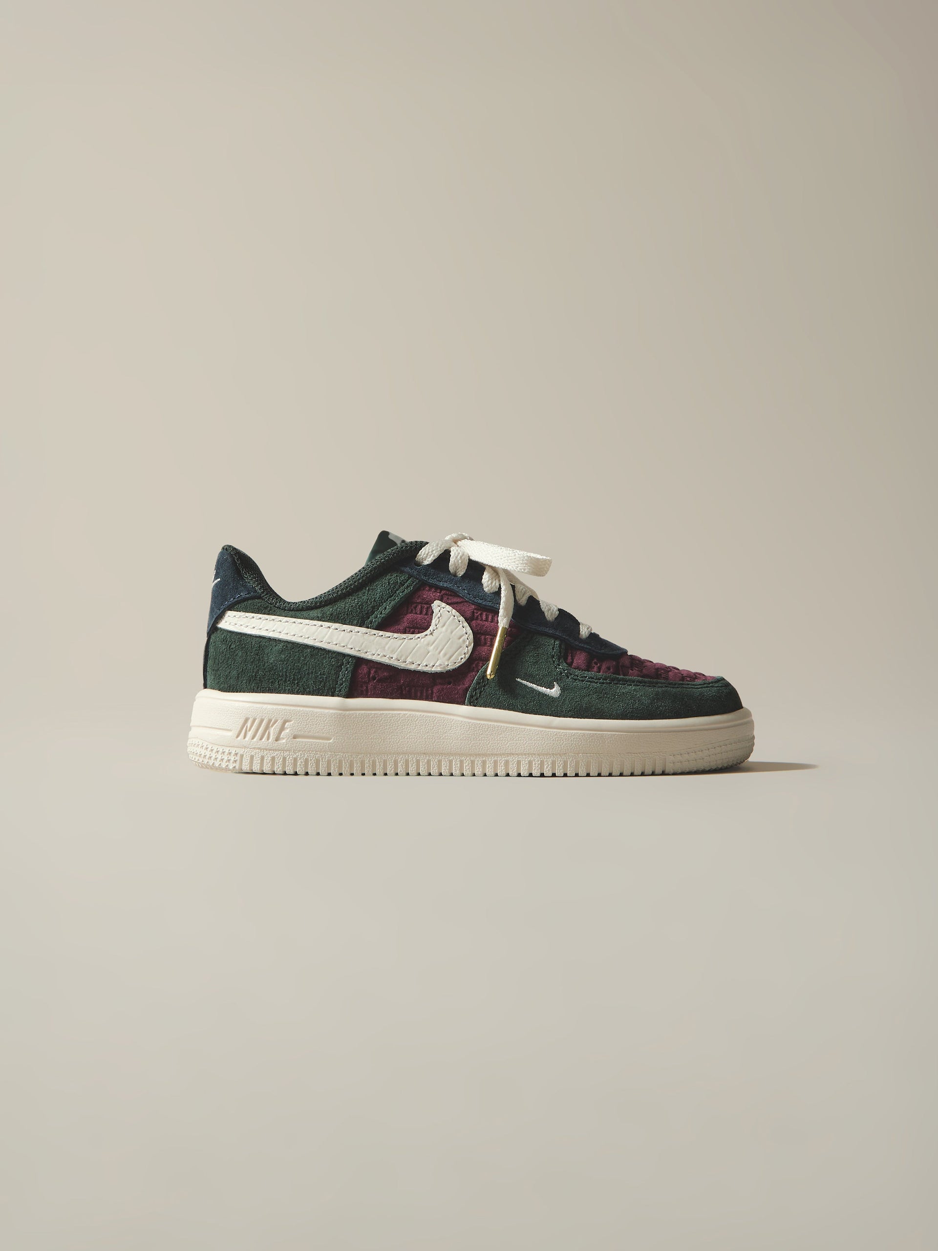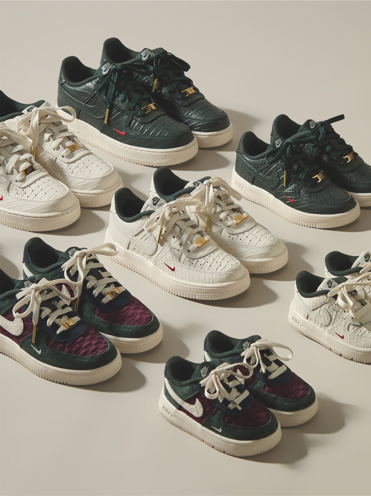The Air Force 1 is featured in three hues and Toddler, Pre-School, and Grade School sizing—one pigskin suede iteration in colors drawn from the Kithmas Palette, and two crocodile embossed leather colorways, Phantom Green and White. The color-blocked suede silhouette features Kith and Nike debossed monogramming at the toebox and quarter panels, Kith and Nike Swoosh co-branding at the tongue, footbed, and heel, and all three have gold accents with the lace aglets and custom co-branded dubrae.