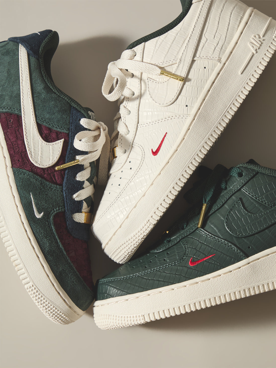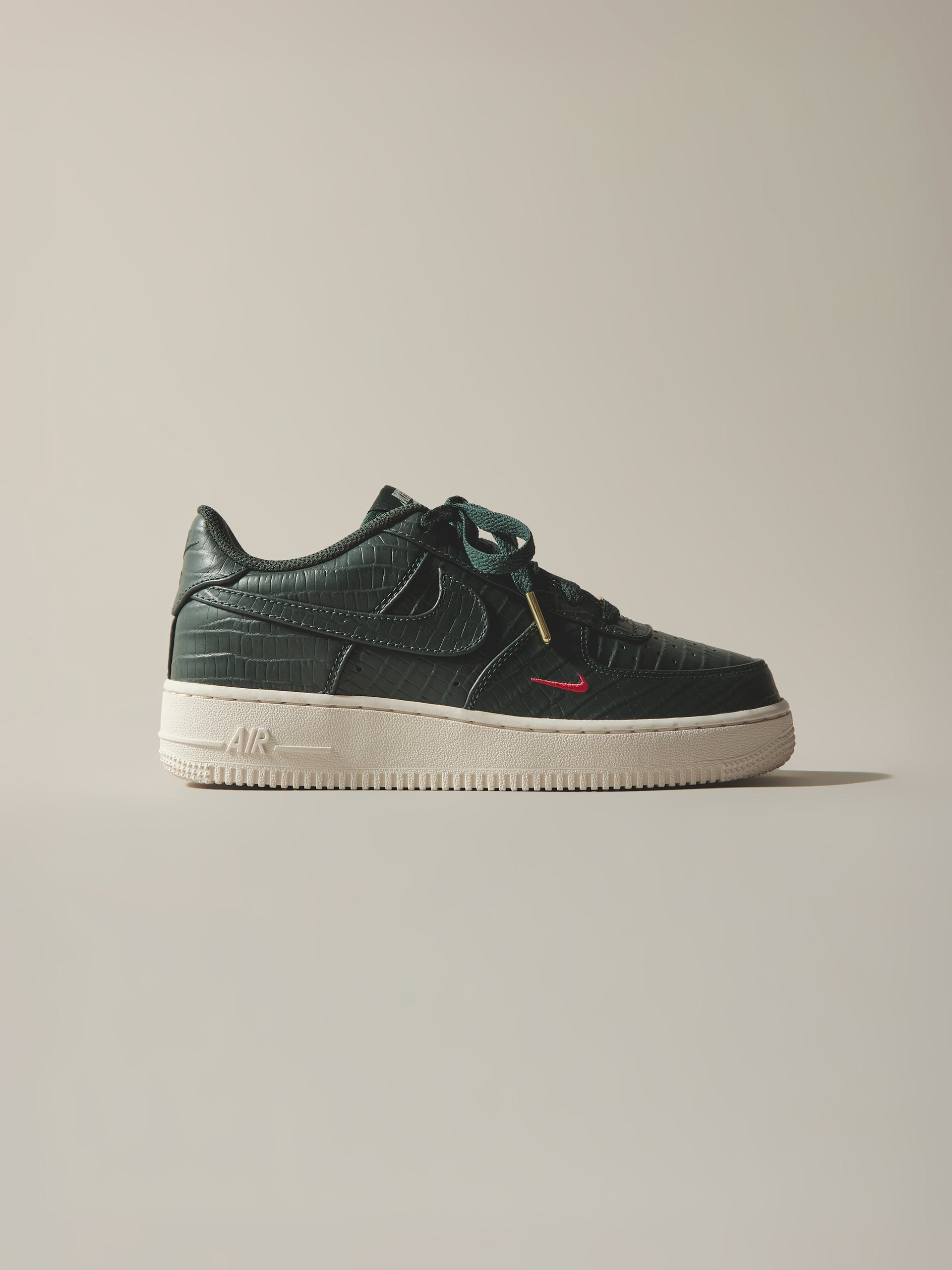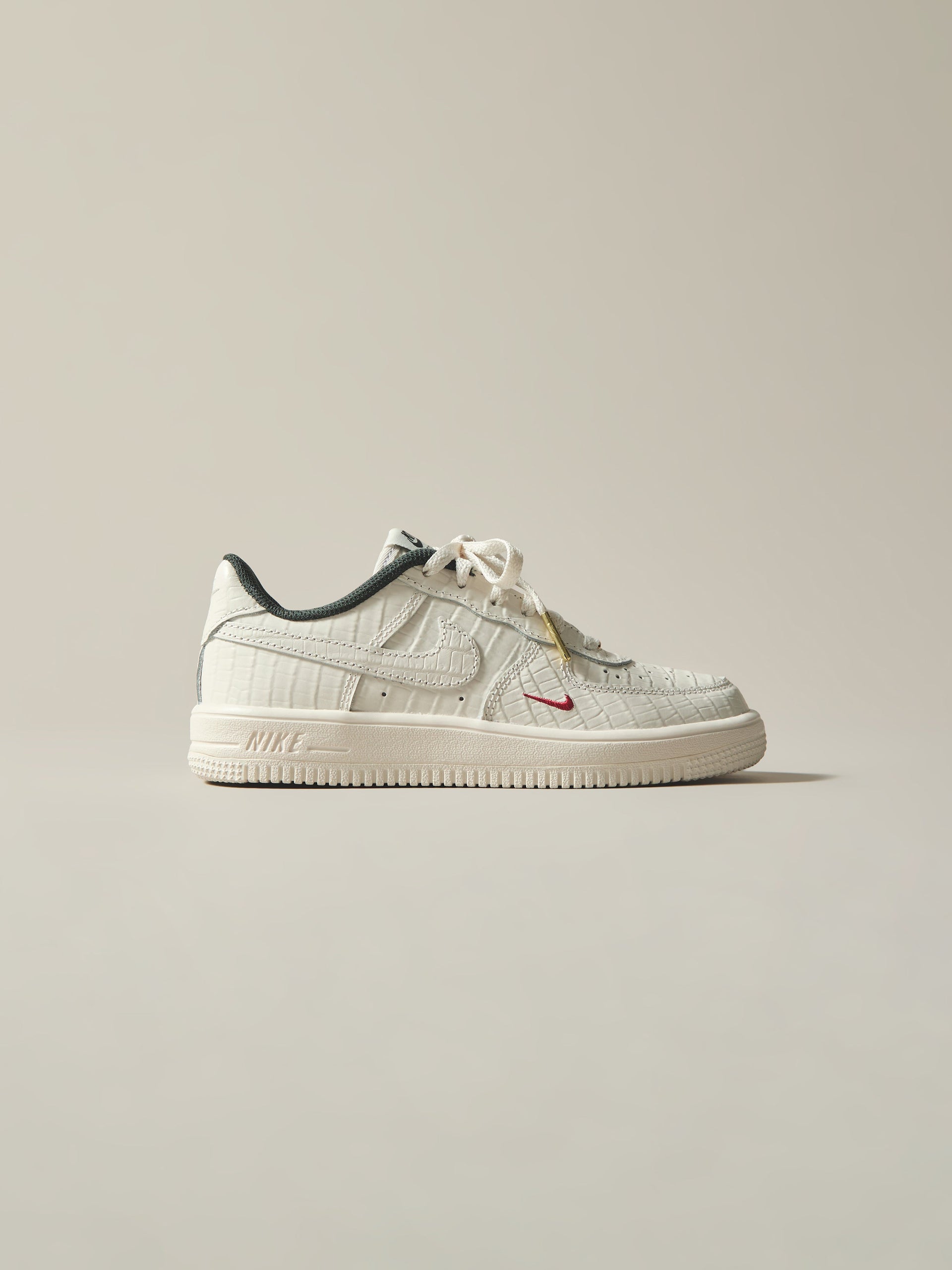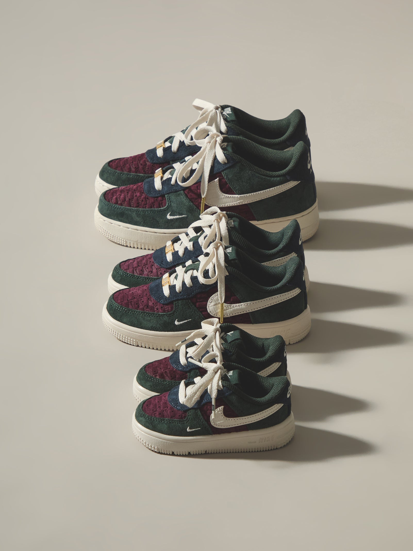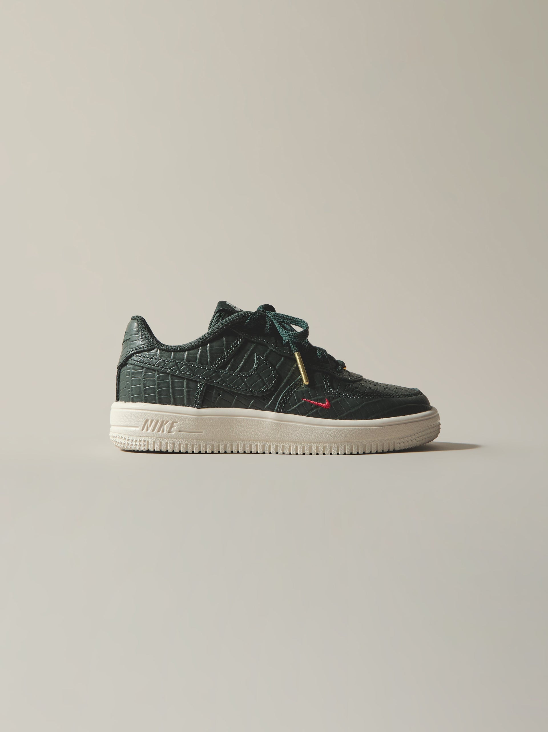 The Air Force 1 is featured in three hues and Toddler, Pre-School, and Grade School sizing—one pigskin suede iteration in colors drawn from the Kithmas Palette, and two crocodile embossed leather colorways, Phantom Green and White. The color-blocked suede silhouette features Kith and Nike debossed monogramming at the toebox and quarter panels, Kith and Nike Swoosh co-branding at the tongue, footbed, and heel, and all three have gold accents with the lace aglets and custom co-branded dubrae.