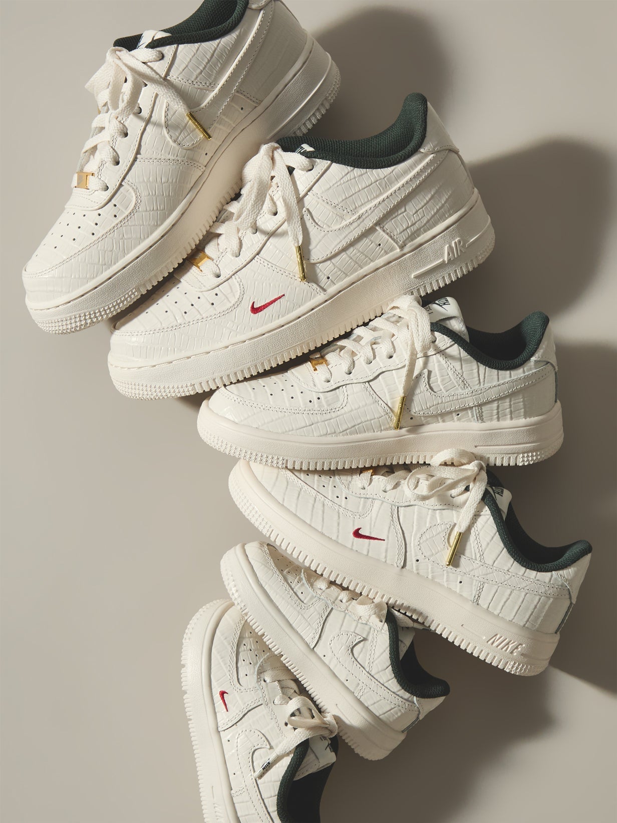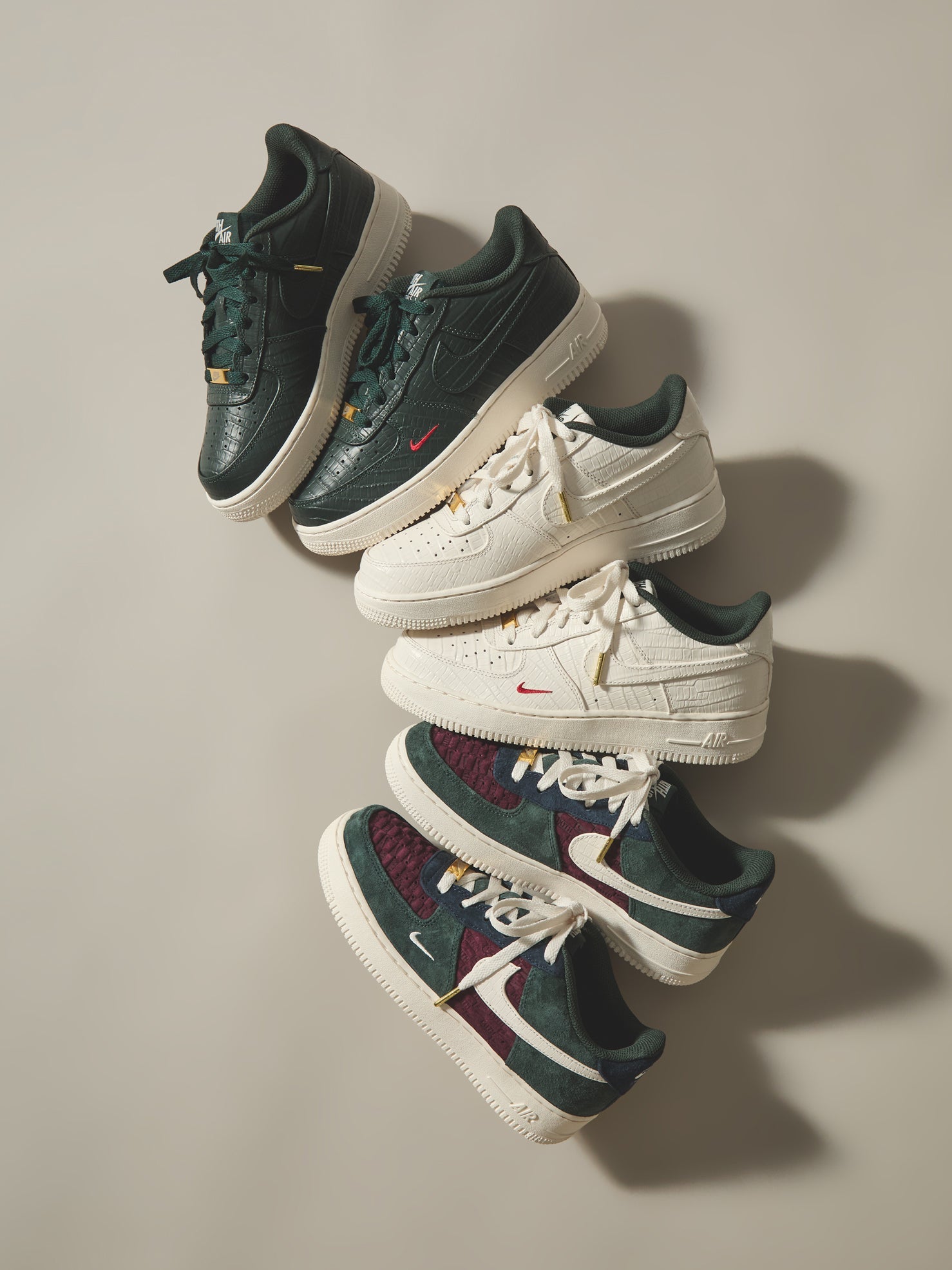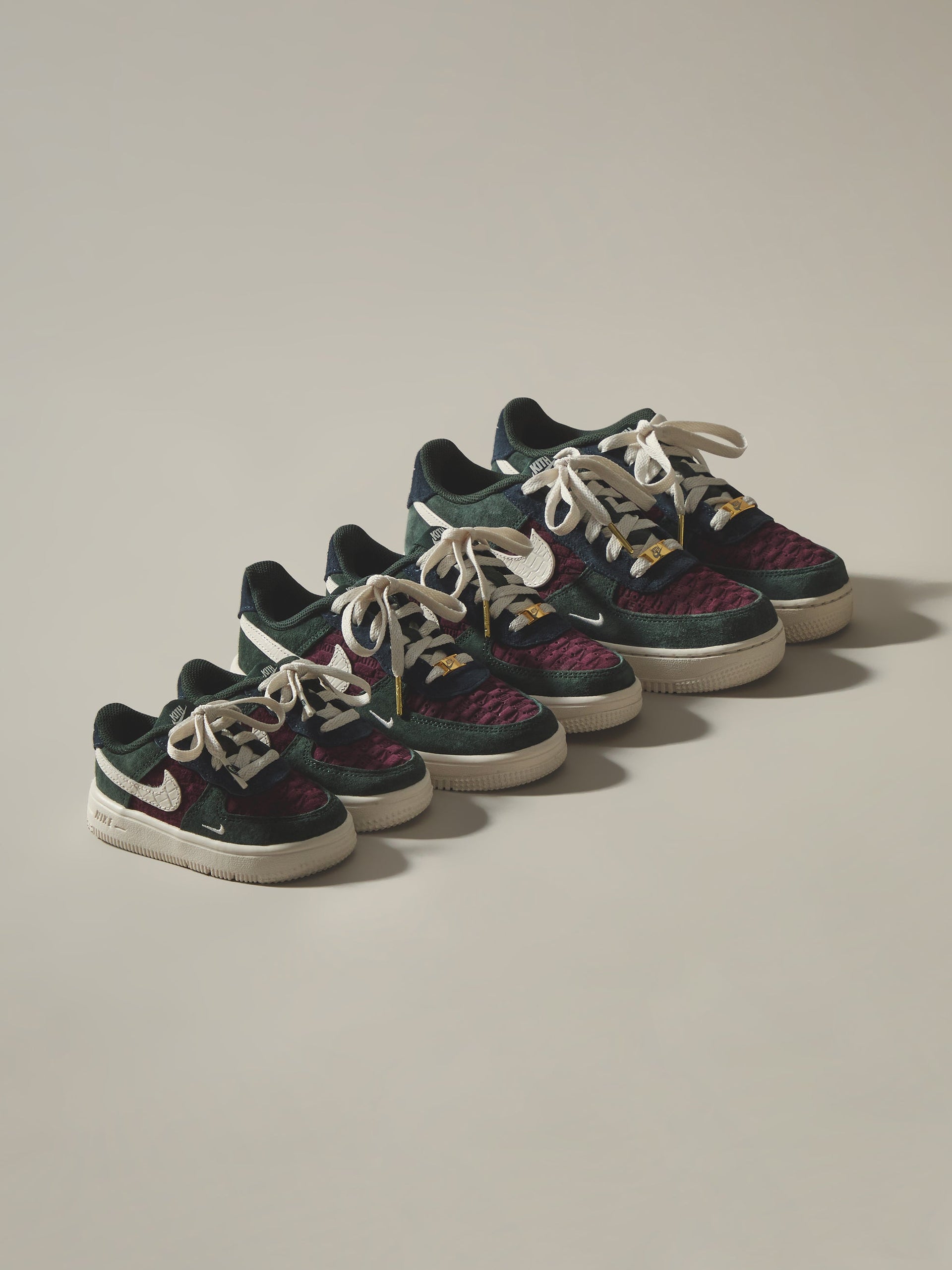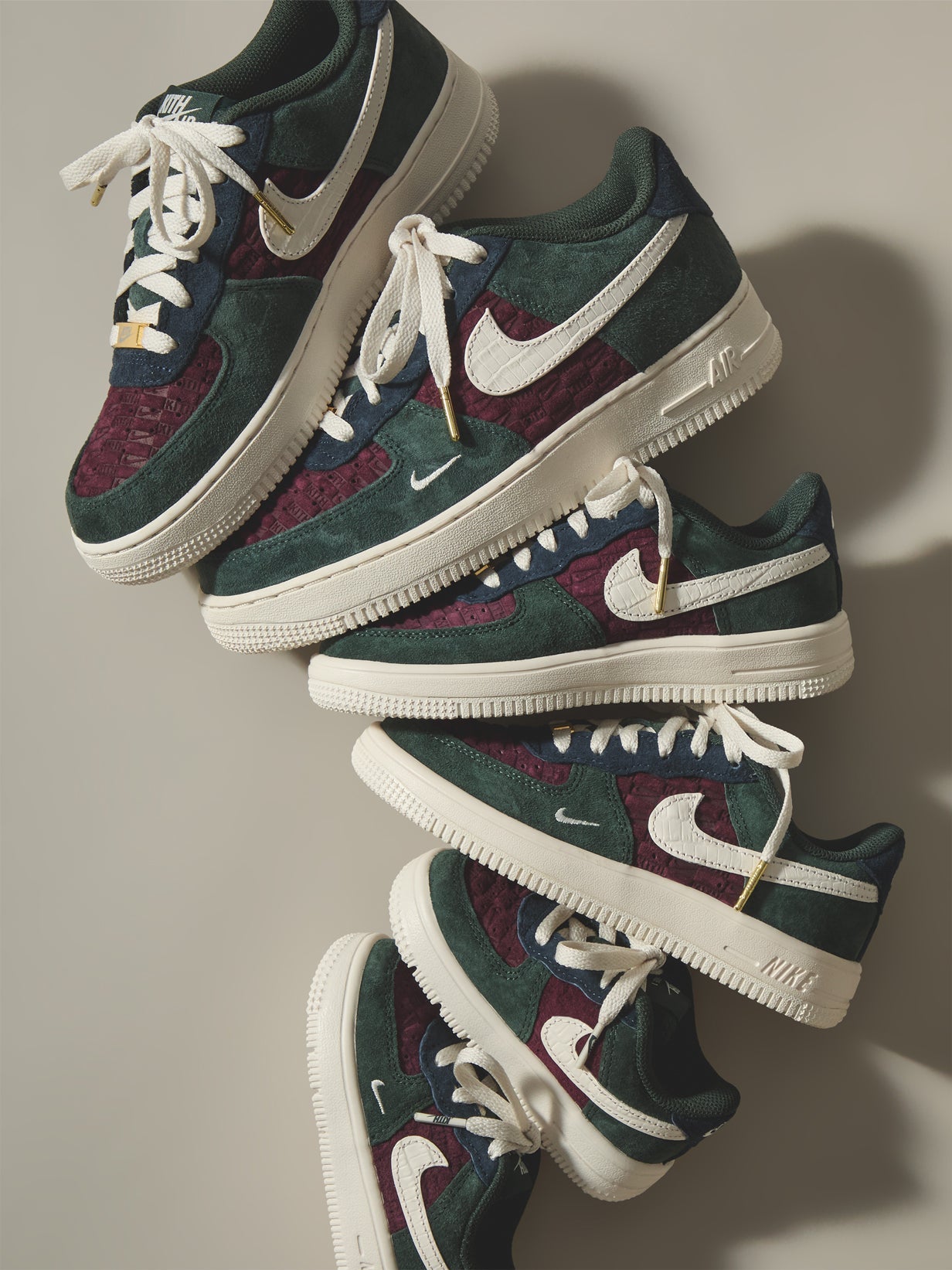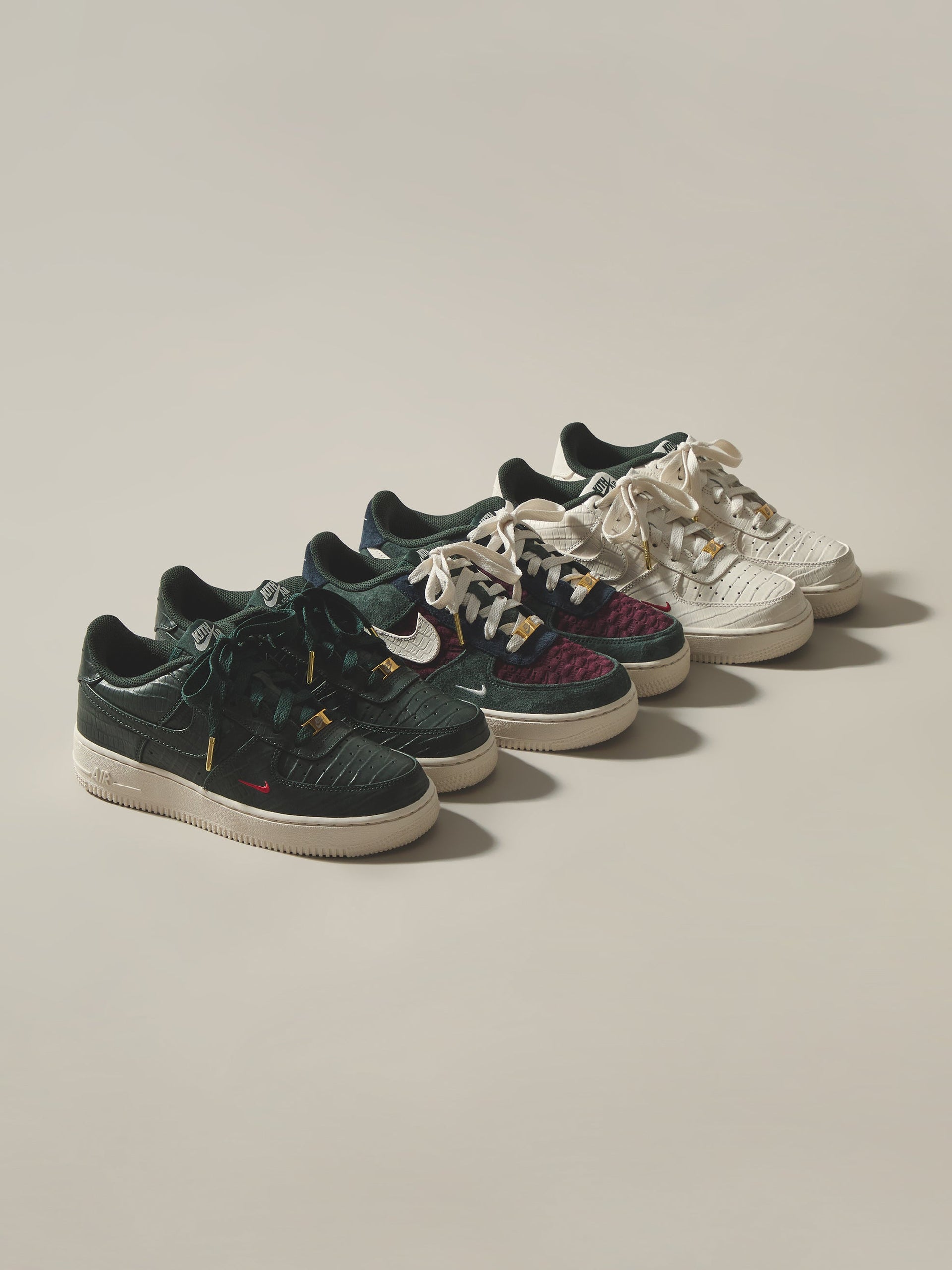 The Air Force 1 is featured in three hues and Toddler, Pre-School, and Grade School sizing—one pigskin suede iteration in colors drawn from the Kithmas Palette, and two crocodile embossed leather colorways, Phantom Green and White. The color-blocked suede silhouette features Kith and Nike debossed monogramming at the toebox and quarter panels, Kith and Nike Swoosh co-branding at the tongue, footbed, and heel, and all three have gold accents with the lace aglets and custom co-branded dubrae.