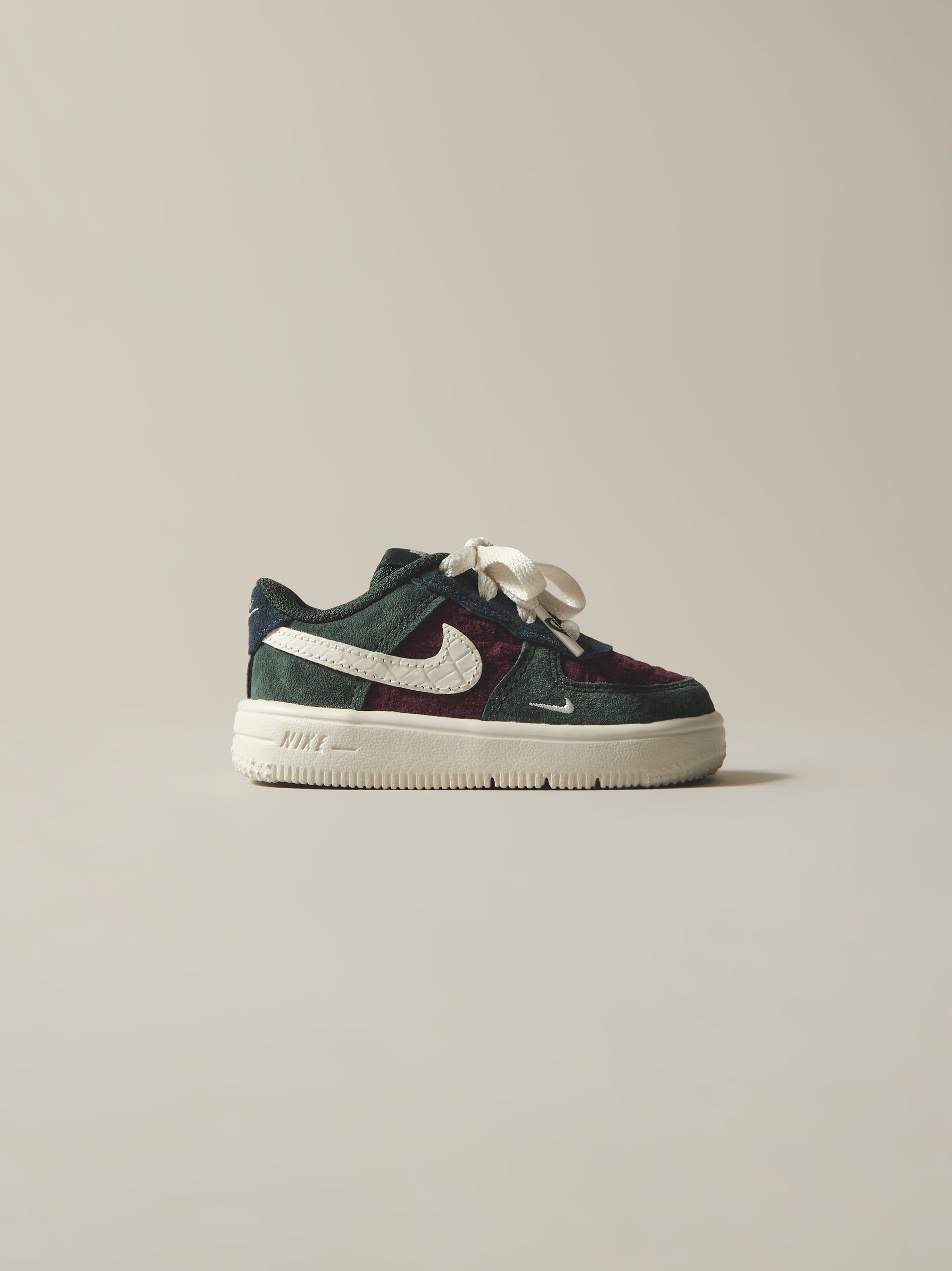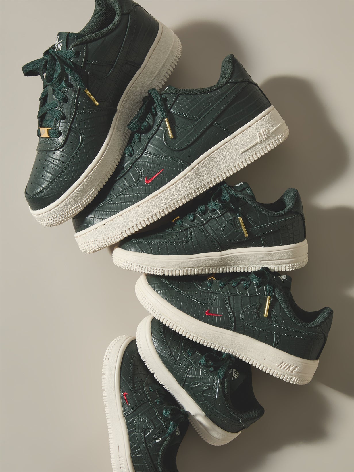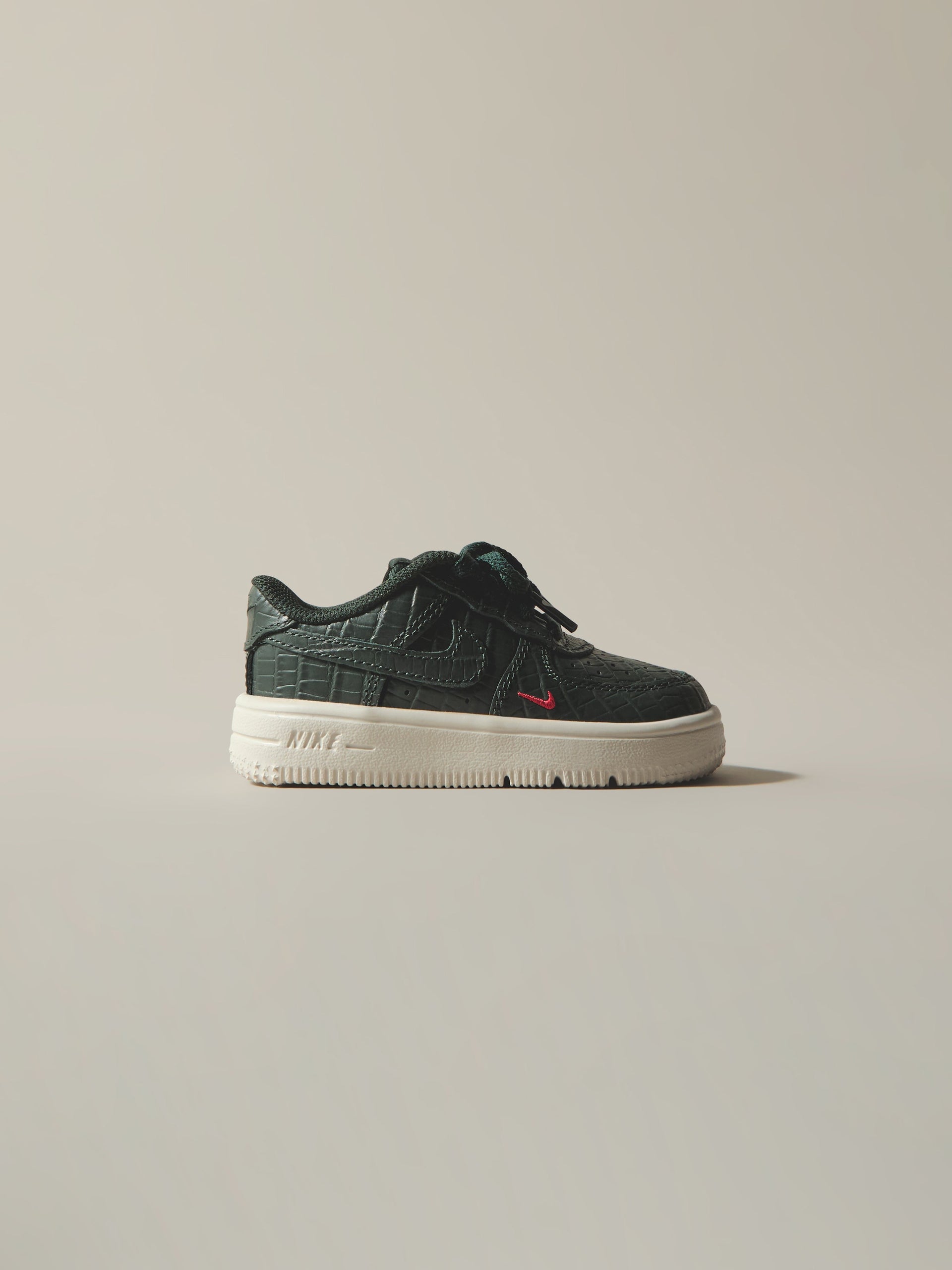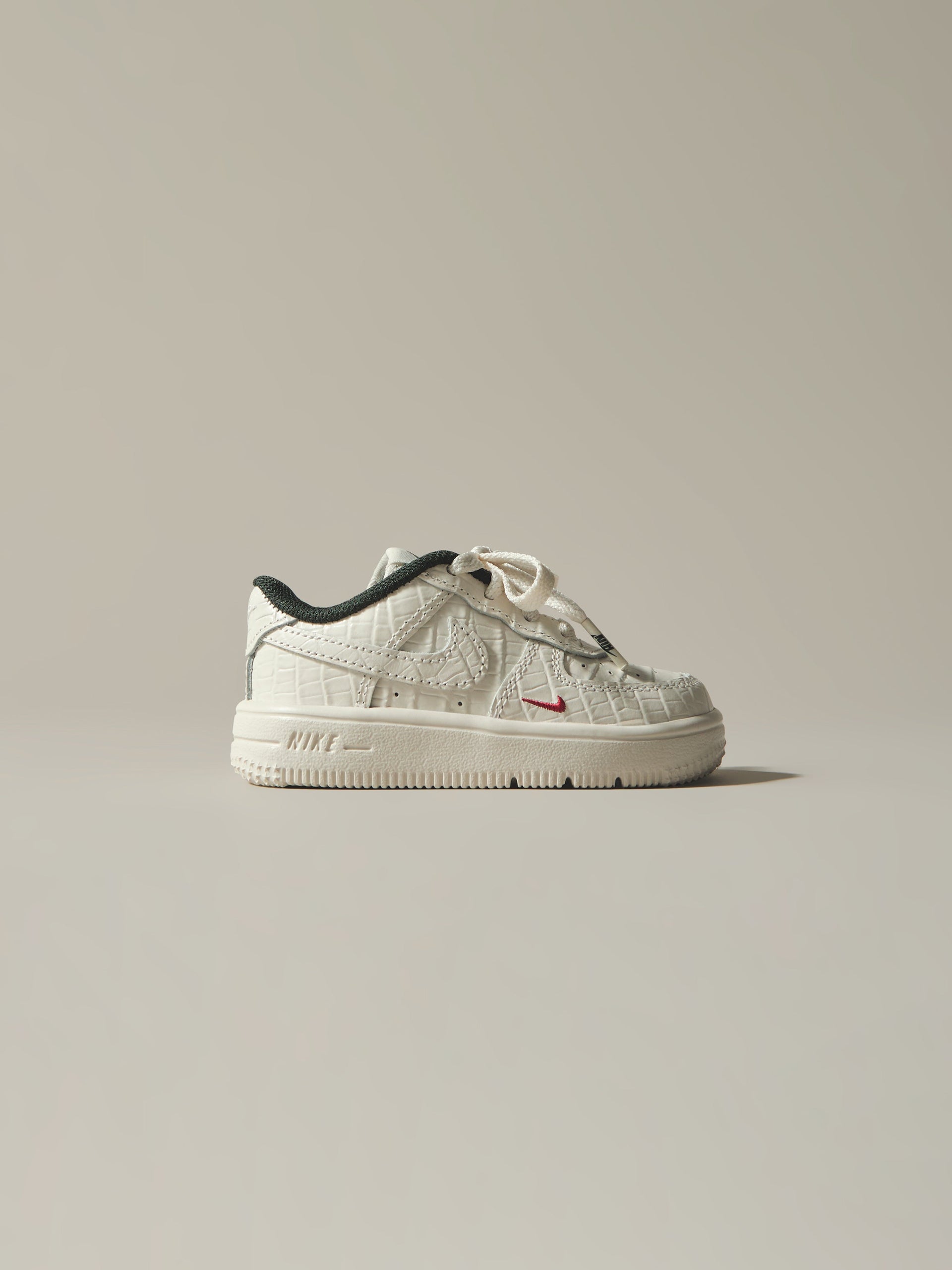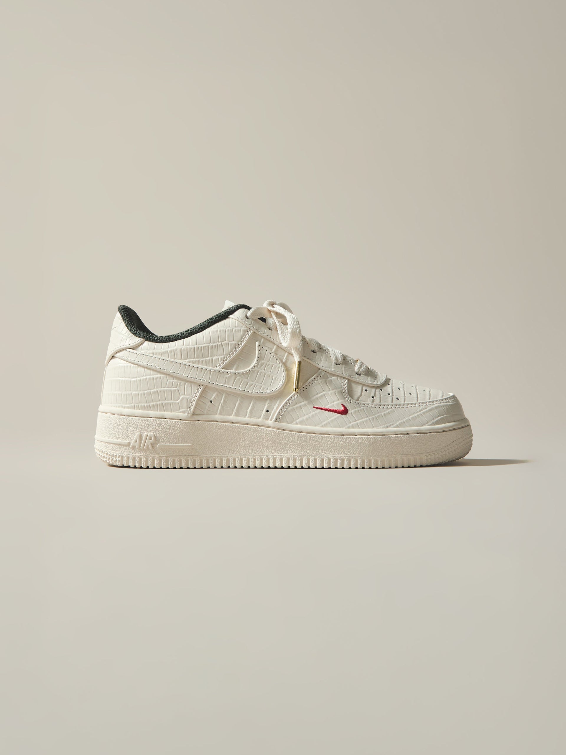 The Air Force 1 is featured in three hues and Toddler, Pre-School, and Grade School sizing—one pigskin suede iteration in colors drawn from the Kithmas Palette, and two crocodile embossed leather colorways, Phantom Green and White. The color-blocked suede silhouette features Kith and Nike debossed monogramming at the toebox and quarter panels, Kith and Nike Swoosh co-branding at the tongue, footbed, and heel, and all three have gold accents with the lace aglets and custom co-branded dubrae.