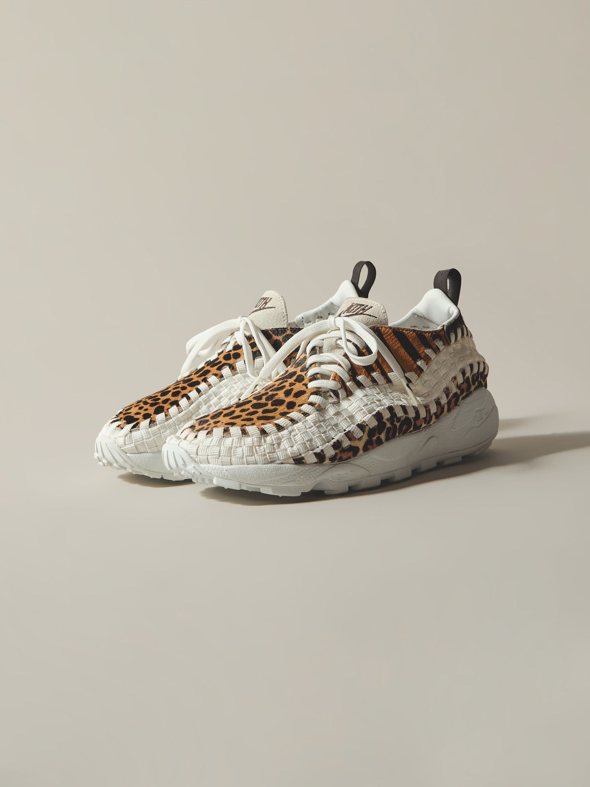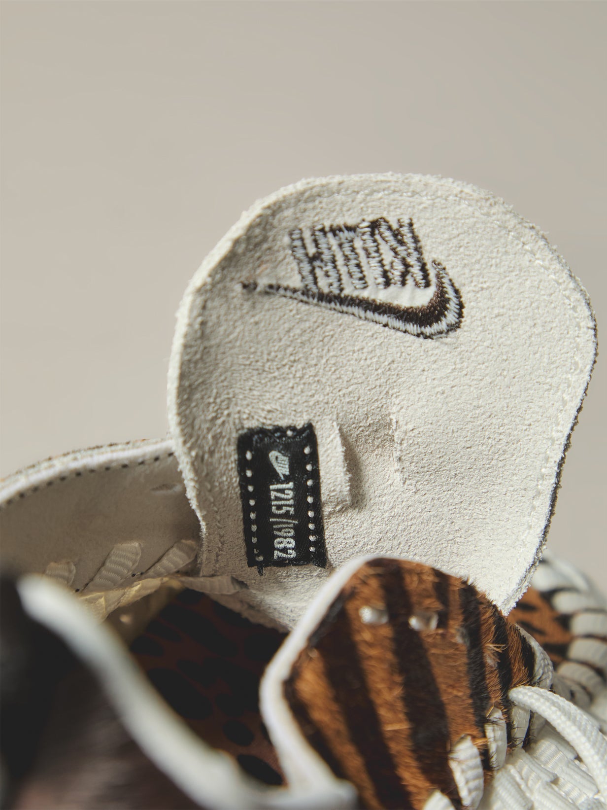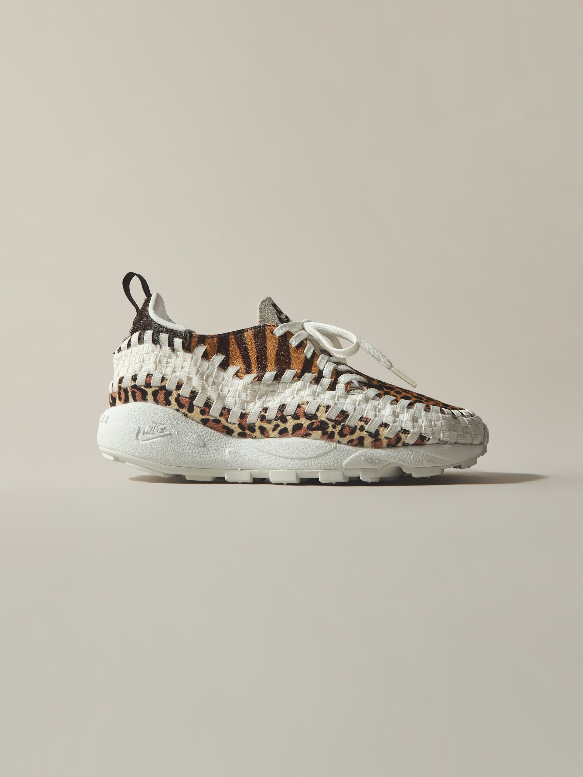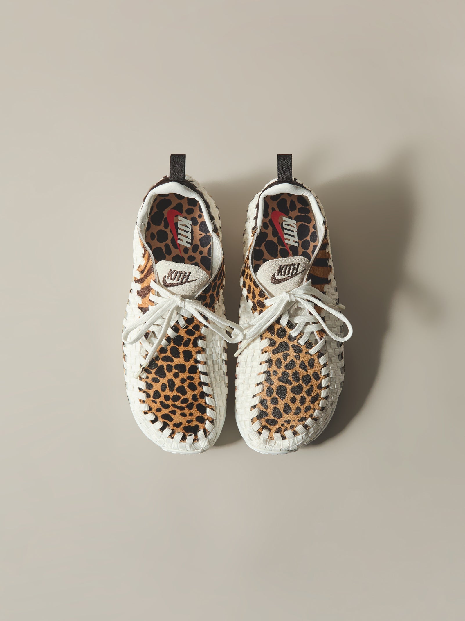 This collaboration begins with the Footscape in Grade School sizing–a silhouette never before done in the kids size scale—comprising zebra, snow leopard, and giraffe blocked ponyhair woven together with classic Footscape lacing detailing throughout. It is complete with co-branded Kith and Nike Swoosh branding on the tongue, and footbed.