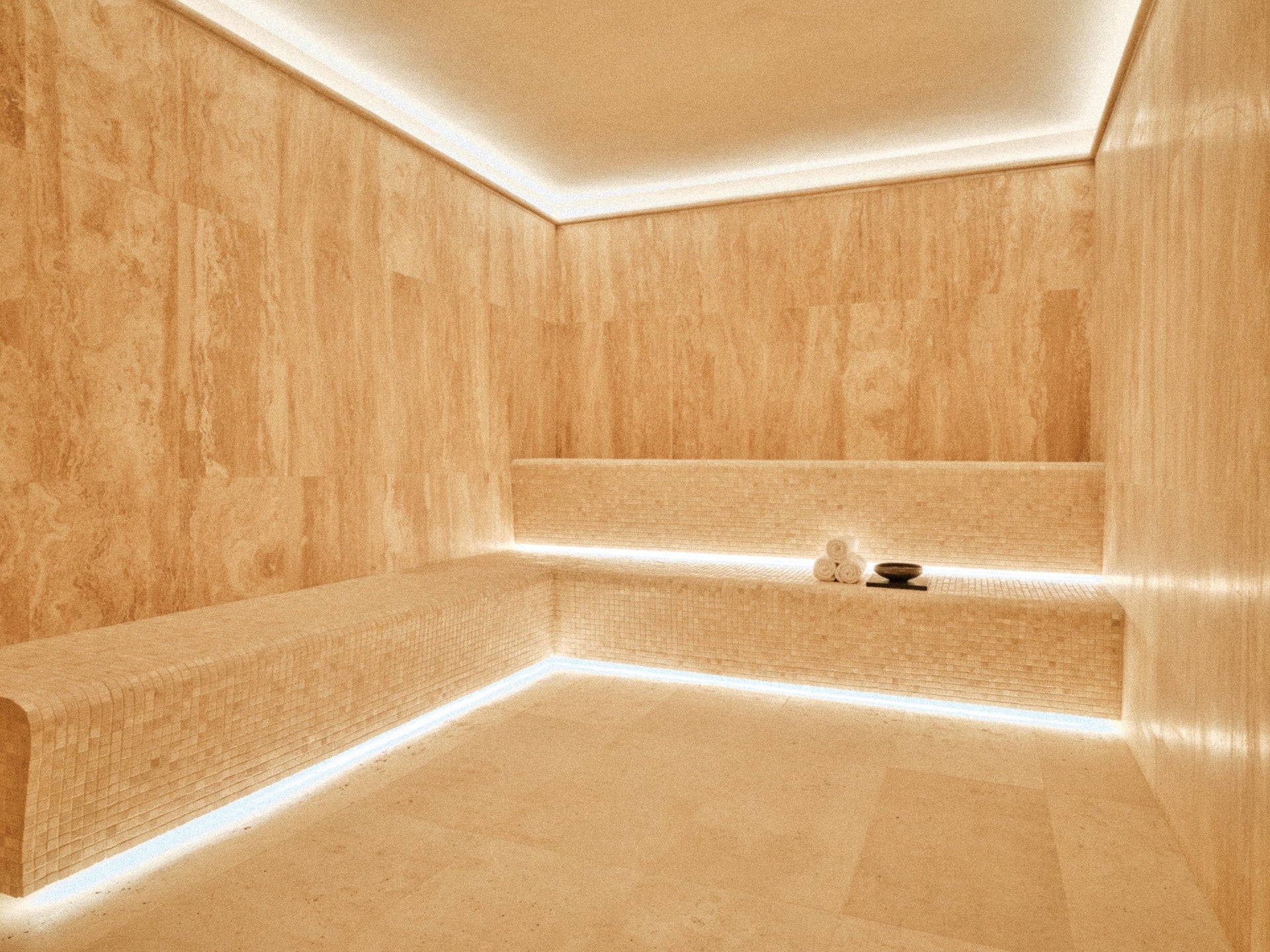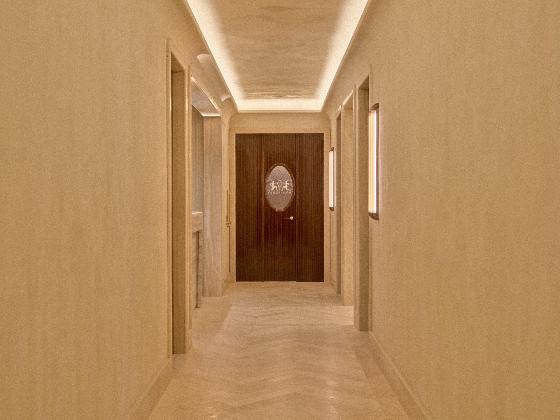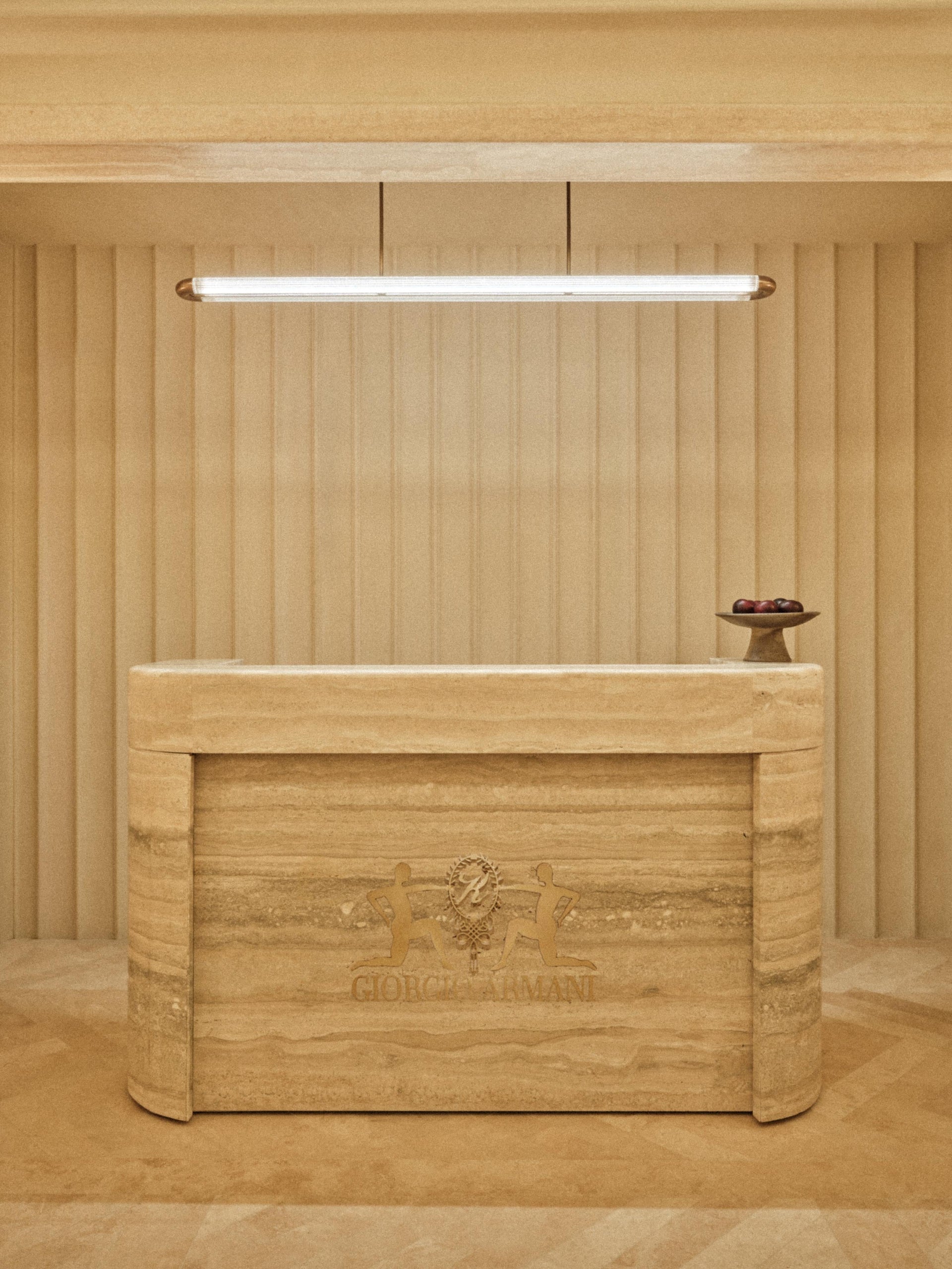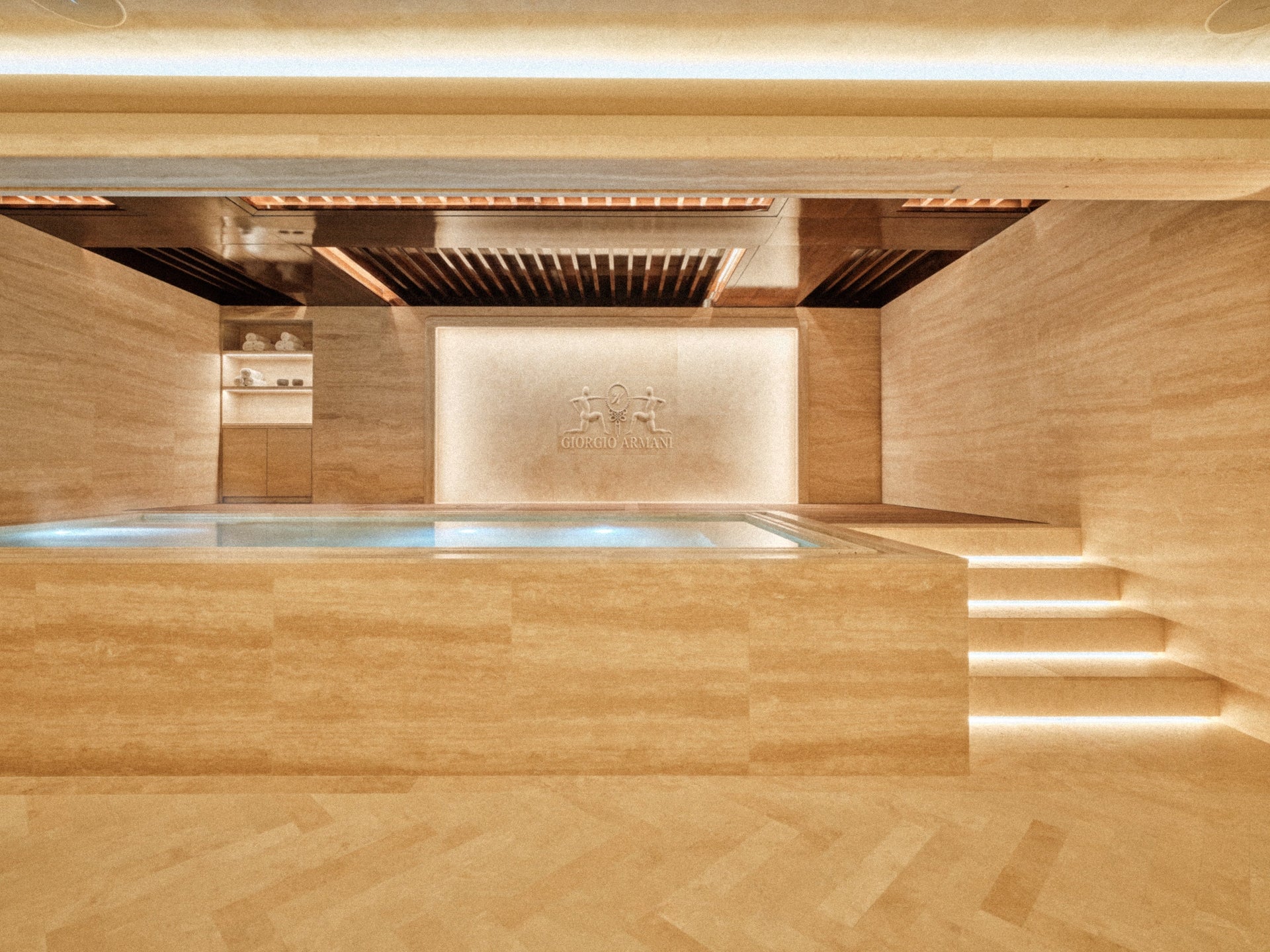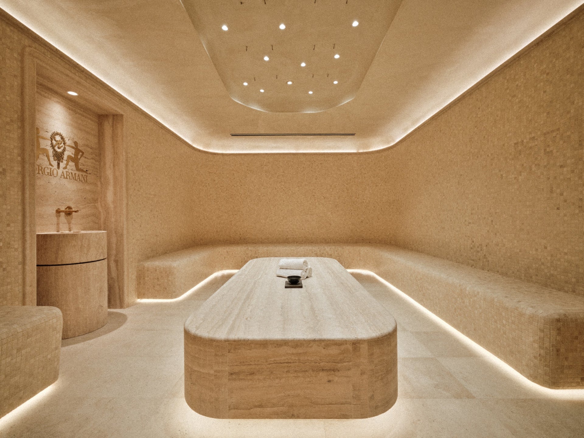 Giorgio Armani and Kith continue their storied collaboration with a first-of-its-kind luxury spa experience, designed to be a place of relaxation for all of its members. Inspired by high-end hotels and spas from around the world, the space features travertine walls and flooring, creating a serene and calming atmosphere. Treatment rooms will be equipped with state-of-the-art equipment, and the spa will offer a range of services, including Thai, Swedish, and sports massages, as well as various facial treatments, IV drips, and other therapies. The spa includes additional facilities such as hydrotherapy services such as a jacuzzi, hammam, sauna, steam rooms, and cold plunge.