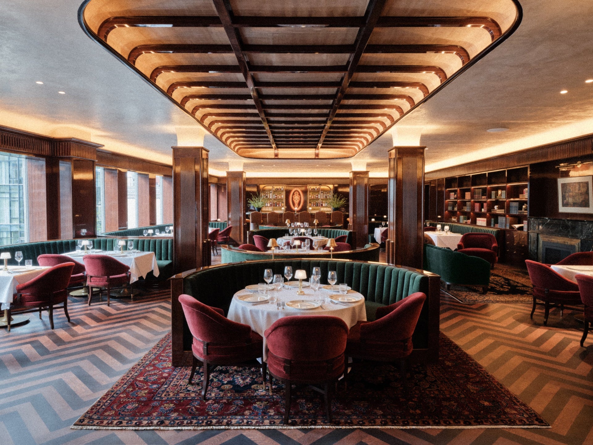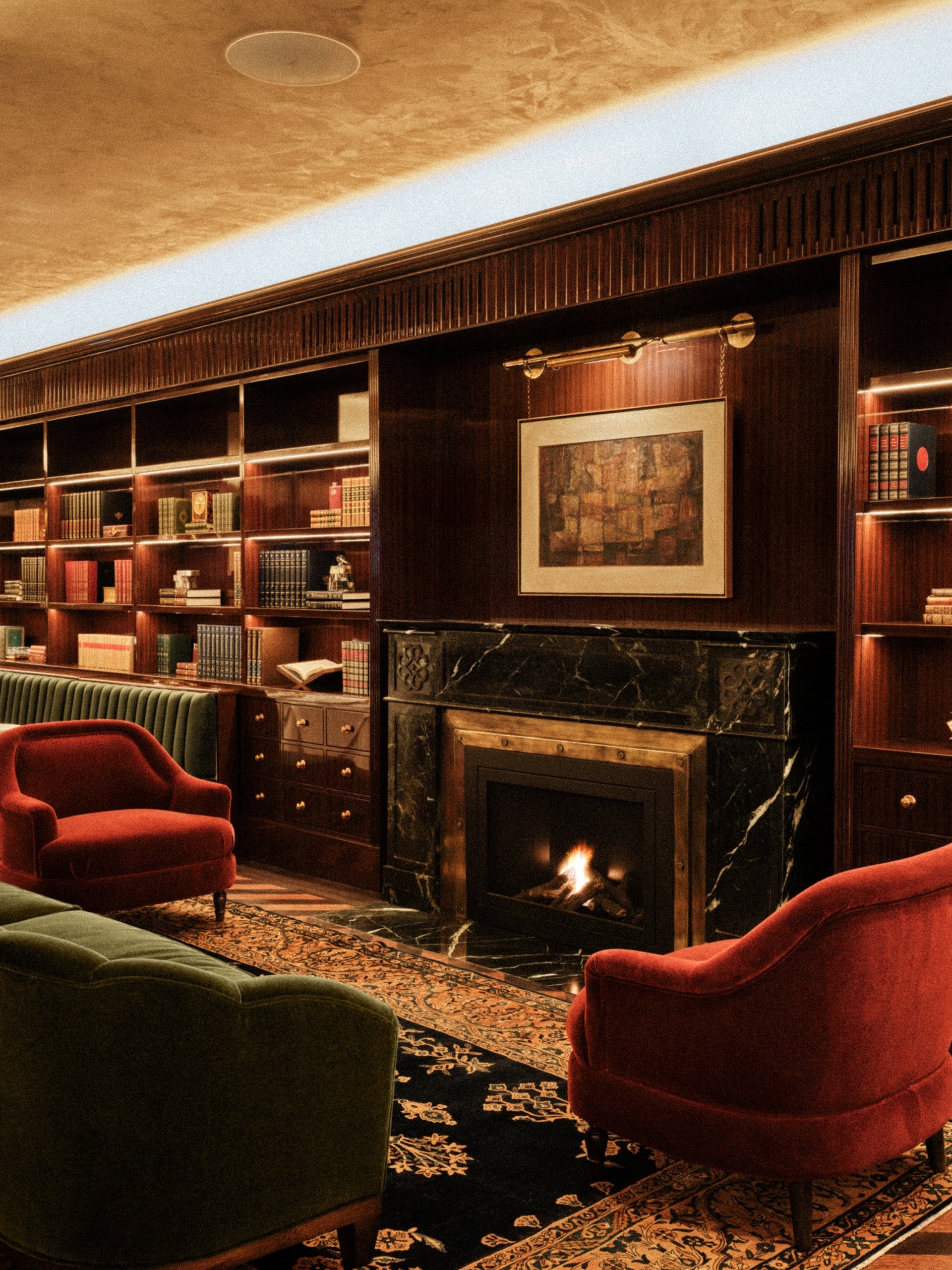 This endeavor wouldn’t be possible without a suite of partners who are innovators in their fields. For the dining space, Kith partners with Cafe Mogador, a New York City staple, to bring a new, upscale menu and service featuring classics and new perspective on Moroccan inspired Mediterranean cuisine. The interior features vintage-sourced Persian rugs that add warmth and character to the space, rich, dark rosewood accents complemented by plush seating arrangements, and a color palette of various shades of green and burgundy, enhancing the inviting atmosphere. A central fireplace serves as a focal point, surrounded by bookshelves filled with curated literature and objects, further contributing to the home-like feel.