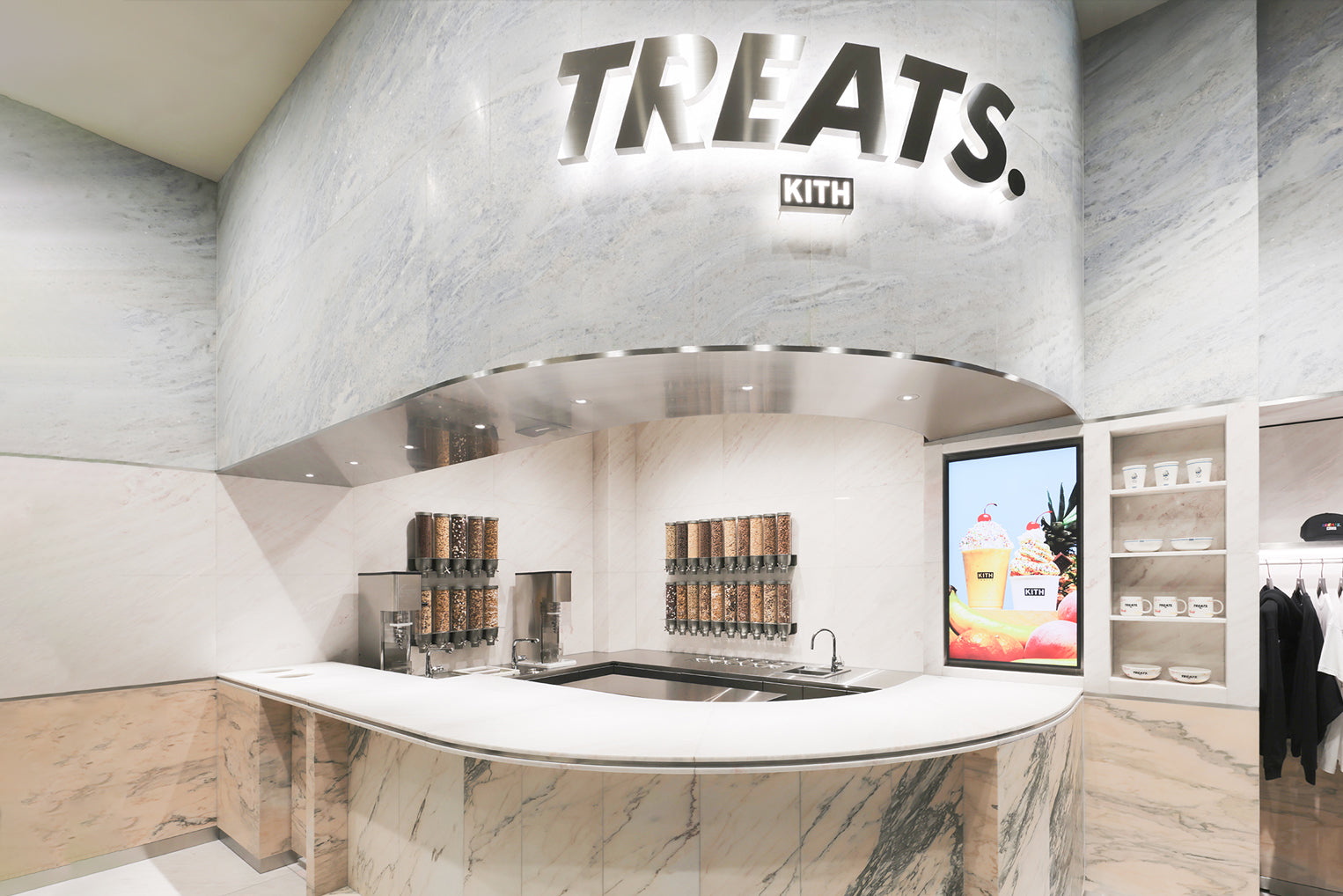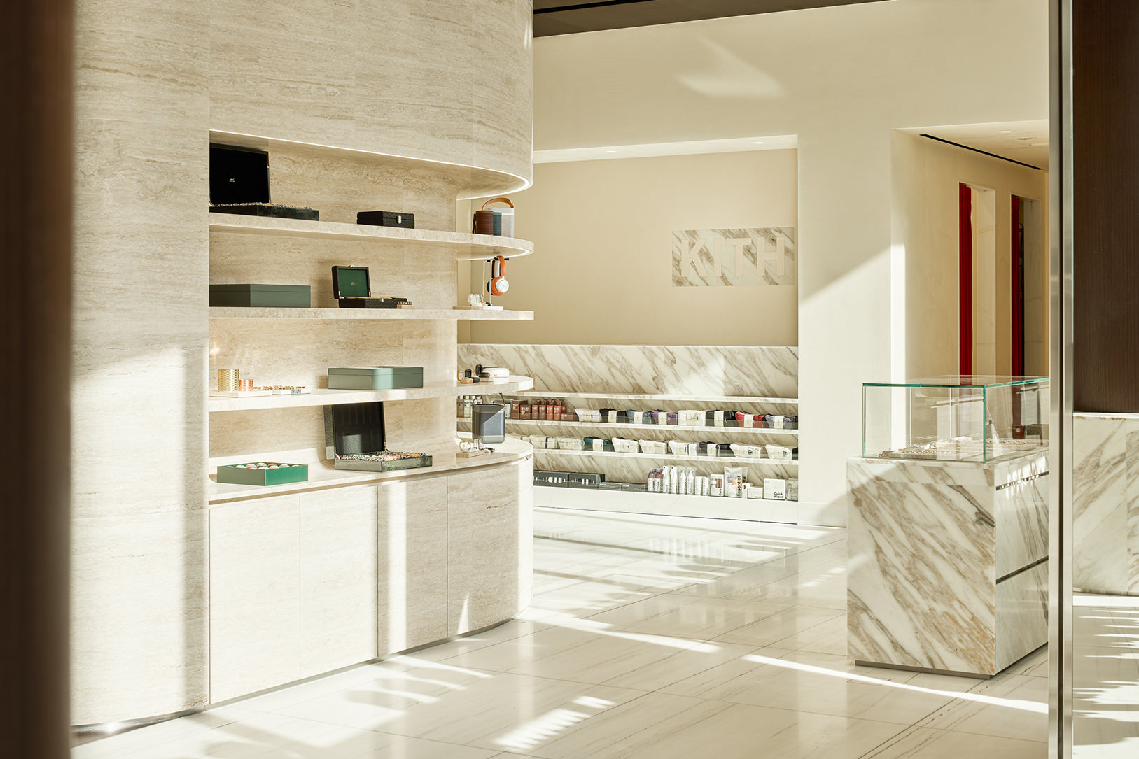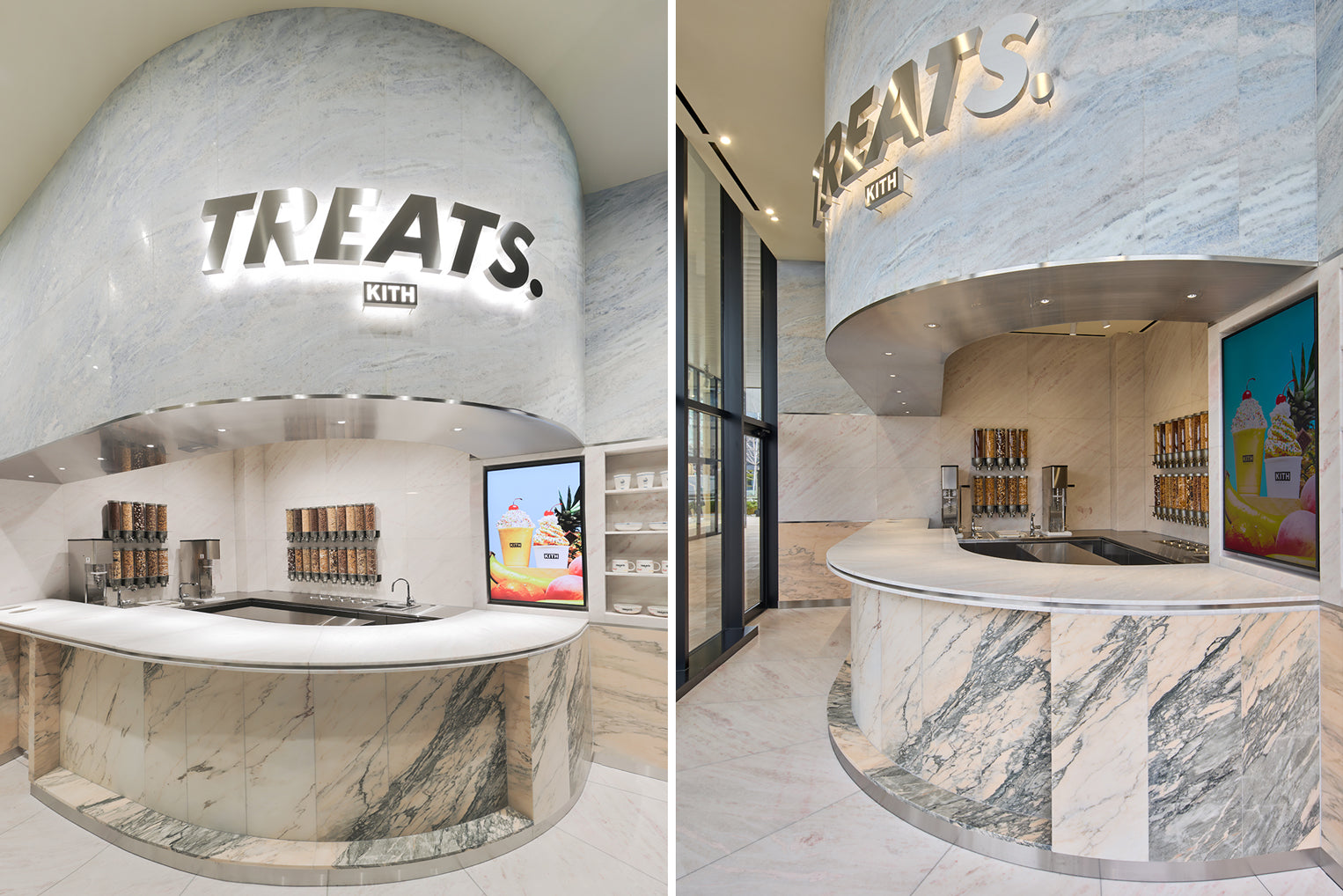 Across the street is the Kith Kids store and Kith Treats shop. The Kith Kids store has the same luxurious feel, yet is more playful. It features multi-colored Kith Monogram wallpaper and is made from Rosa Portugalo, Verde Paradise and Mediterranean Blue stone. The Kith Treats shop was designed to create a modern, light ambiance. It is made with Rosa Aurora walls, Mediterranean Blue stone, and features multi-colored stools along the ice cream bar.