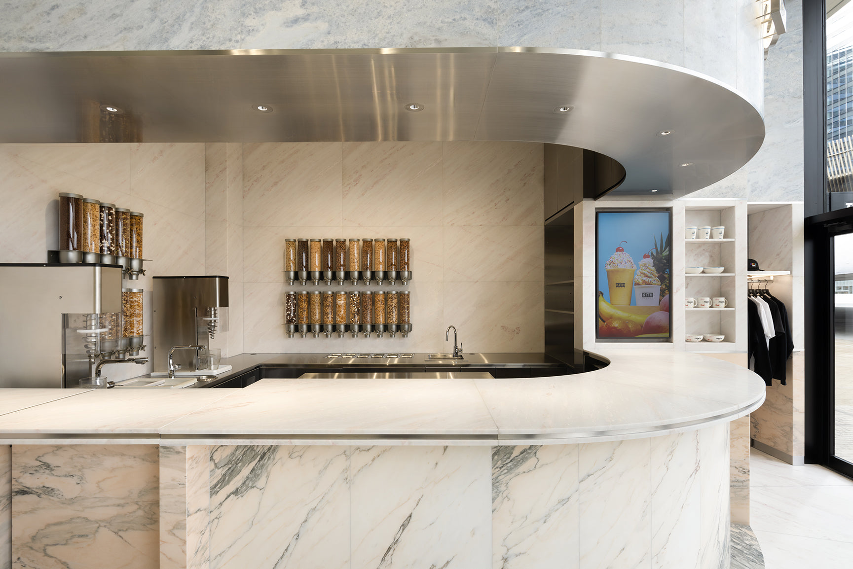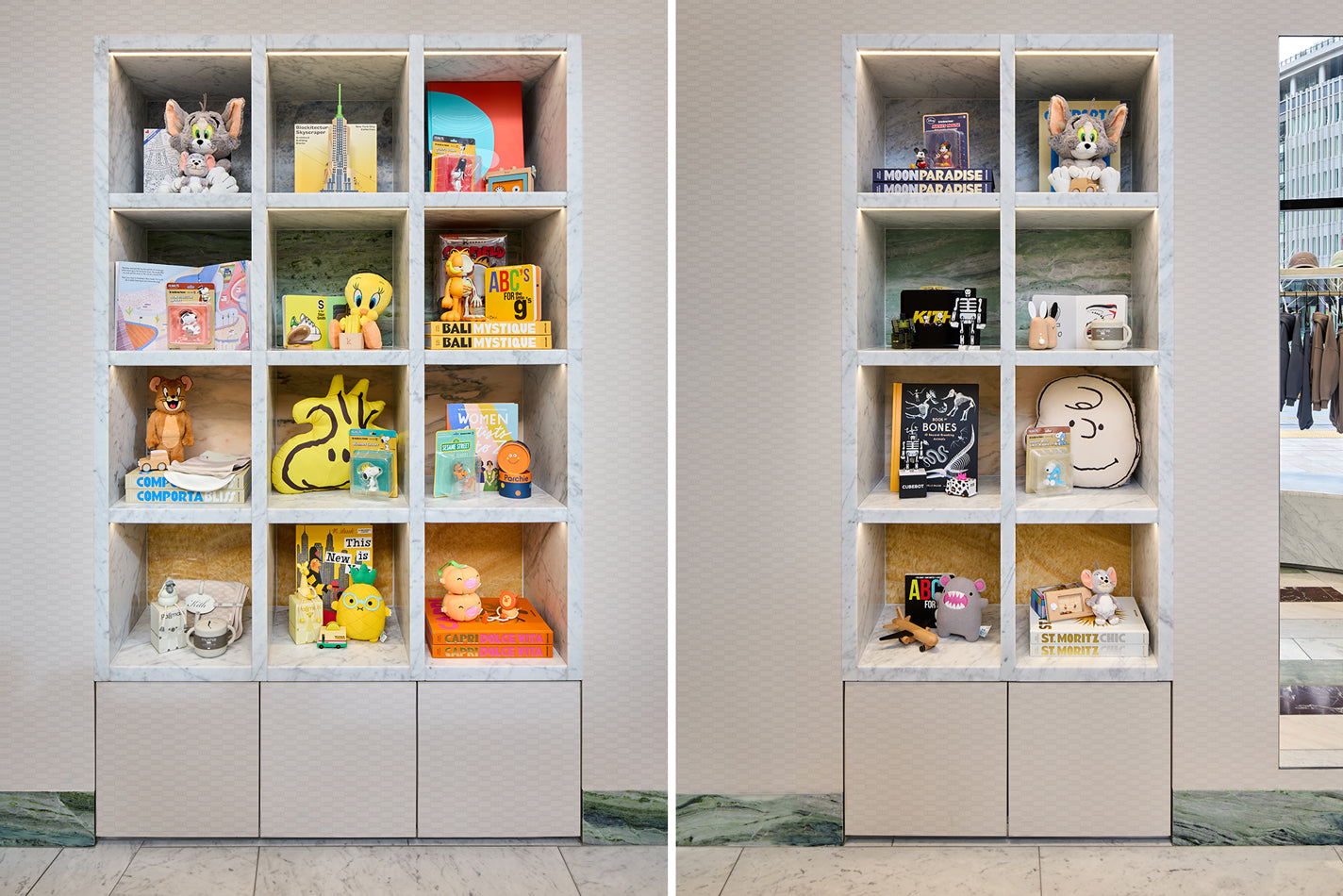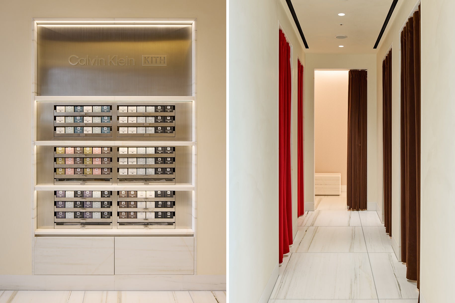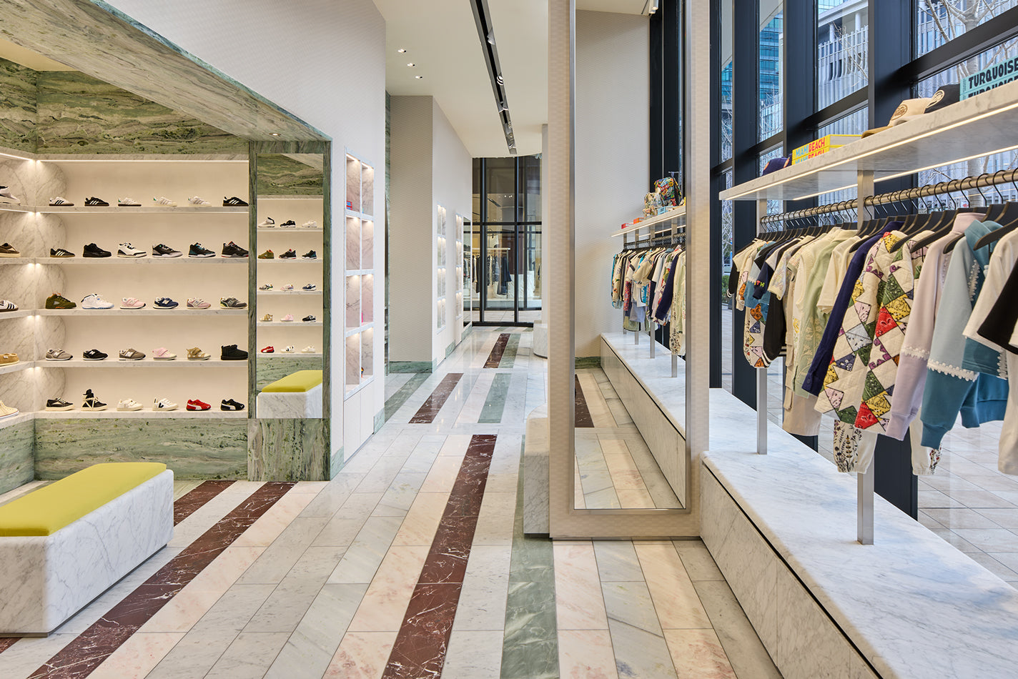 Across the street is the Kith Kids store and Kith Treats shop. The Kith Kids store has the same luxurious feel, yet is more playful. It features multi-colored Kith Monogram wallpaper and is made from Rosa Portugalo, Verde Paradise and Mediterranean Blue stone. The Kith Treats shop was designed to create a modern, light ambiance. It is made with Rosa Aurora walls, Mediterranean Blue stone, and features multi-colored stools along the ice cream bar.