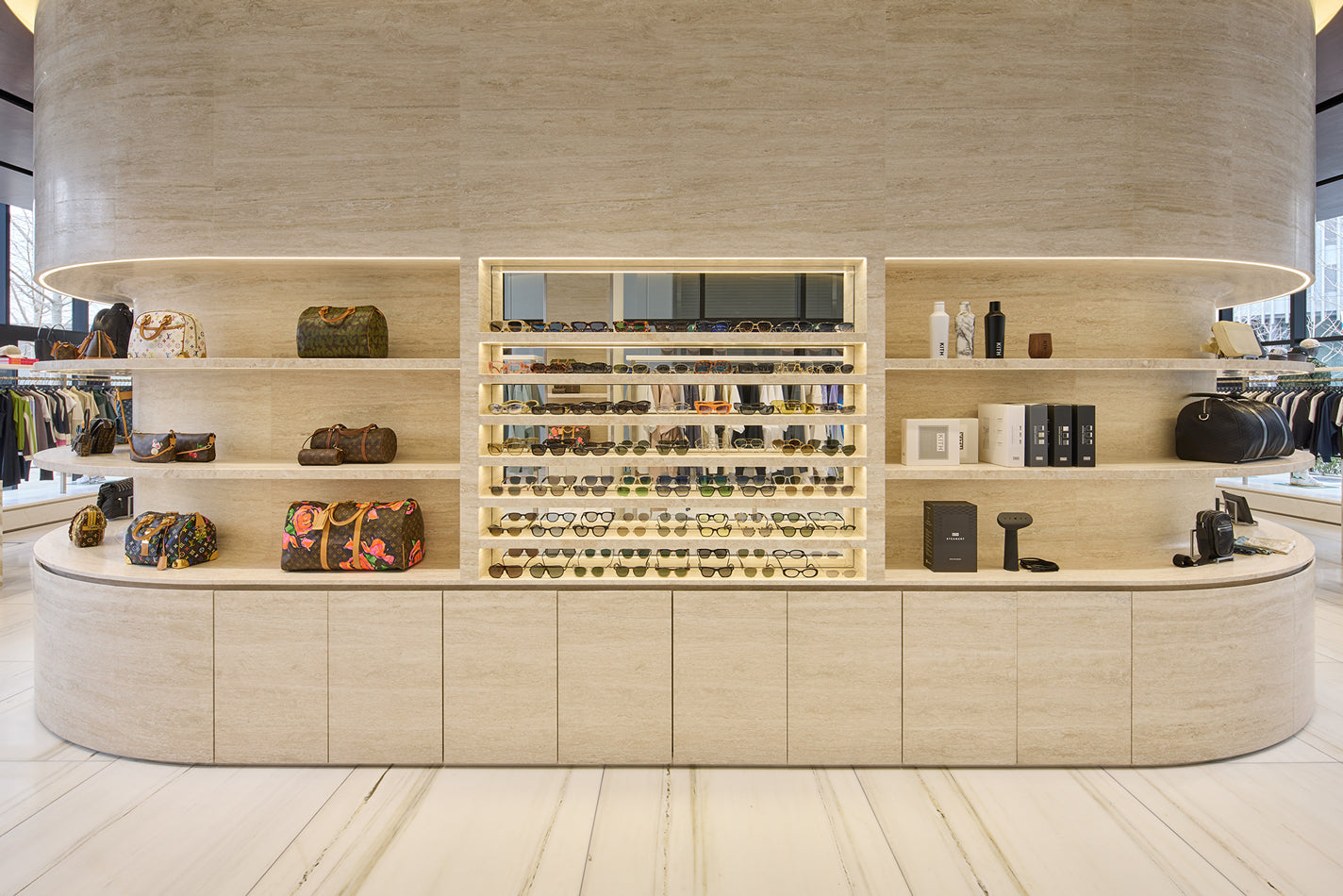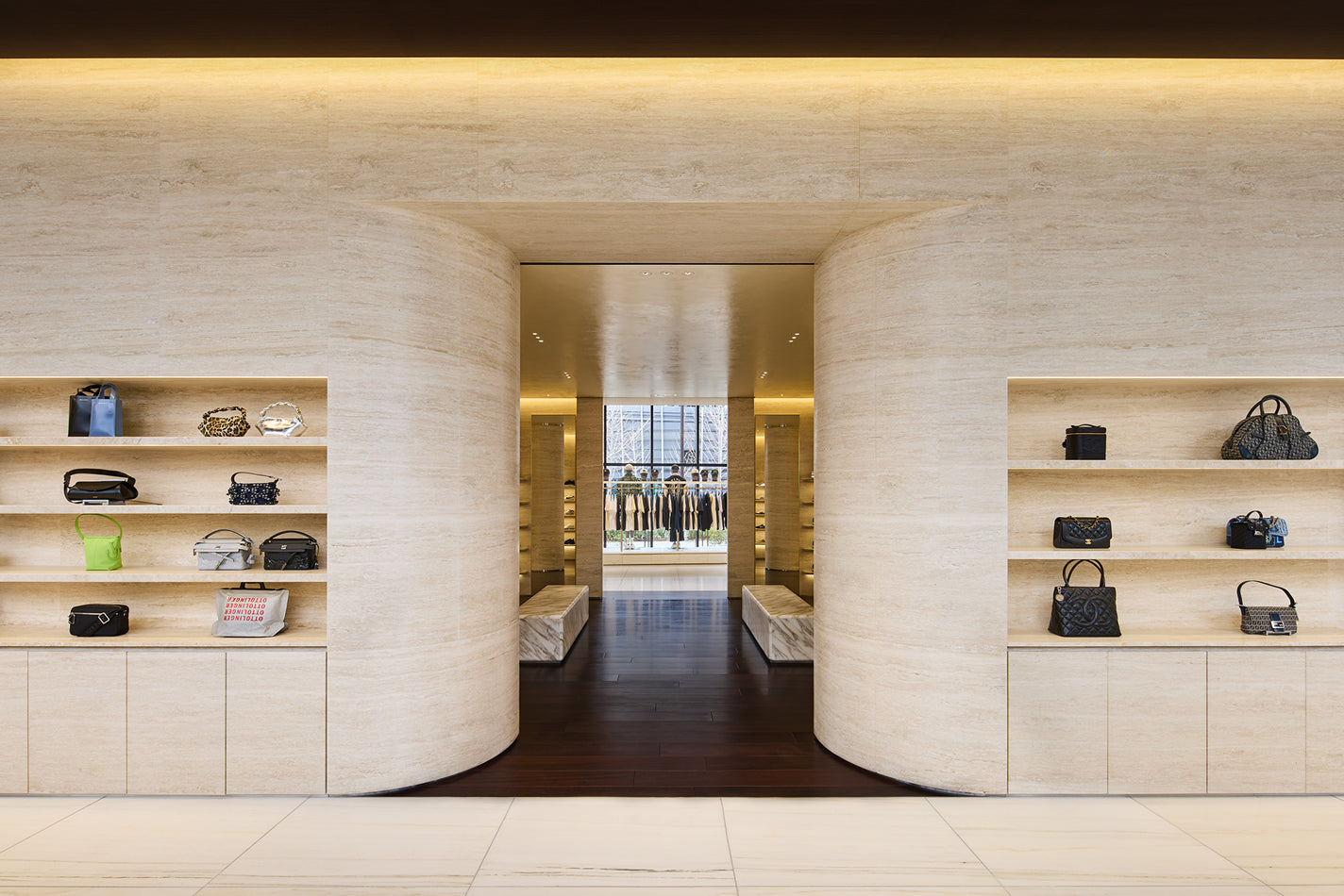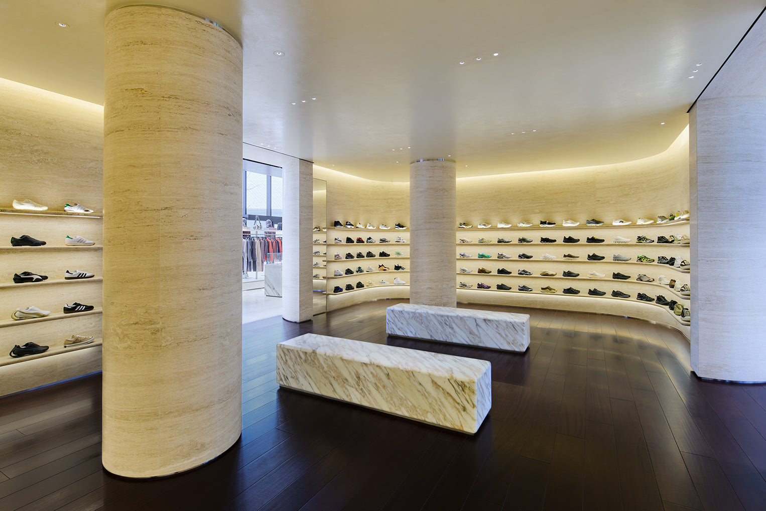 As you enter the store, you are greeted with an abundance of natural light. The main room is made with beautiful Venetian plaster walls, Mountain White Danby stone floors and a Rosewood ceiling. Here you will find men's and women's apparel along the perimeter. The centerpiece is a monolithic travertine room that showcases accessories & lifestyle on the outside and an array of footwear on the inside.