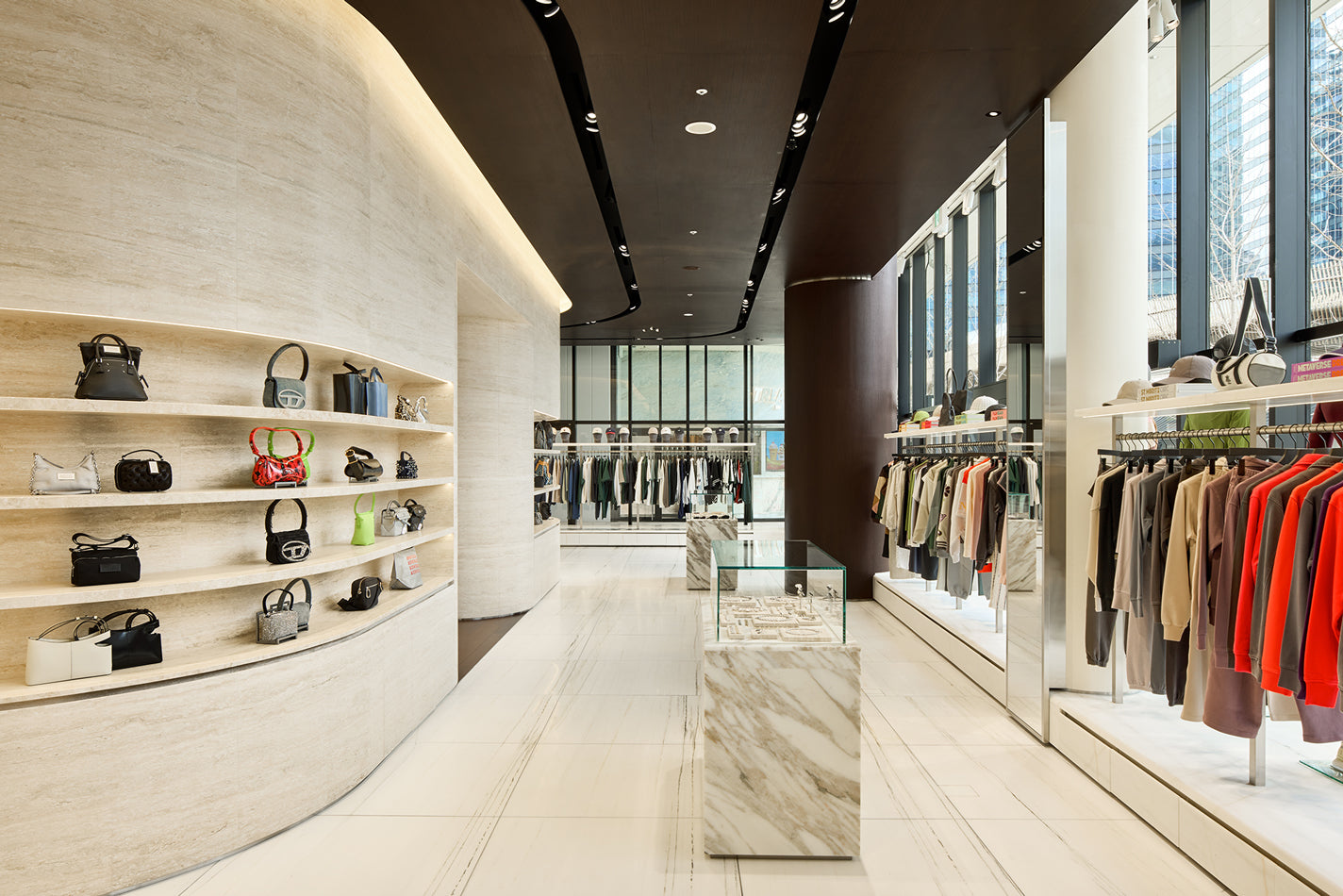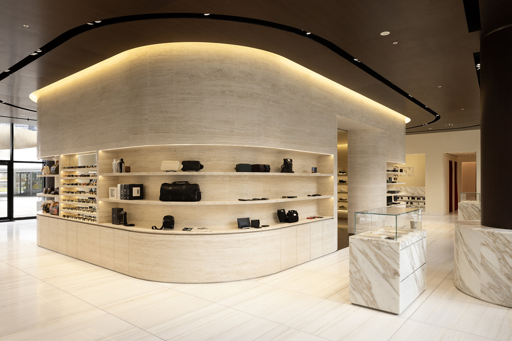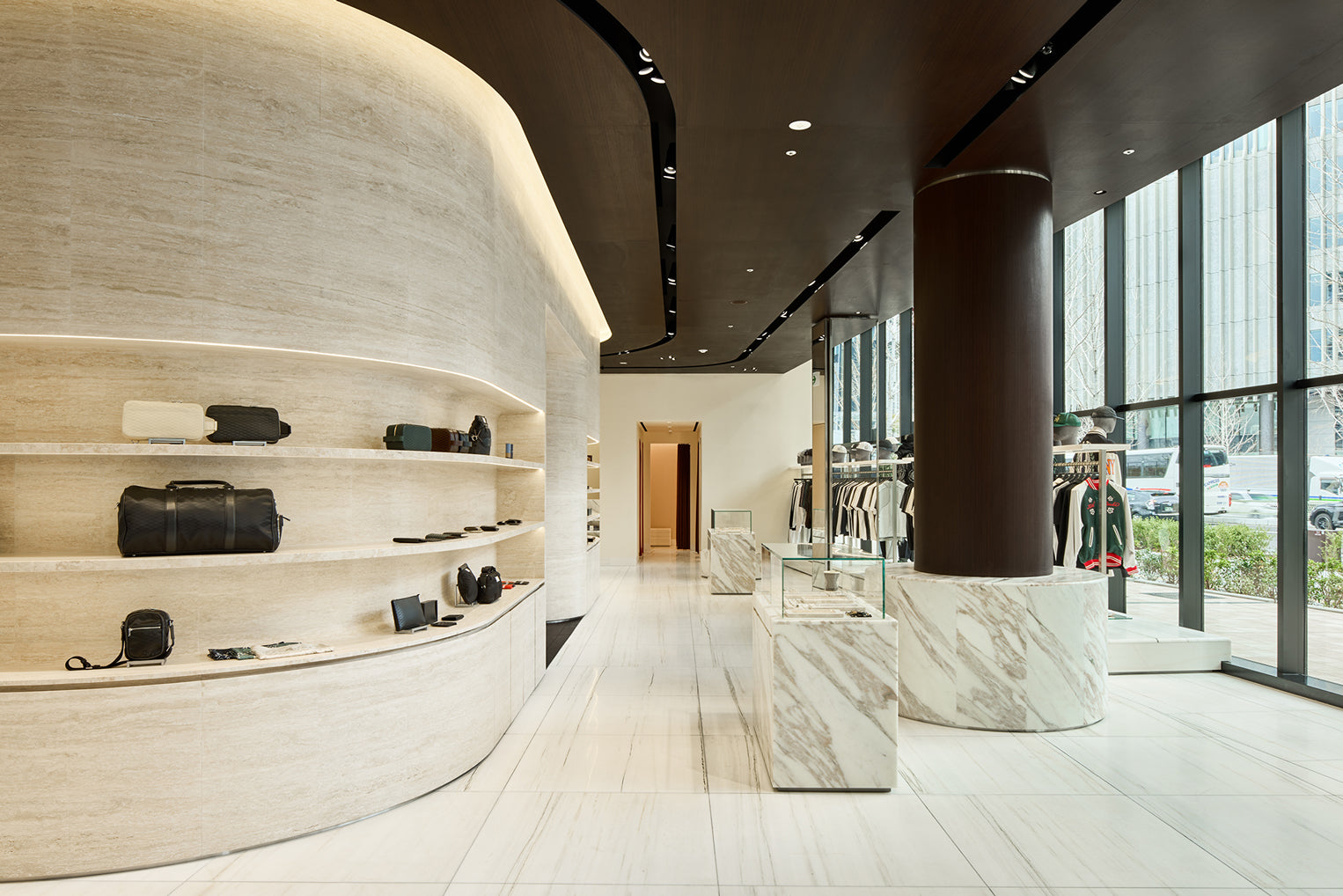 As you enter the store, you are greeted with an abundance of natural light. The main room is made with beautiful Venetian plaster walls, Mountain White Danby stone floors and a Rosewood ceiling. Here you will find men's and women's apparel along the perimeter. The centerpiece is a monolithic travertine room that showcases accessories & lifestyle on the outside and an array of footwear on the inside.
