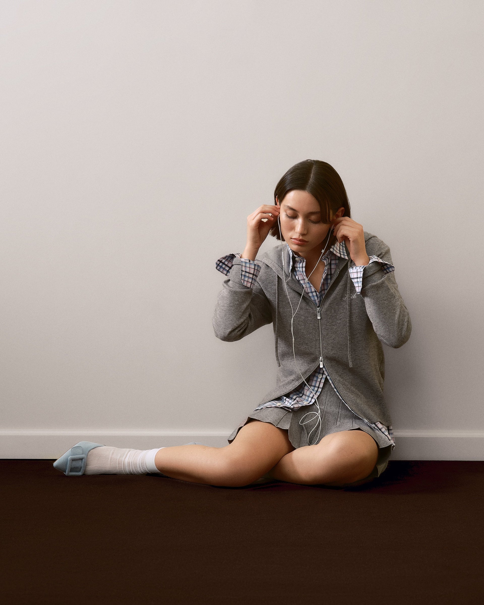 Made of loopback terry striped blends, diamond jacquard cotton knits, and technical nylon ribbed fabric, each silhouette from the Fall 2025 Knitwear collection places emphasis on a soft hand-feel, featuring vintage-inspired shapes like the Selma Towel Polo Long Sleeve, contemporary styles like the Mina Backless Sweater Hoodie, and matching sets like the Faryn Hooded Zip Up and the Hana Pleated Sweater Skort.