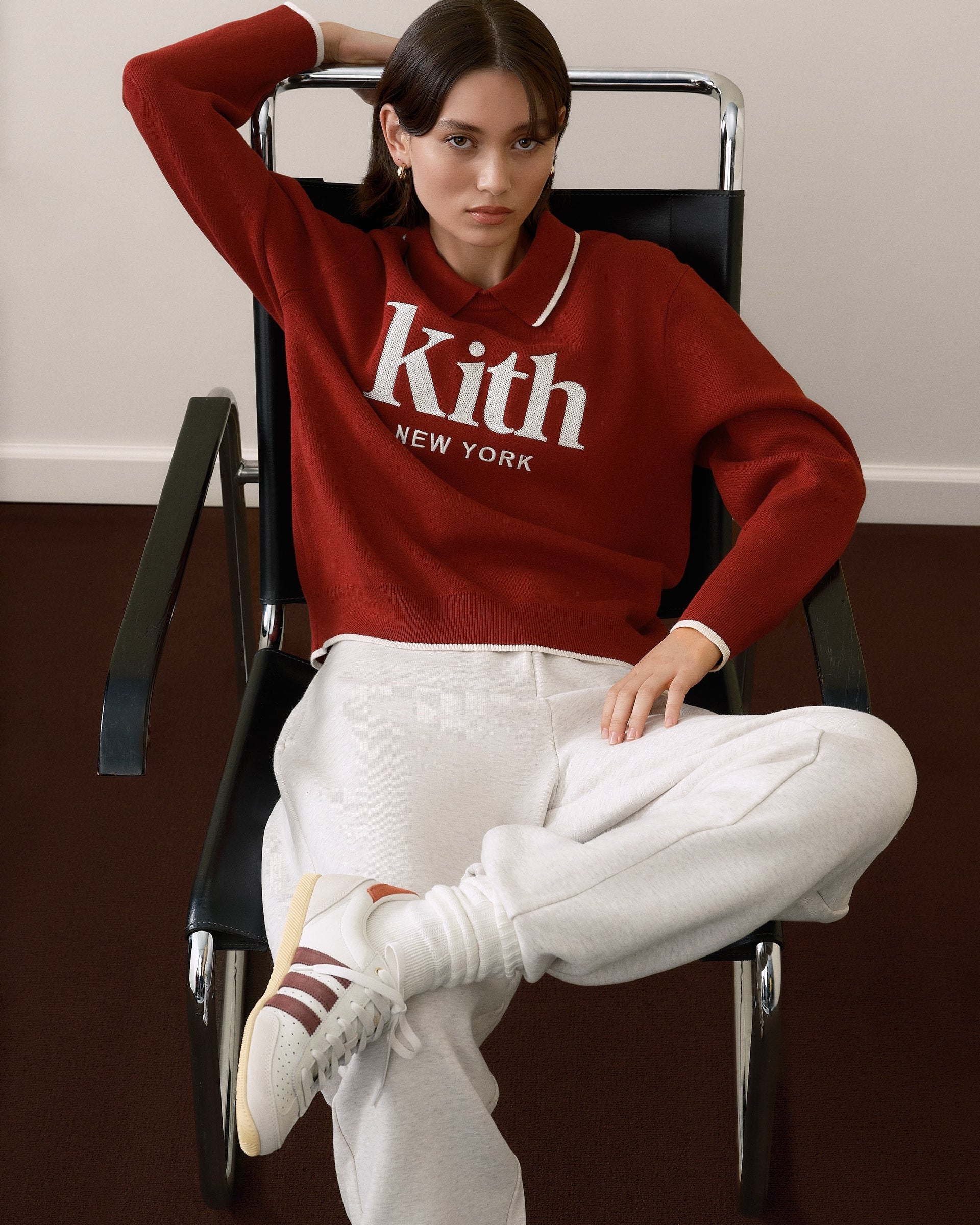 Also featured in the Knitwear assortment are outerwear staples. The Wyler, inspired by the Wyona from the Kith men’s collection, returns for this season in iterations with color-blocking and all-over artwork. It is designed to have an oversized silhouette, ideal for layering during the colder months ahead. Other layerable sweaters from this collection include classic pullovers such as the Ashwin Polo Sweater, the Selma Crochet Polo Long Sleeve, and the cropped Emi Crest Sweater, all complete with subtle embroidered Kith branding.