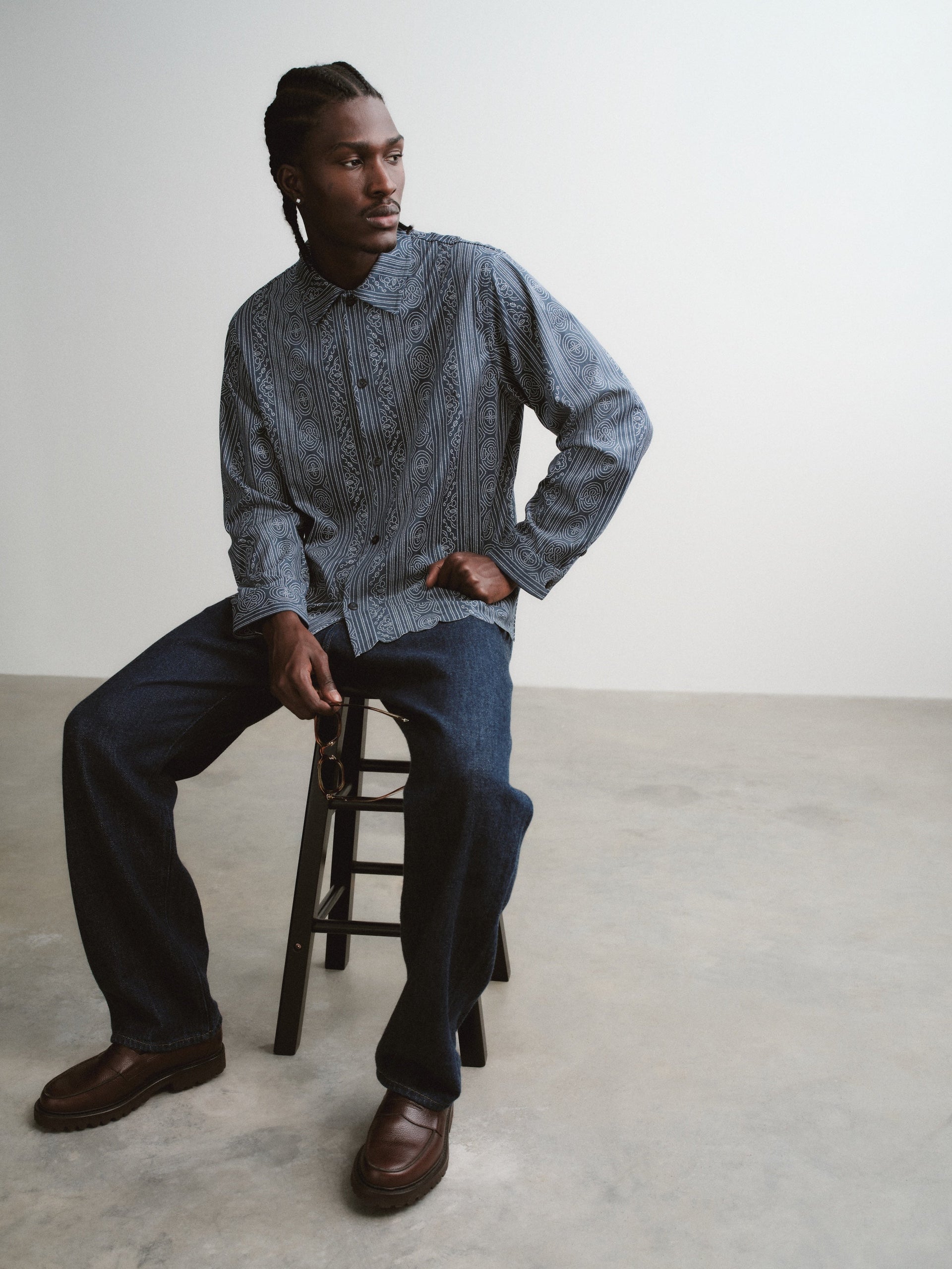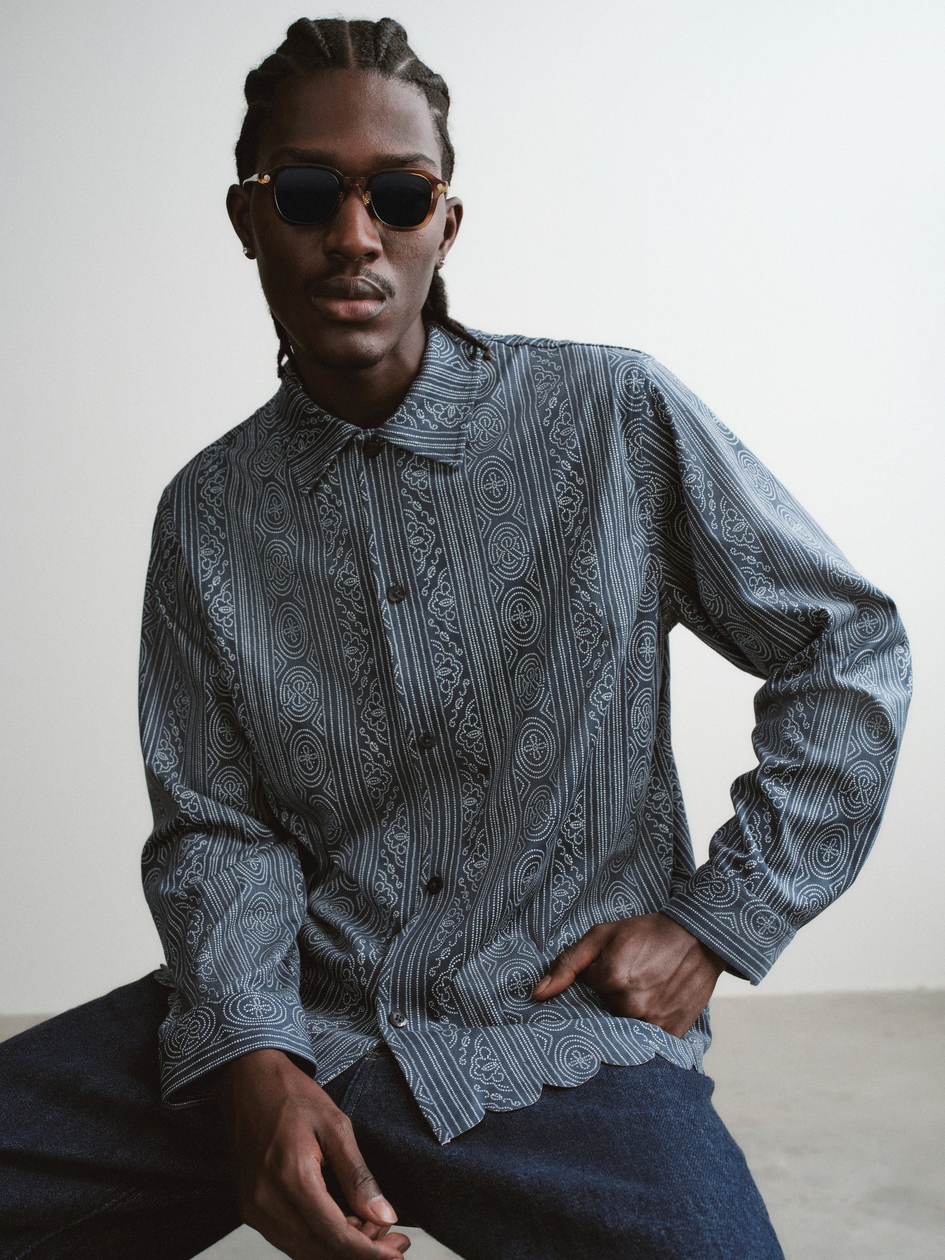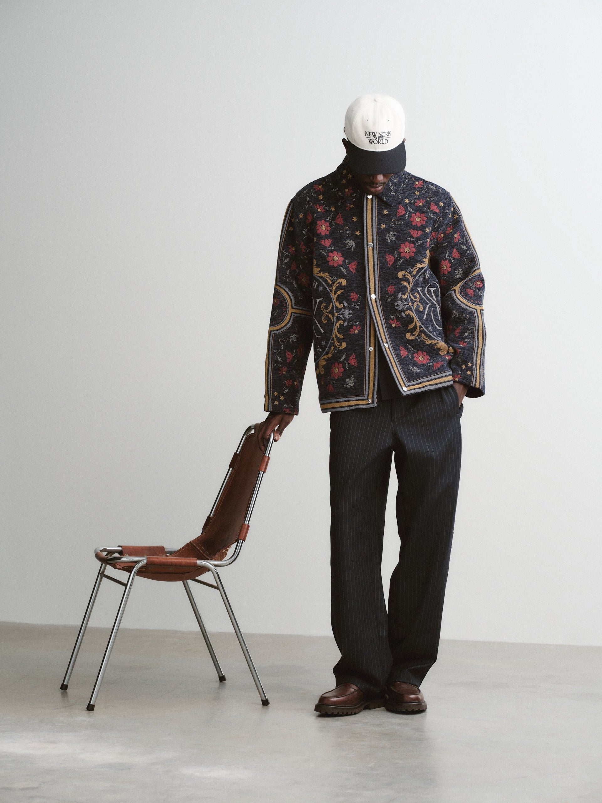 Each piece of artwork seen throughout this assortment is designed with meticulous attention to detail, some Motifs hand-drawn like the landscape seen on the Scenic Boxy Collared Overshirt, and others laser-cut and printed such as the Isaac Microsuede Buttondown. Motifs are seen on an array of jackets, tops, bottoms, and accessories.
