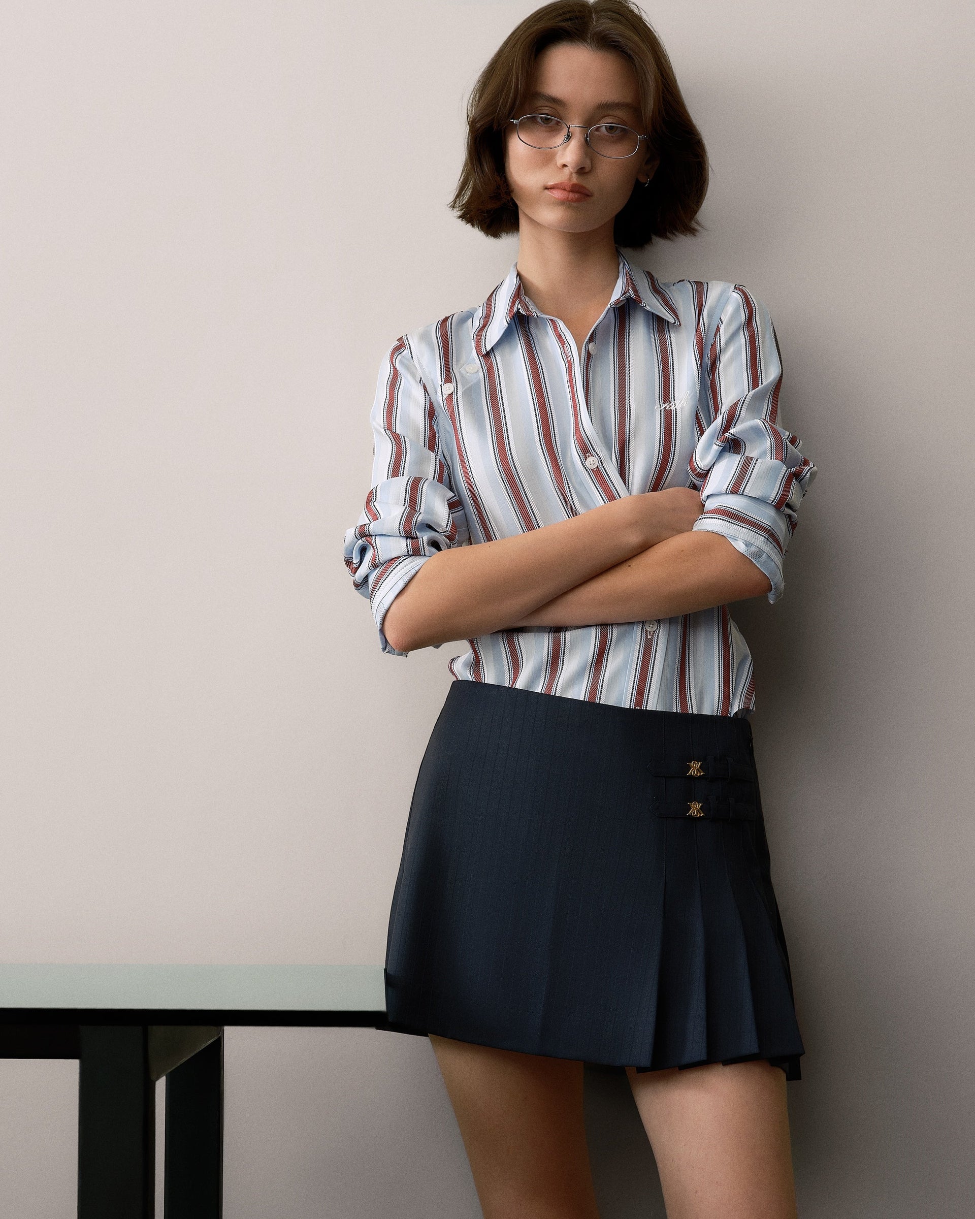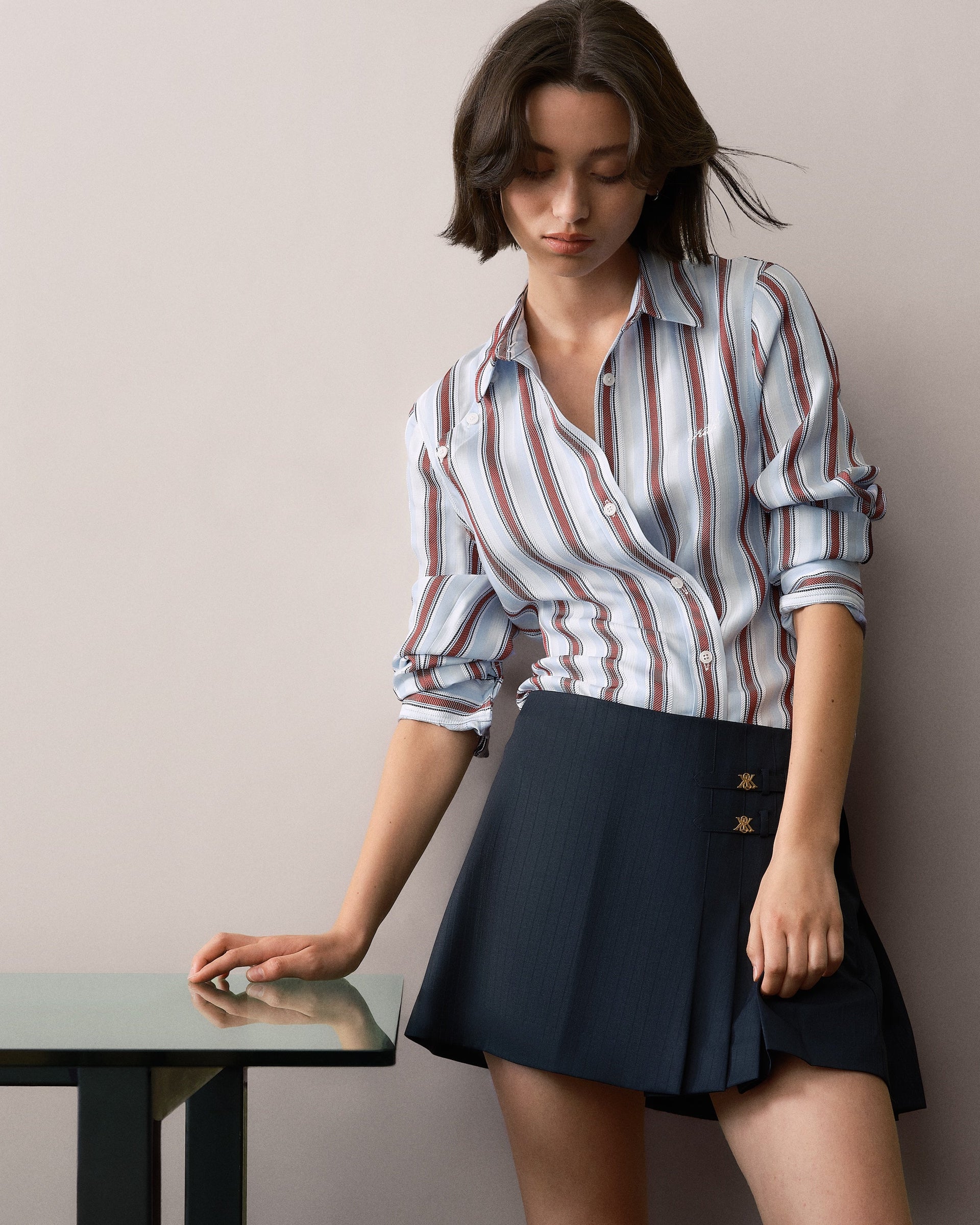 Explore standout suiting-inspired silhouettes such as the Sidney Stripe Asymmetrical Shirt, made of a viscose stripe jacquard, the Ora III Sweater Shirt, crafted of shadow double-stripe twill, and the Emira Pleated Micro Skirt, complete with buckle tab detailing and a pleated composition.