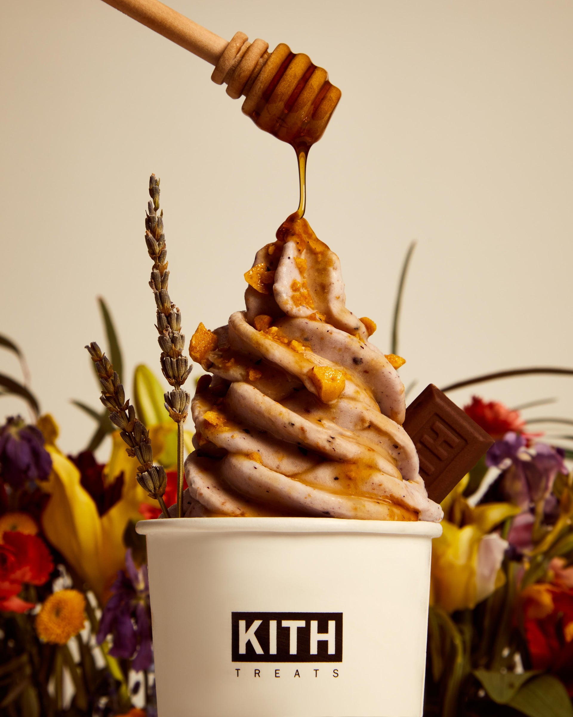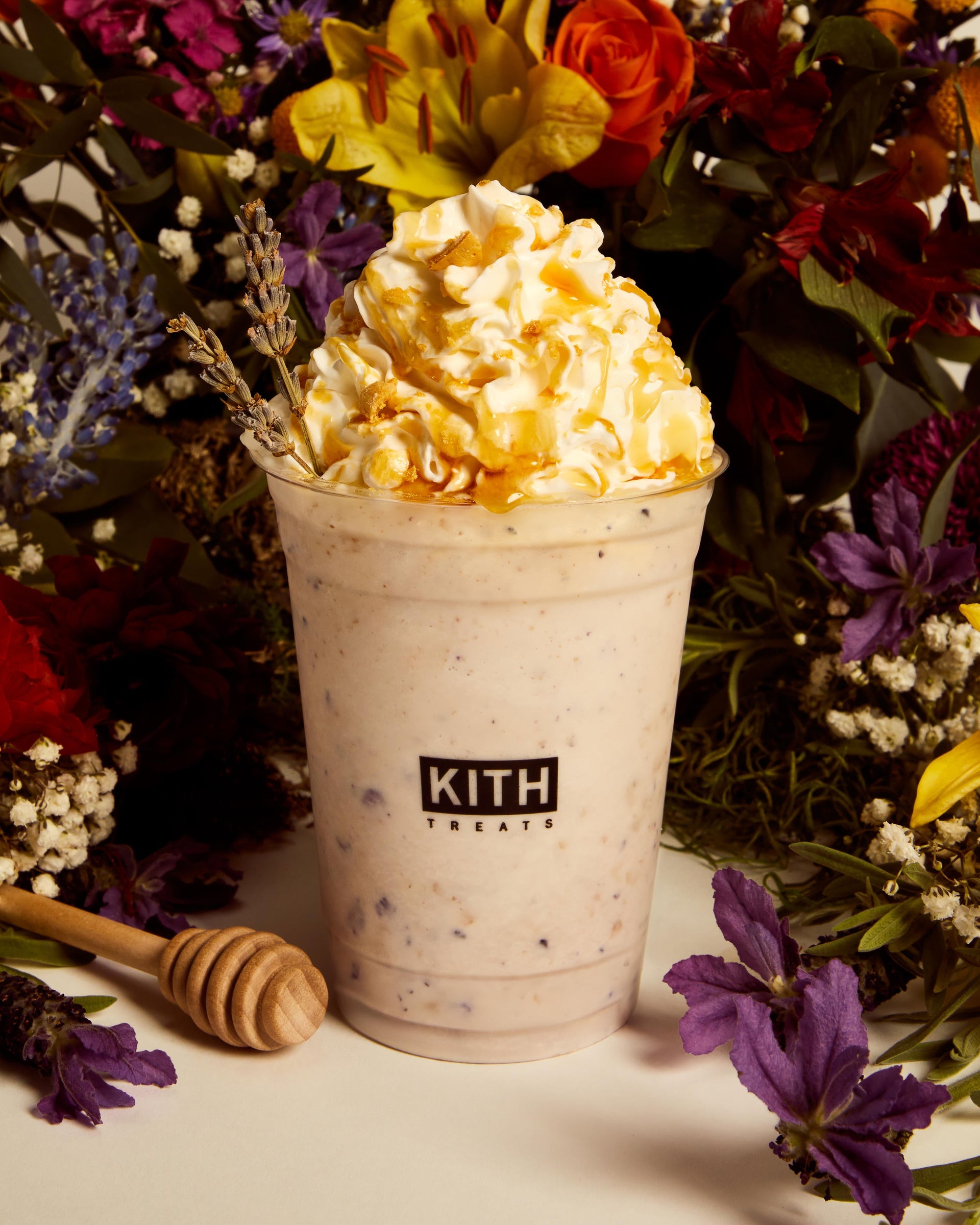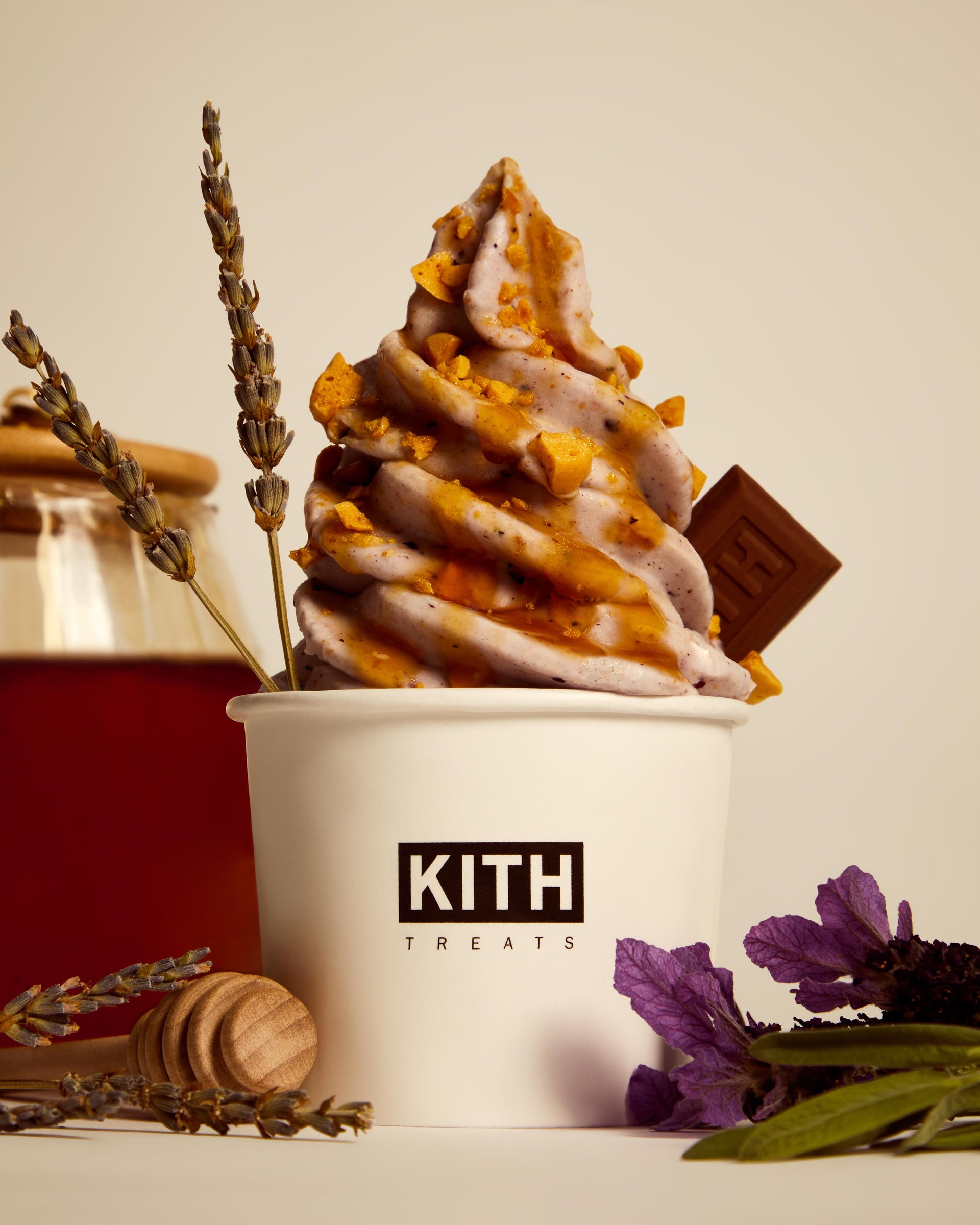 Alongside the release of Treats Honey II, Kith Treats has crafted a limited-time offering inspired by the capsule’s illustrative graphics. This fragrant, springtime dessert is infused with flavors of vanilla, lavender, blueberry & honey, creating a rich yet refreshing taste profile.