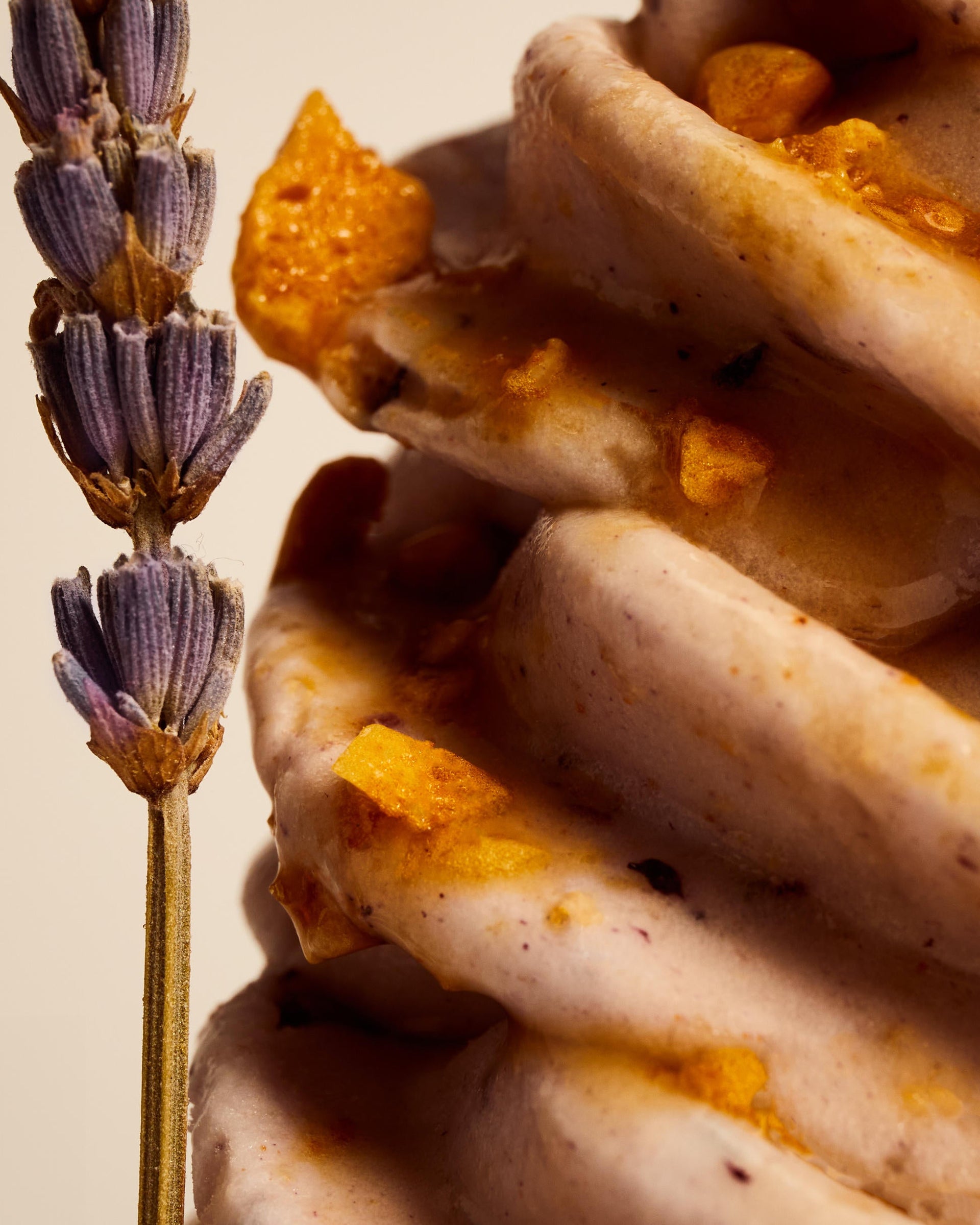 Kith Treats vanilla ice cream infused with Cheerios Oat Crunch, Honey Bun, lavender milk tea & blueberries, topped with crushed dalgona (honeycomb) candy, garnished with aromatic lavender and finished with a 100% pure honey drizzle.