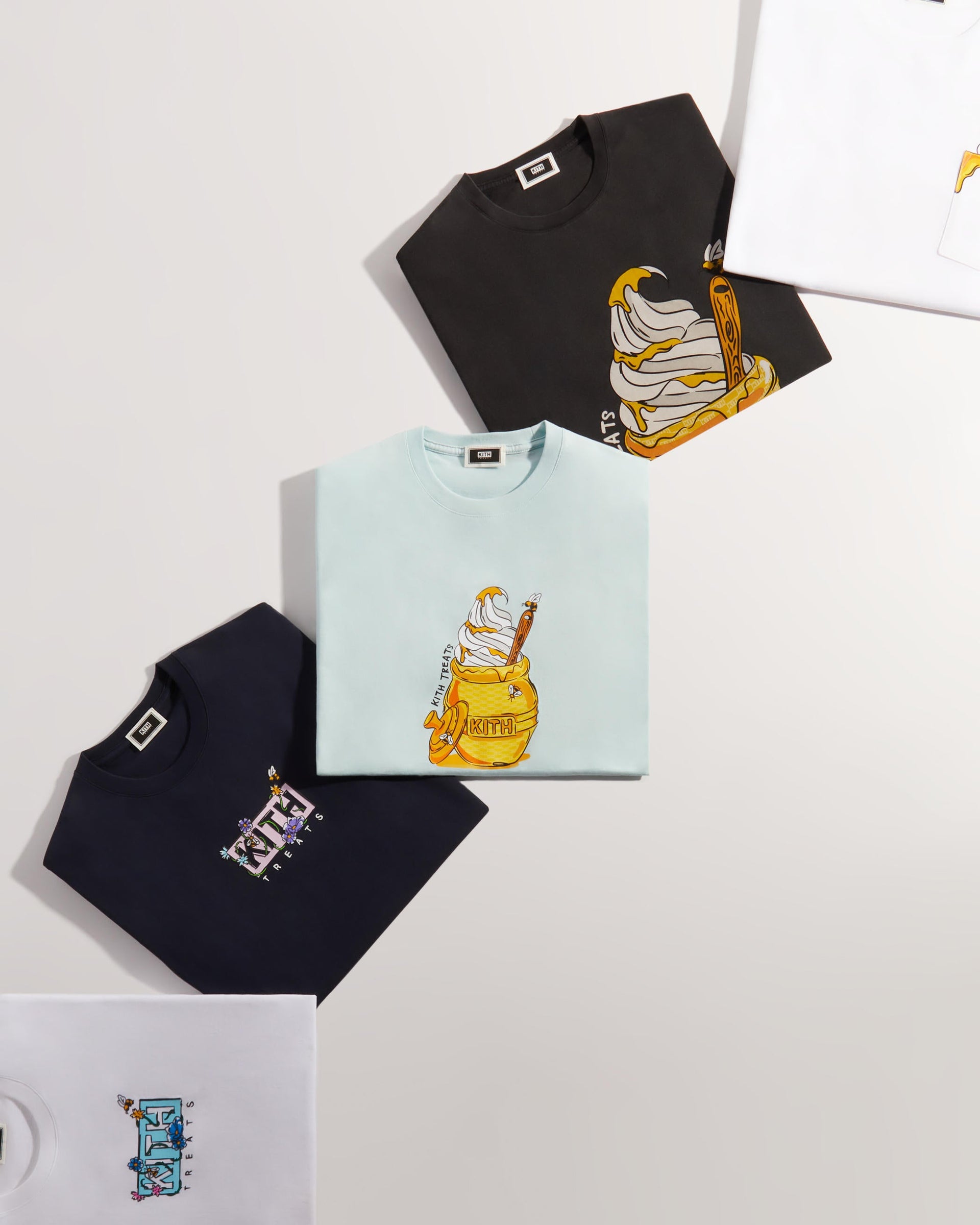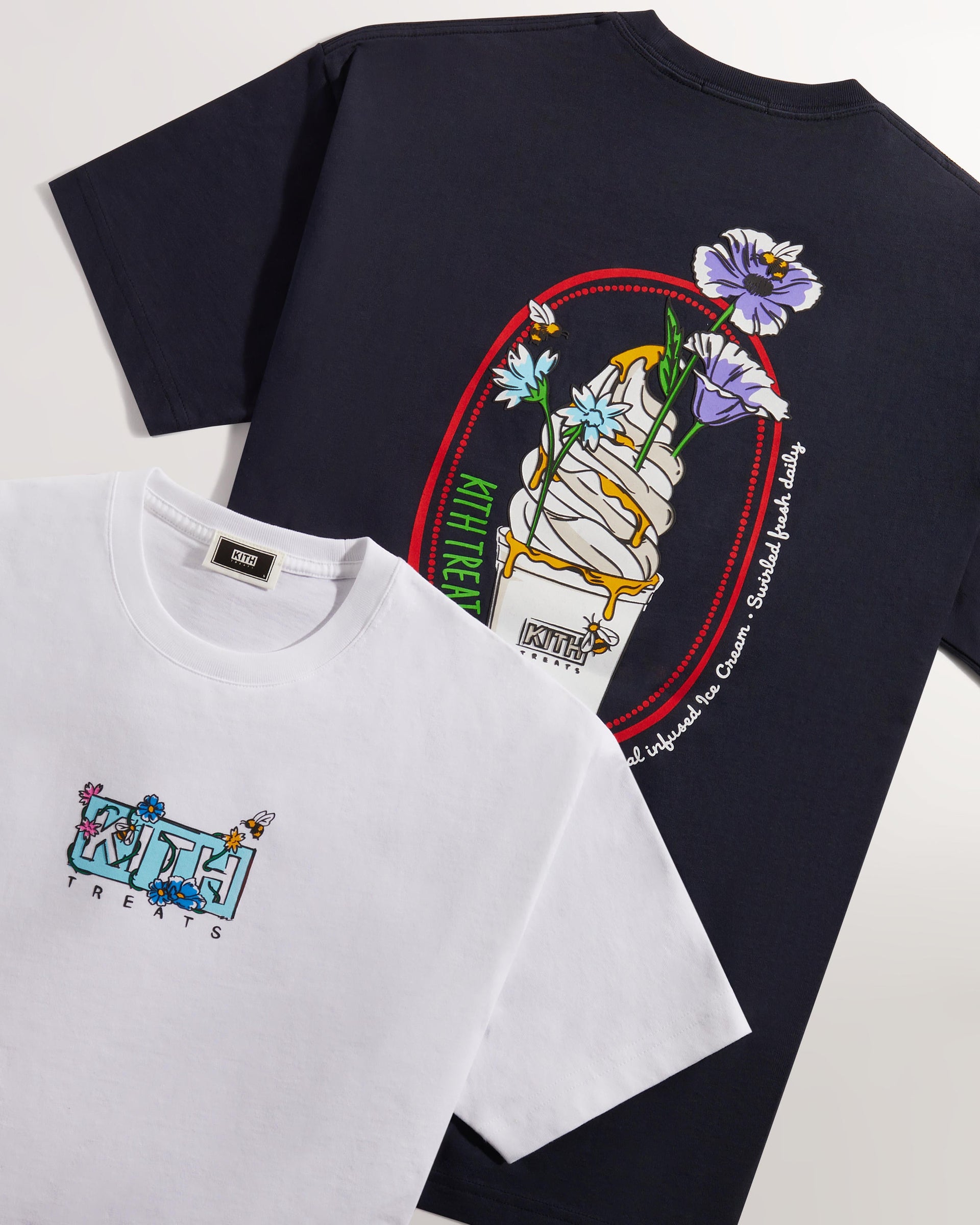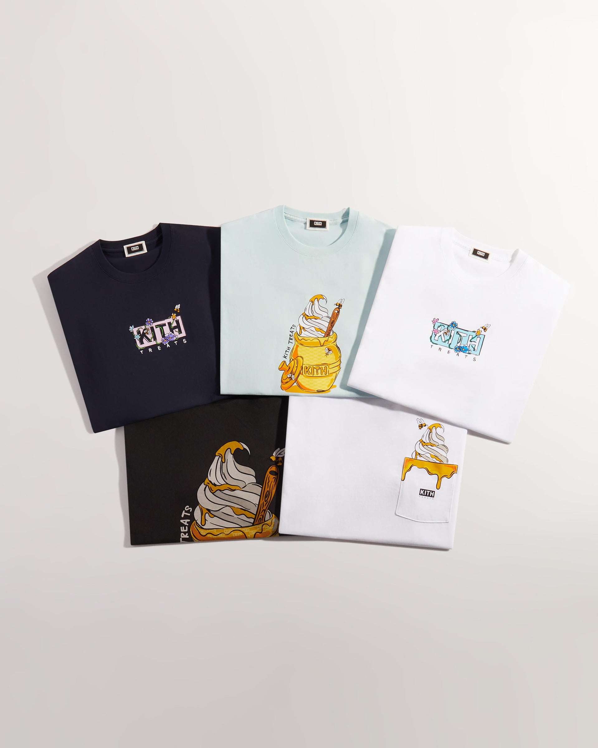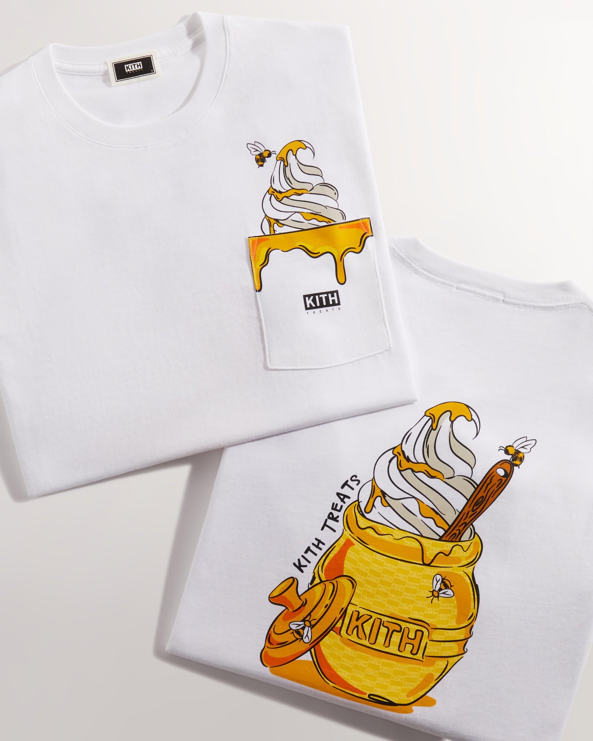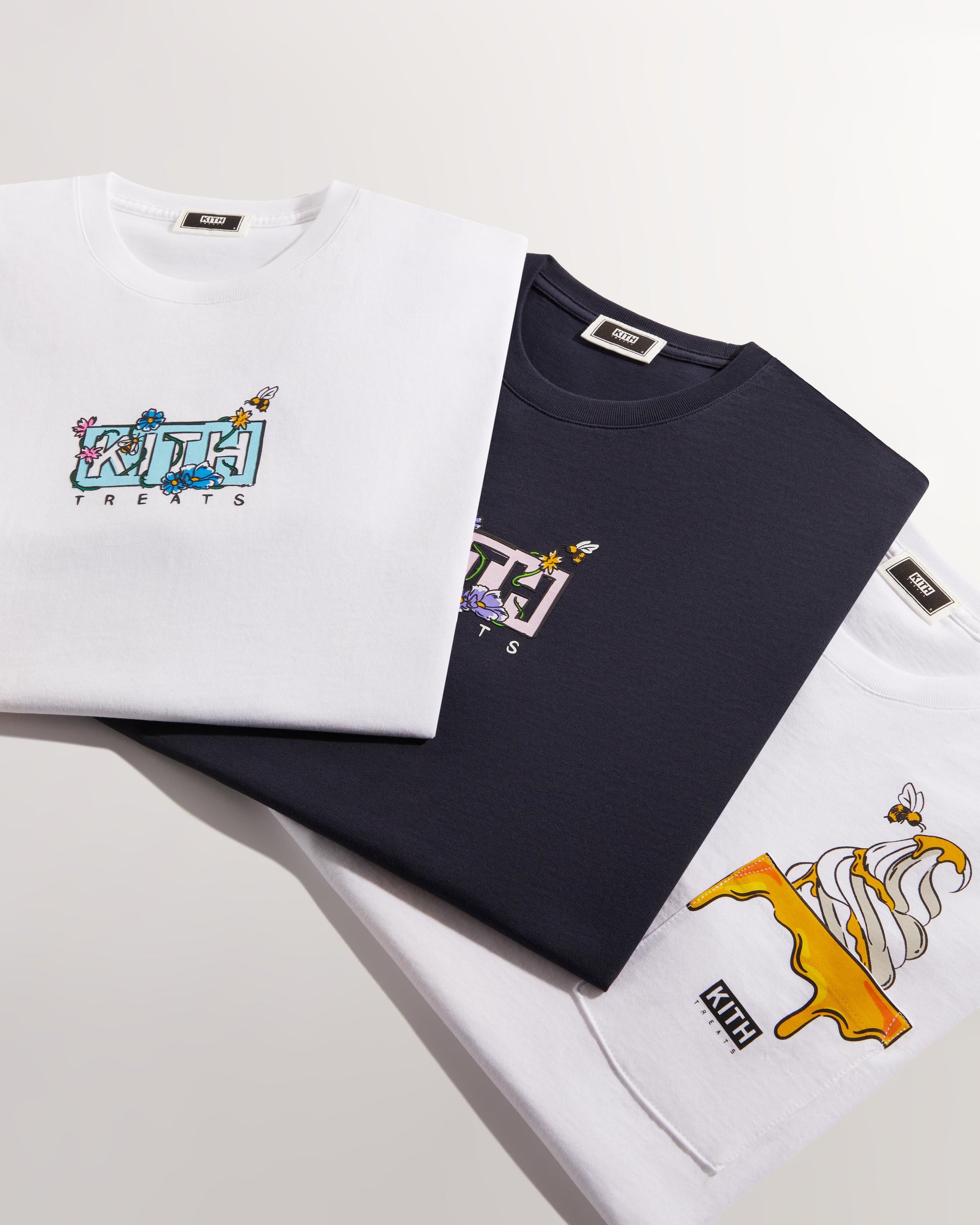 Kith Treats presents its second installment of Treats Honey—a five-piece capsule inspired by the pairing of its signature cereal-infused ice cream and nature’s golden nectar. The apparel assortment showcases three colorways of Kith’s vintage tee silhouette adorned with custom monogram honey pot graphics and illustrative floral wordmarks.