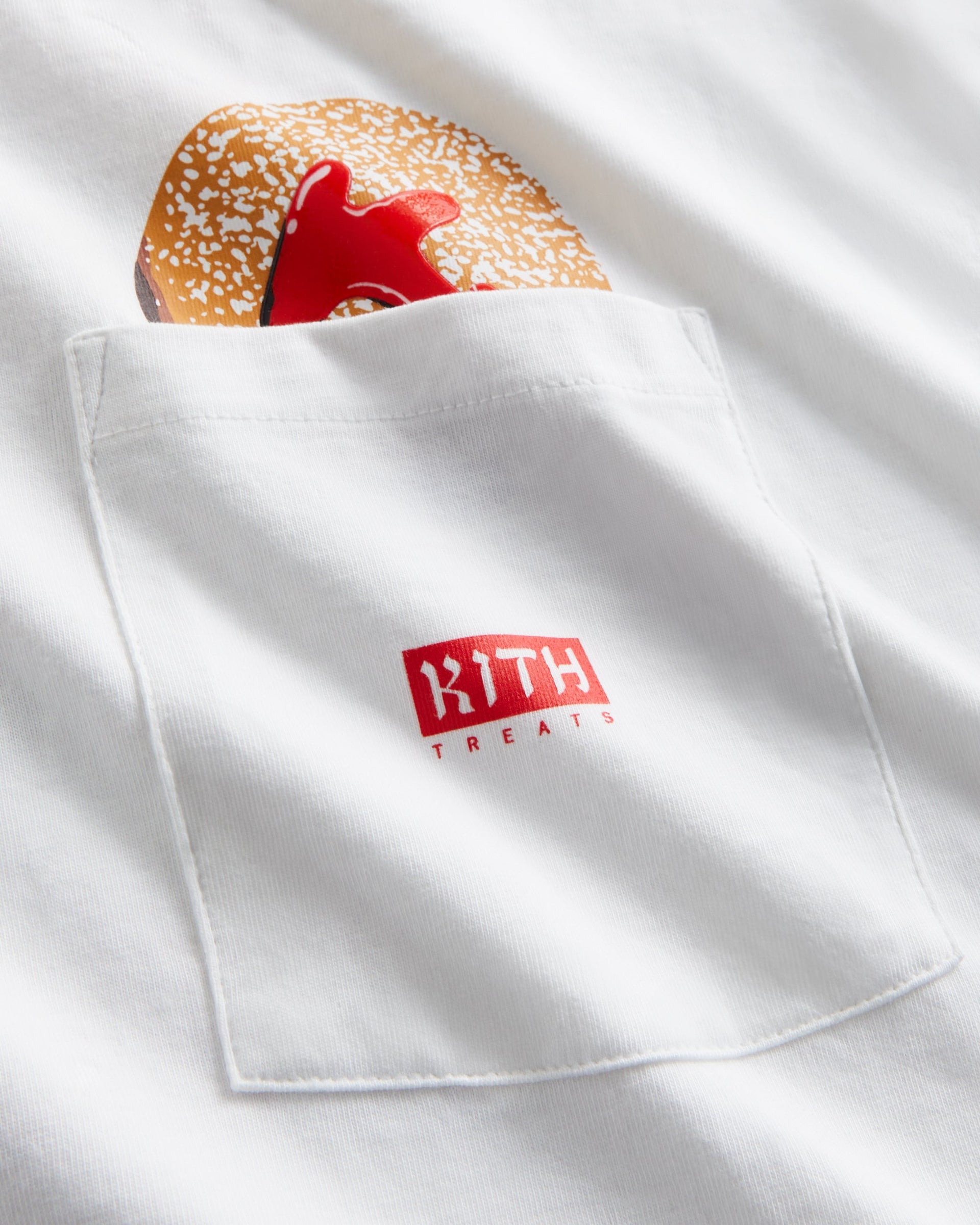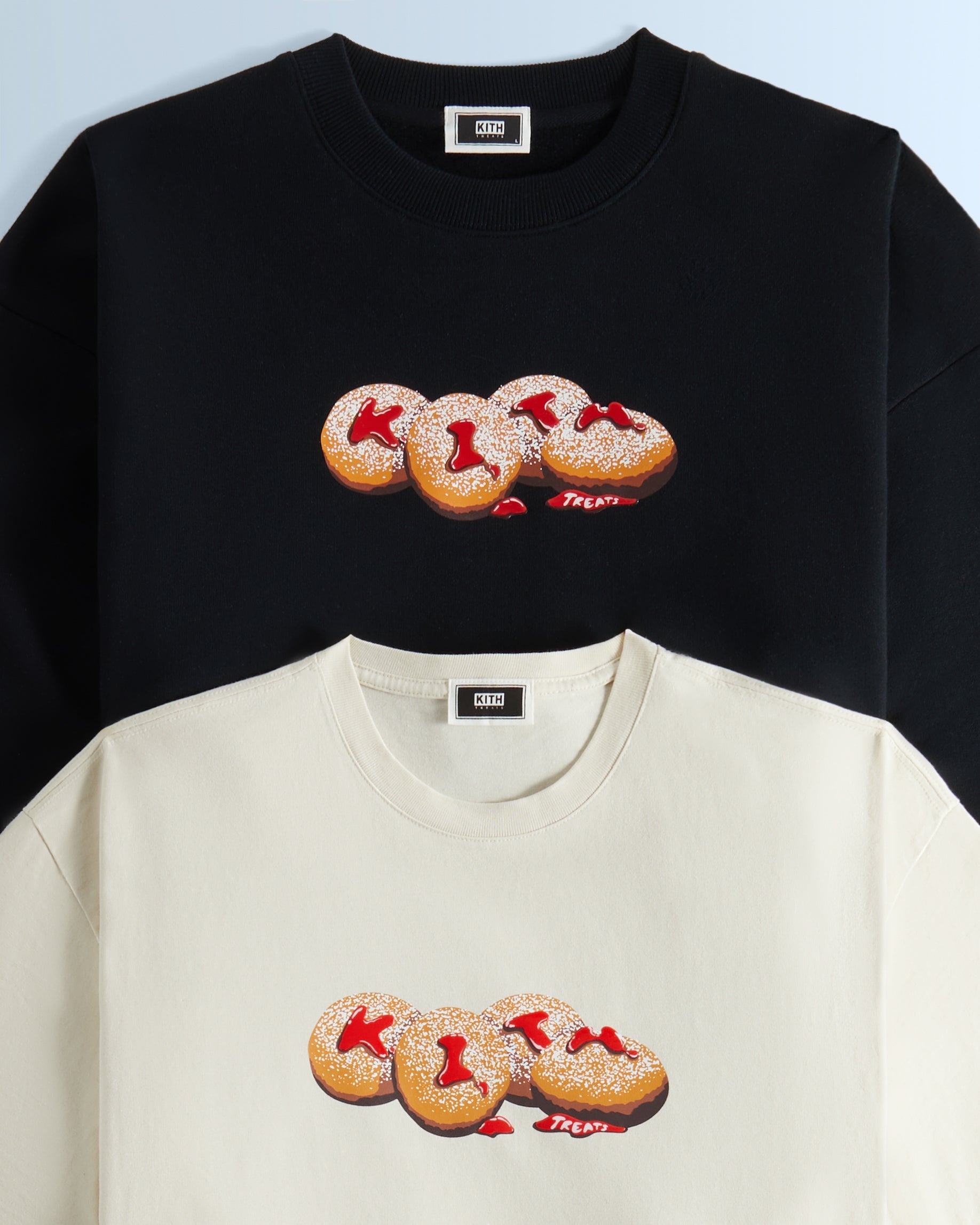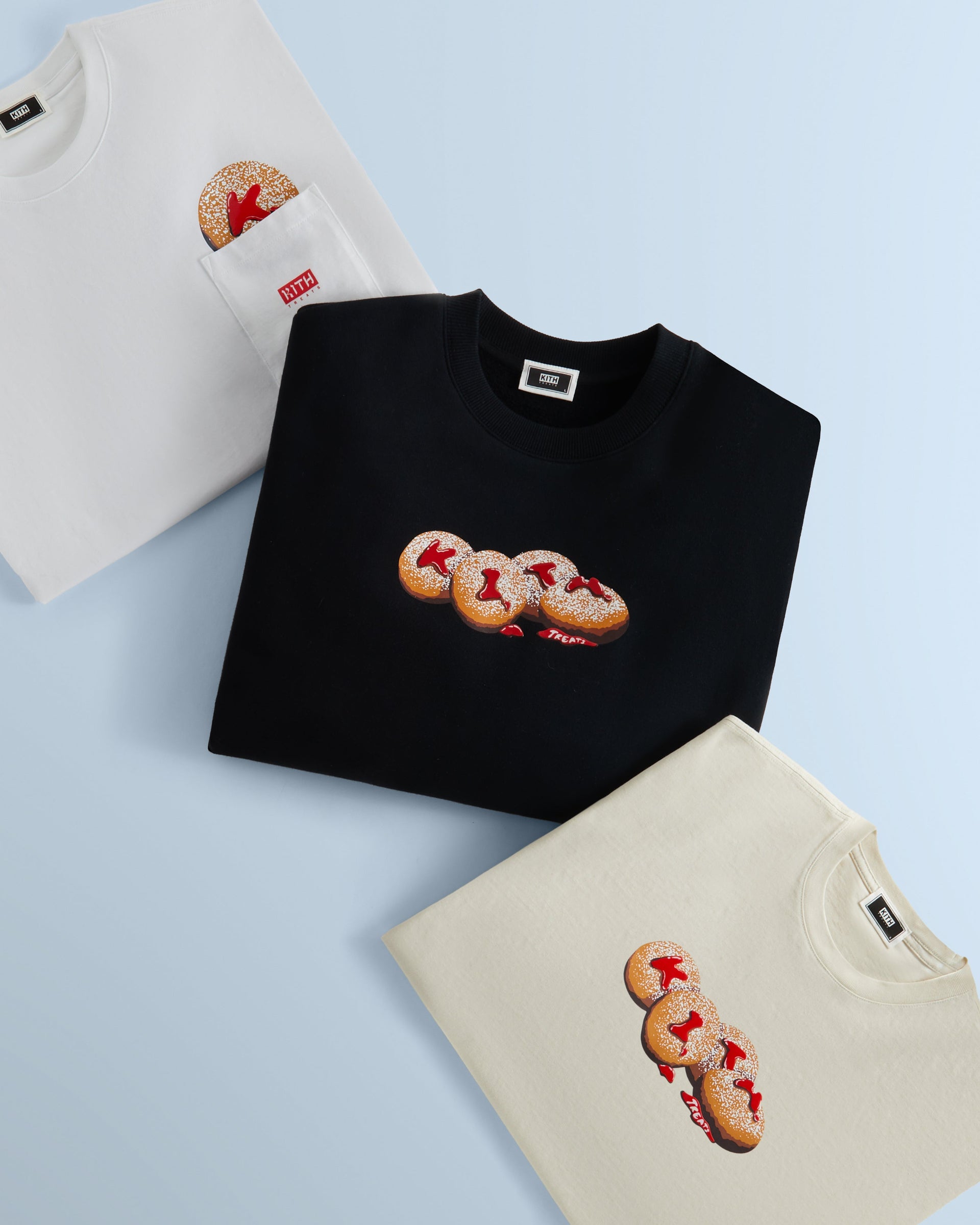 The Treats Jelly Doughnut collection sees Kith's signature cotton tees and Nelson Crewneck adorned with custom gel applique & puff print lettering in the shape of the beloved jelly-filled doughnuts. Each style arrives in Kith Treats' signature cereal box packaging with artwork from the collection.