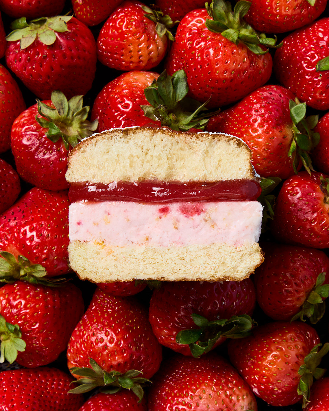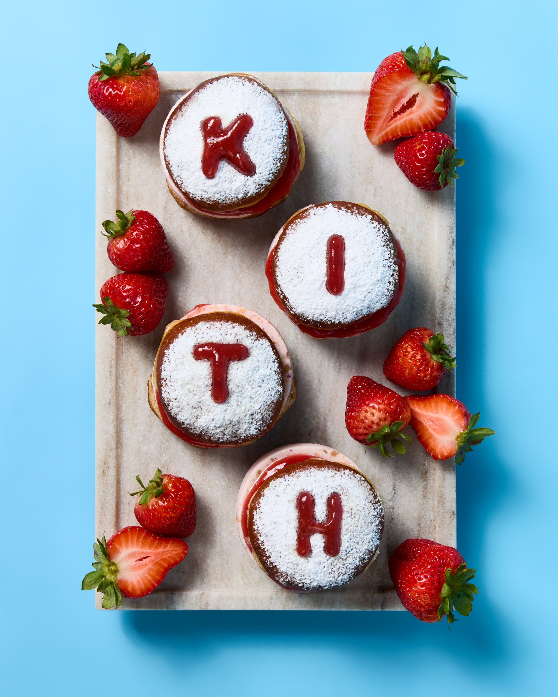 Kith Treats vanilla ice cream infused with Frosted Flakes, Toffee Crunch & Strawberries, sandwiched between a freshly-made Doughnut Plant doughnut lined with Doughnut Plant’s strawberry jam and topped with powdered sugar. Each novelty is finished with a letter “K” in strawberry jam.