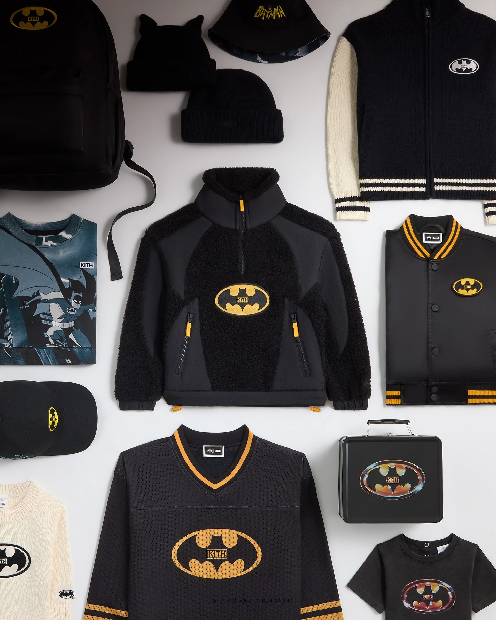 Shop the accessory assortment from Batman | Kith, comprising seasonal and staple headwear with custom artwork, collectible keychains, and the novelty 25-Pin Set