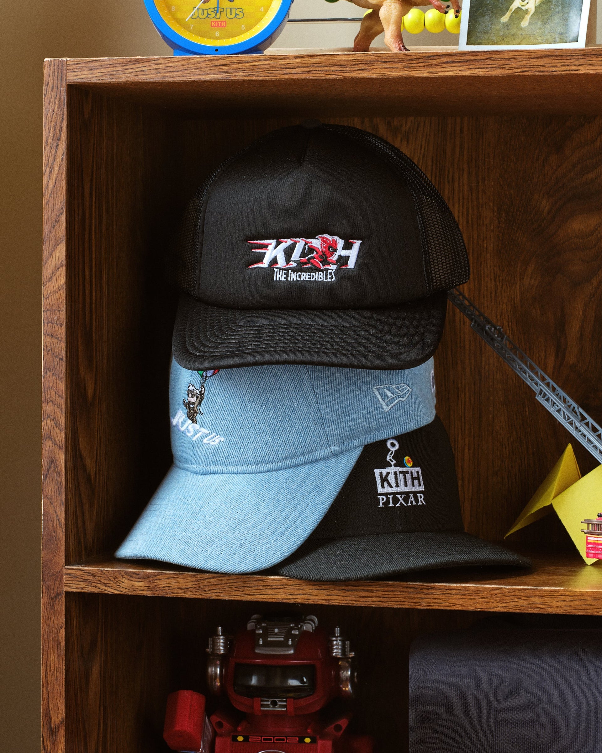 Accessories for Kith Kids are led by the Mia Beanie and signature headwear silhouettes such as the 9TWENTY Classic Hat designed with New Era and the Nolan Trucker Hat, each accented with Kith and Pixar embroidery. Shop everyday staples such as lunch boxes featuring Up and Toy Story artwork, as well as clocks equipped with sweep quartz movement and an alarm function, finished with graphics inspired by Disney’s Pixar.
