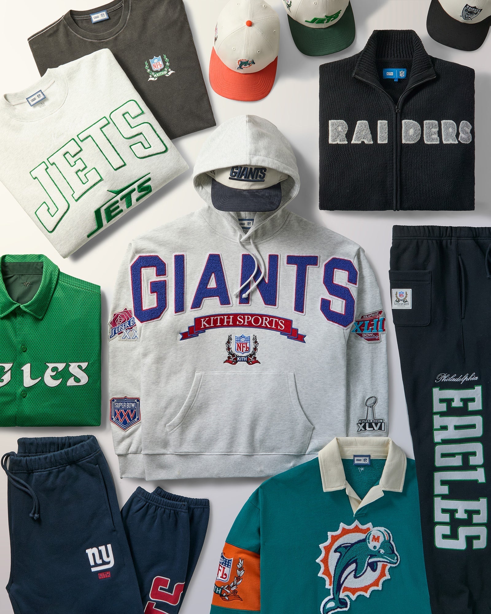 Designed with heritage sportswear manufacturer ‘47, shop Kith & ‘47 for the NFL. Comprising Kith staple loungewear silhouettes, retro outerwear silhouettes, premium vintage tees with custom artwork, and team-branded headwear, discover the complete assortment highlighting the Giants, Jets, Eagles, Raiders, and Dolphins.