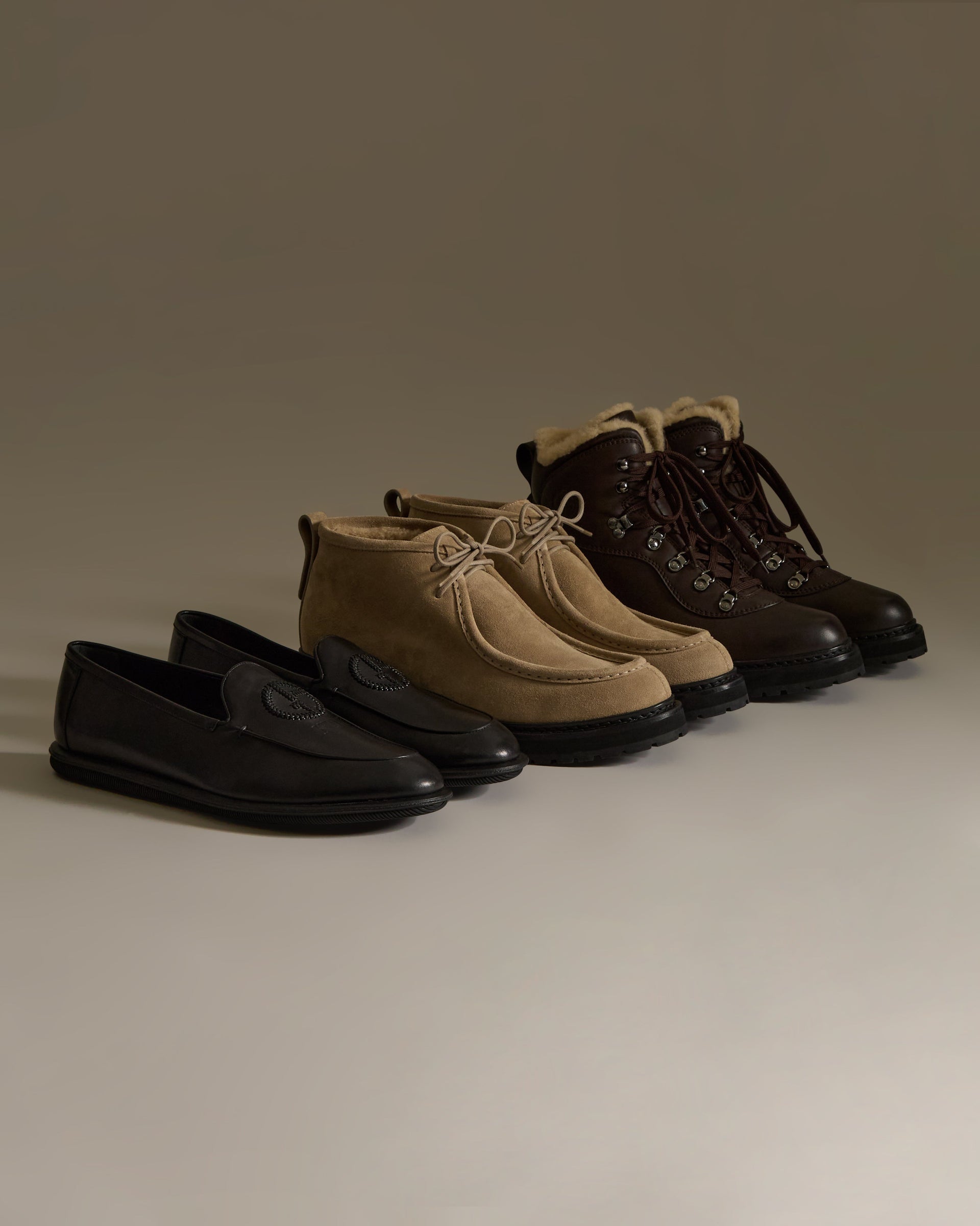 Made of premium Italian leather and suede, the Hiker and Chukka Boots are designed with durable leather-welted outsoles, shearling linings, and custom Kith & Giorgio Armani branding elements throughout. The Loafer is highlighted by a braided Giorgio Armani emblem, complete with Kith debossing.