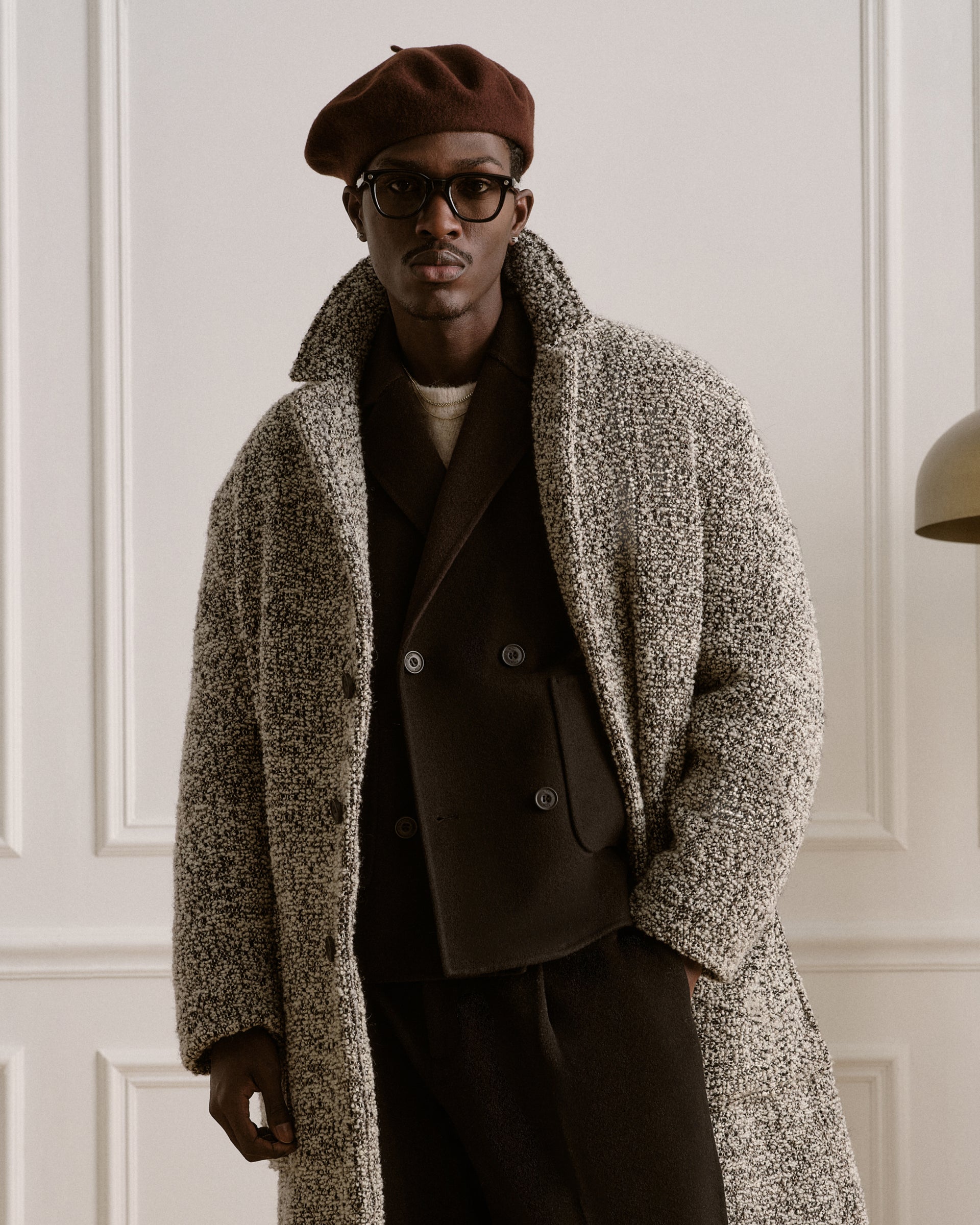 Suits designed with Giorgio Armani, comprising a selection of double-breasted blazers crafted from virgin wool and paired with shirts, tailored trousers, and pure silk jacquard ties in two seasonal colorways. The collection also includes versatile tailored outerwear, such as the Bergen Coat, Jacob Coat, Raya Blazer, and Julius Blazer, featuring intricate textures and distinctive patchwork detailing. Complementing the range are tailored trousers in premium wool blends and brushed jersey, including the Elmhurst and Bentley silhouettes.