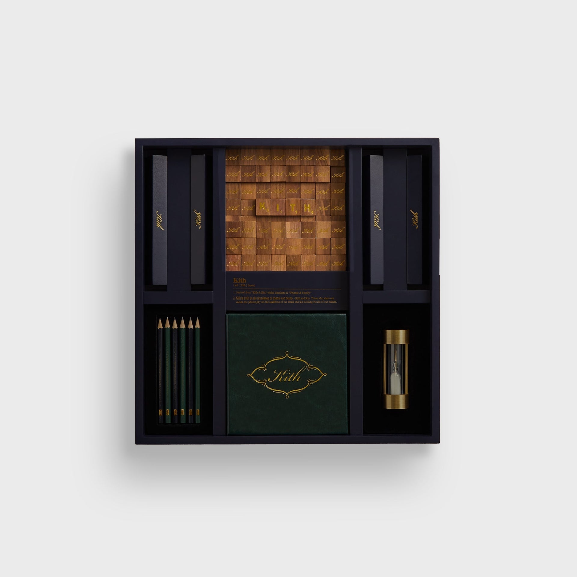 The Kith for Scrabble Board Game is a custom-designed playing set featuring a rotating vegan leather game board with grid accents from the Kith color palette. Complete with a luxe gold-tone trim, foil-stamped tile racks and Kith-stamped walnut letter tiles.Kith for Scrabble Board Game