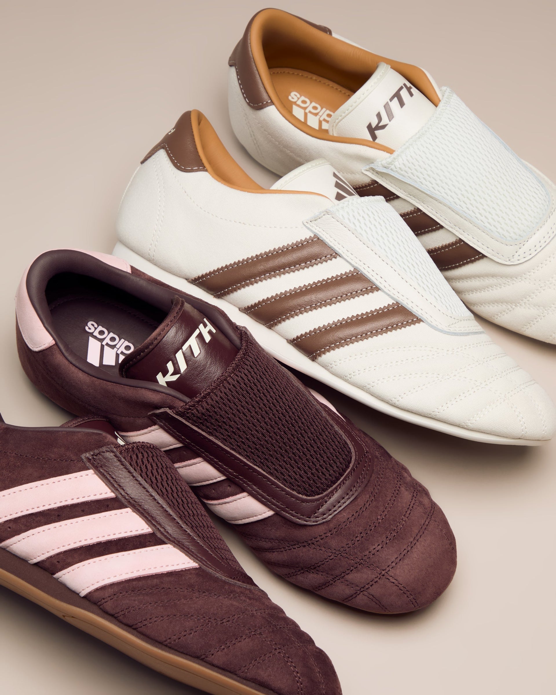 Kith and adidas reprise their partnership to introduce the latest collaborative Taekwondo silhouette, designed in two color-blocked hues—Natural Canvas & Coffee Quartz made of durable canvas, and Shale & Corsage made of premium suede. Each pair features alternating Kith and adidas branding on the left and right, a breathable mesh tongue, and classic Tri-Stripe overlays in contrasting colors.