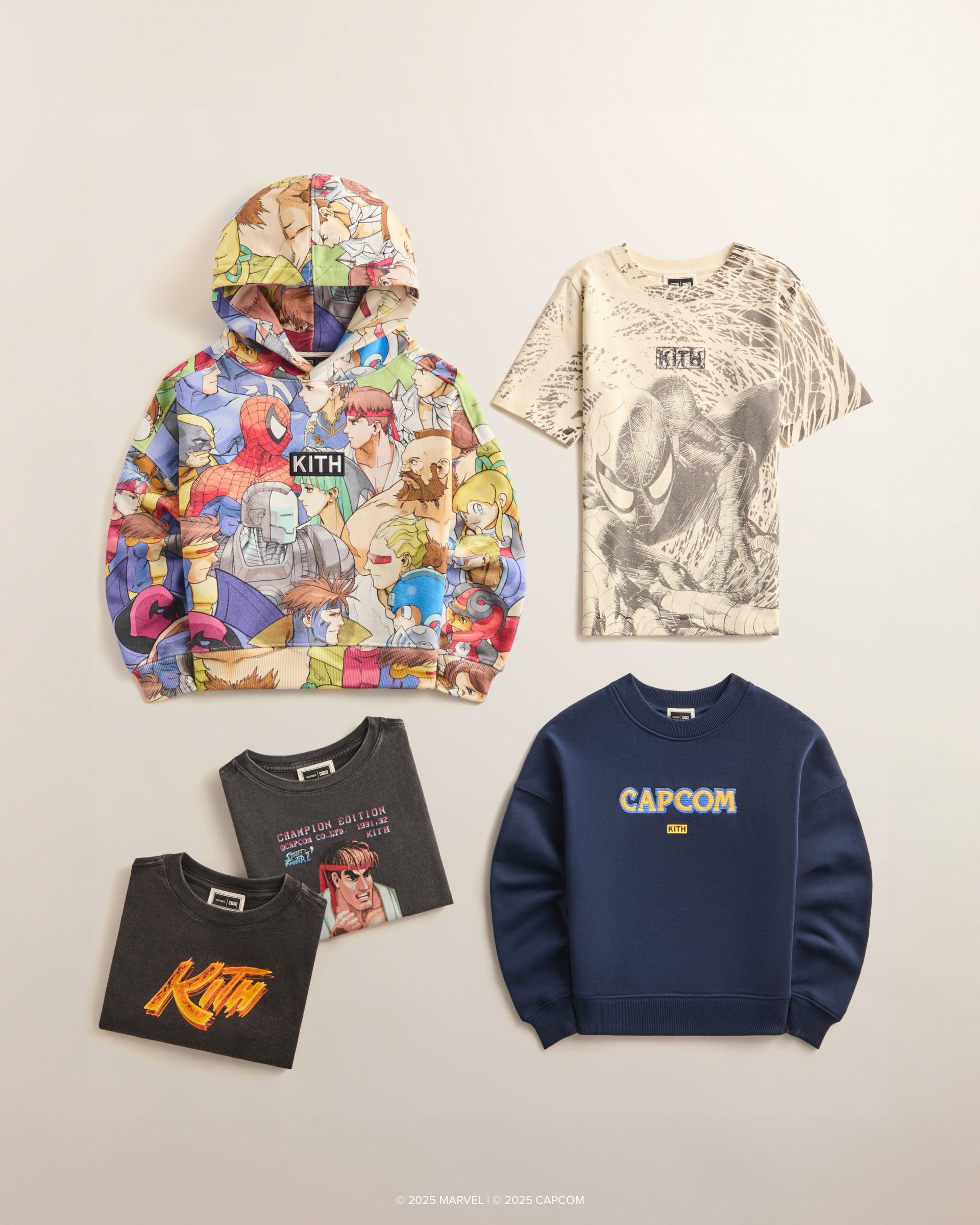 Kith Kids presents a collection of graphic tees alongside the Nelson silhouette offered in both crewneck and hoodie iterations. Each piece features artwork inspired by retro arcade titles like Street Fighter and The Clash of Super Heroes, alongside styles from the Marvel and Capcom universes, complete with Kith branding. Each style is crafted from premium fabrications, such as ultra-soft brushed fleece and vintage-washed cotton jersey, delivering a refined yet comfortable hand-feel.