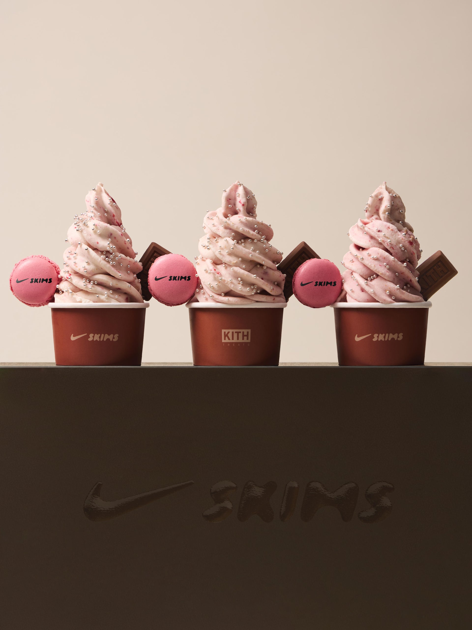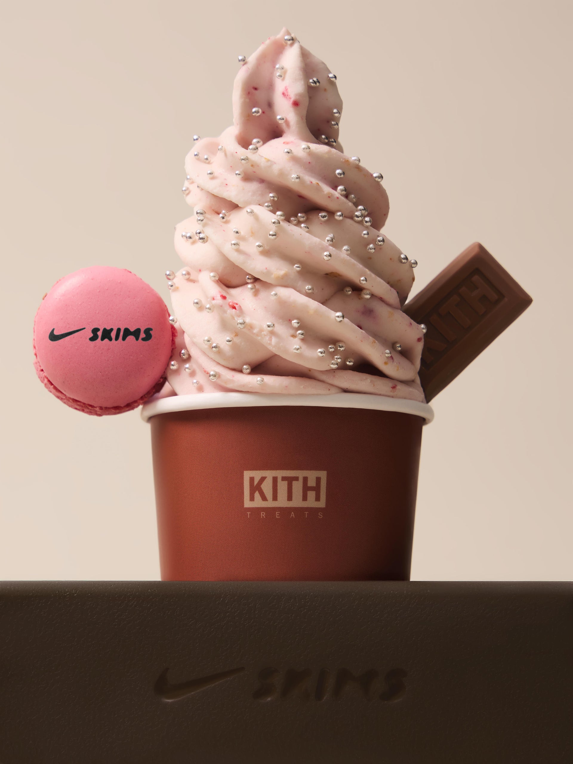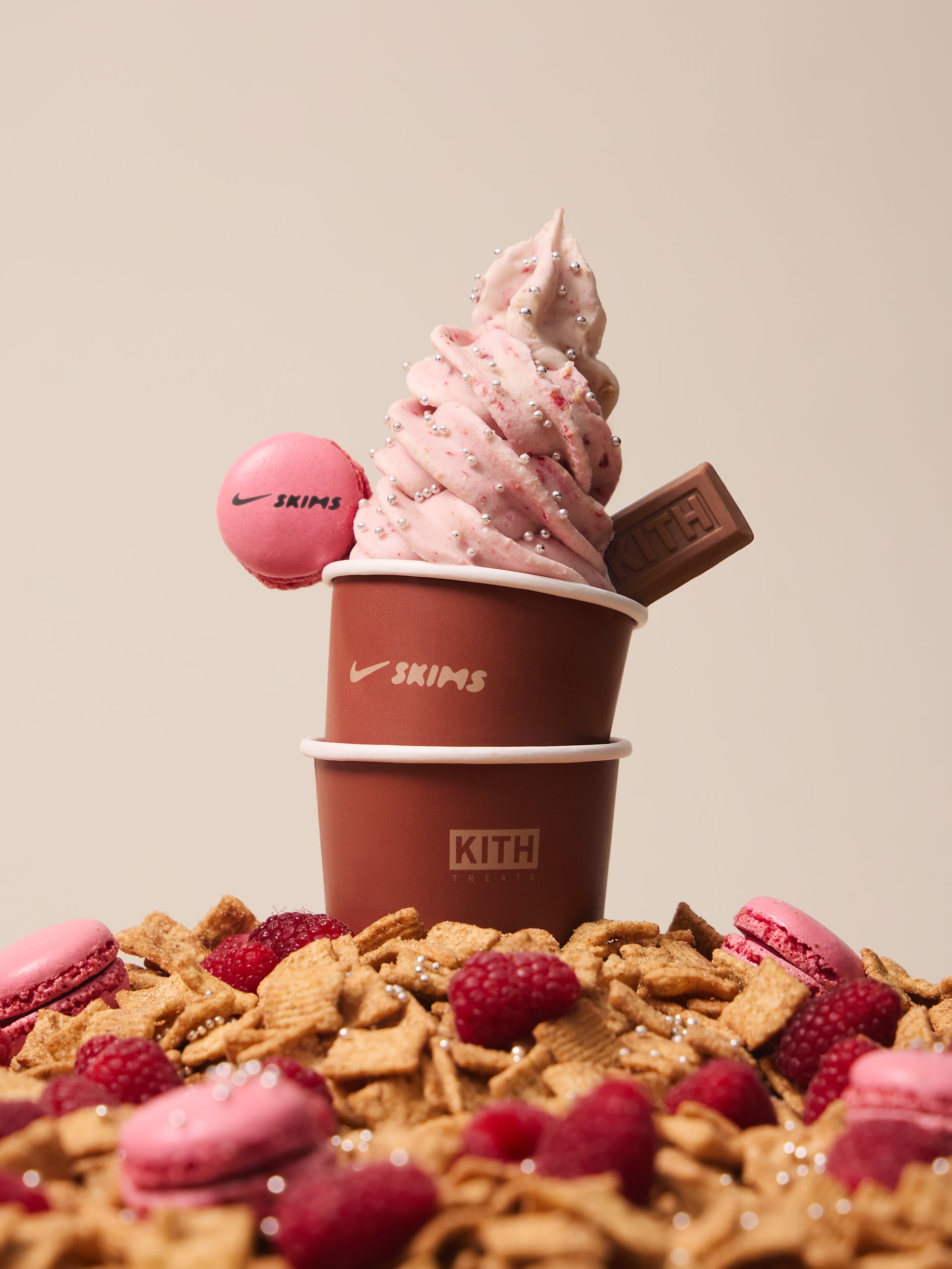 Kith Treats vanilla ice cream infused with Raspberries & Cinnamon Toast Crunch, topped with Silver Pearl Sprinkles and garnished with a Raspberry NikeSKIMS Macaron