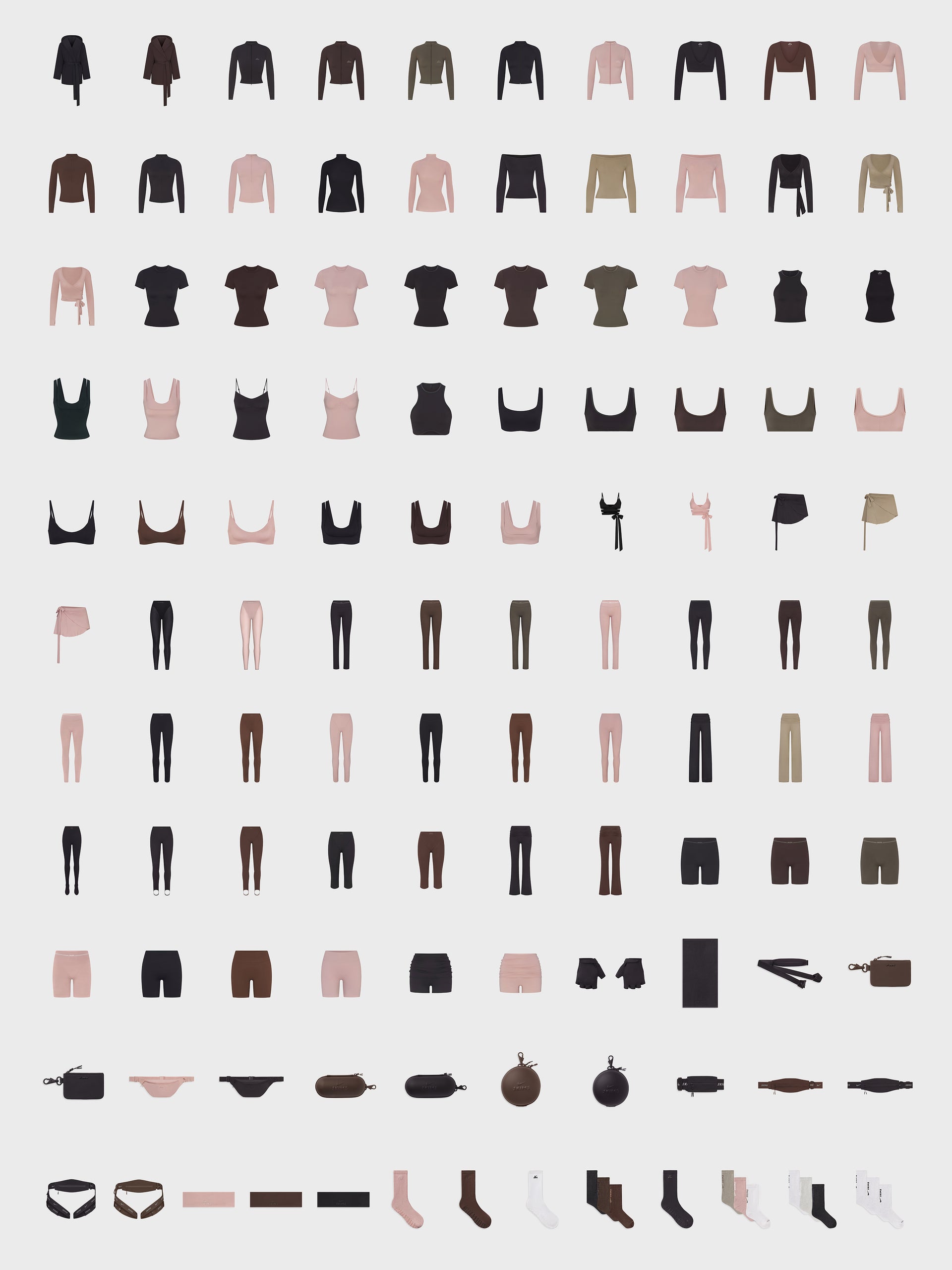 Materials engineered exclusively for NikeSKIMS highlight the apparel collection, including smooth, sculpting matte Dri-Fit with two levels of compression, sleek, stretchy shine with quick-dry technology, and a semi-sheer, lightweight weightless blend. Explore staple hues such as Obsidian and Dark Sepia, alongside the introduction of Himalayan, a baby pink ideal for springtime layering, seen on bras, tops, leggings, shorts, and accompanying accessories such as socks, workout equipment, and bags.