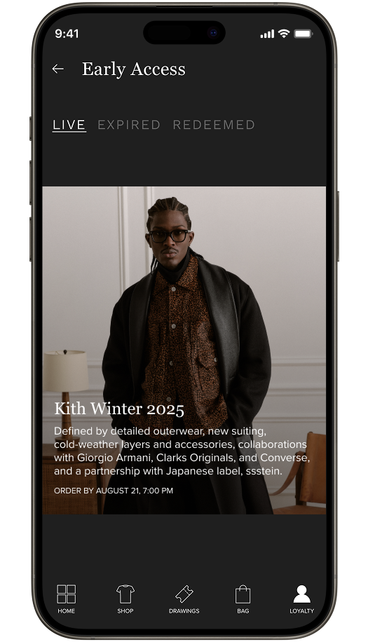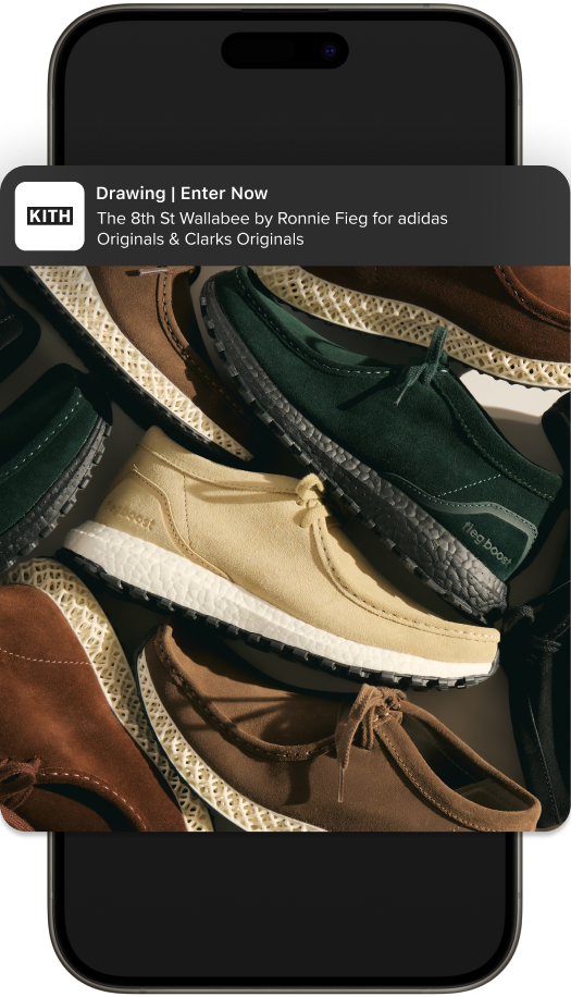 Enter exclusive drawings for a chance to secure anticipated footwear releases and attend Kith events. View all live and upcoming drawings in the Kith App.